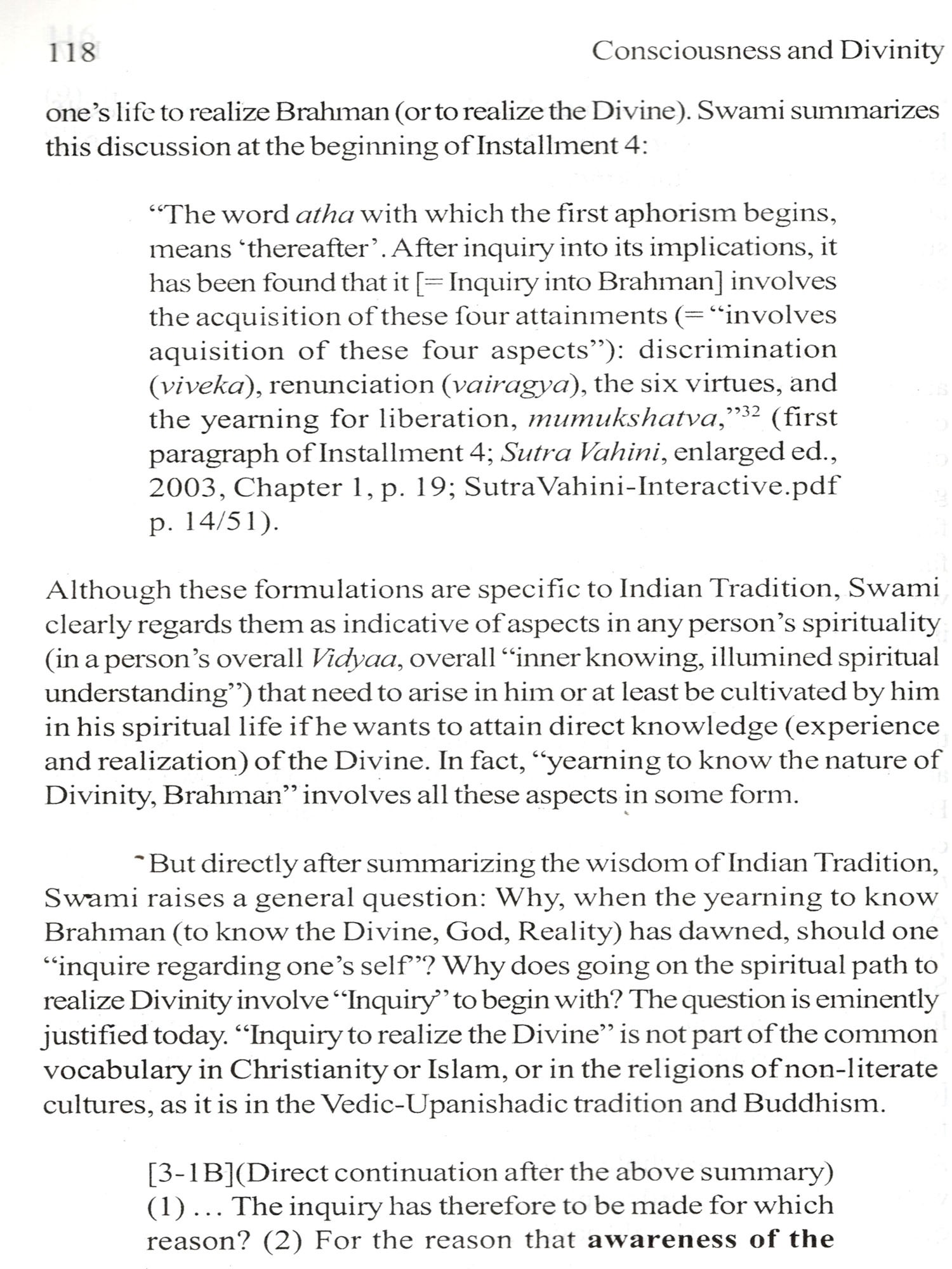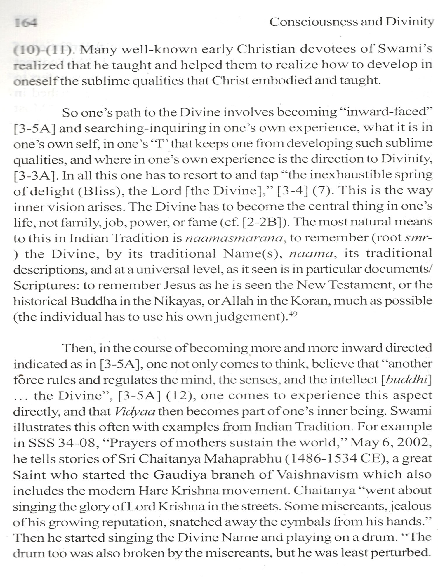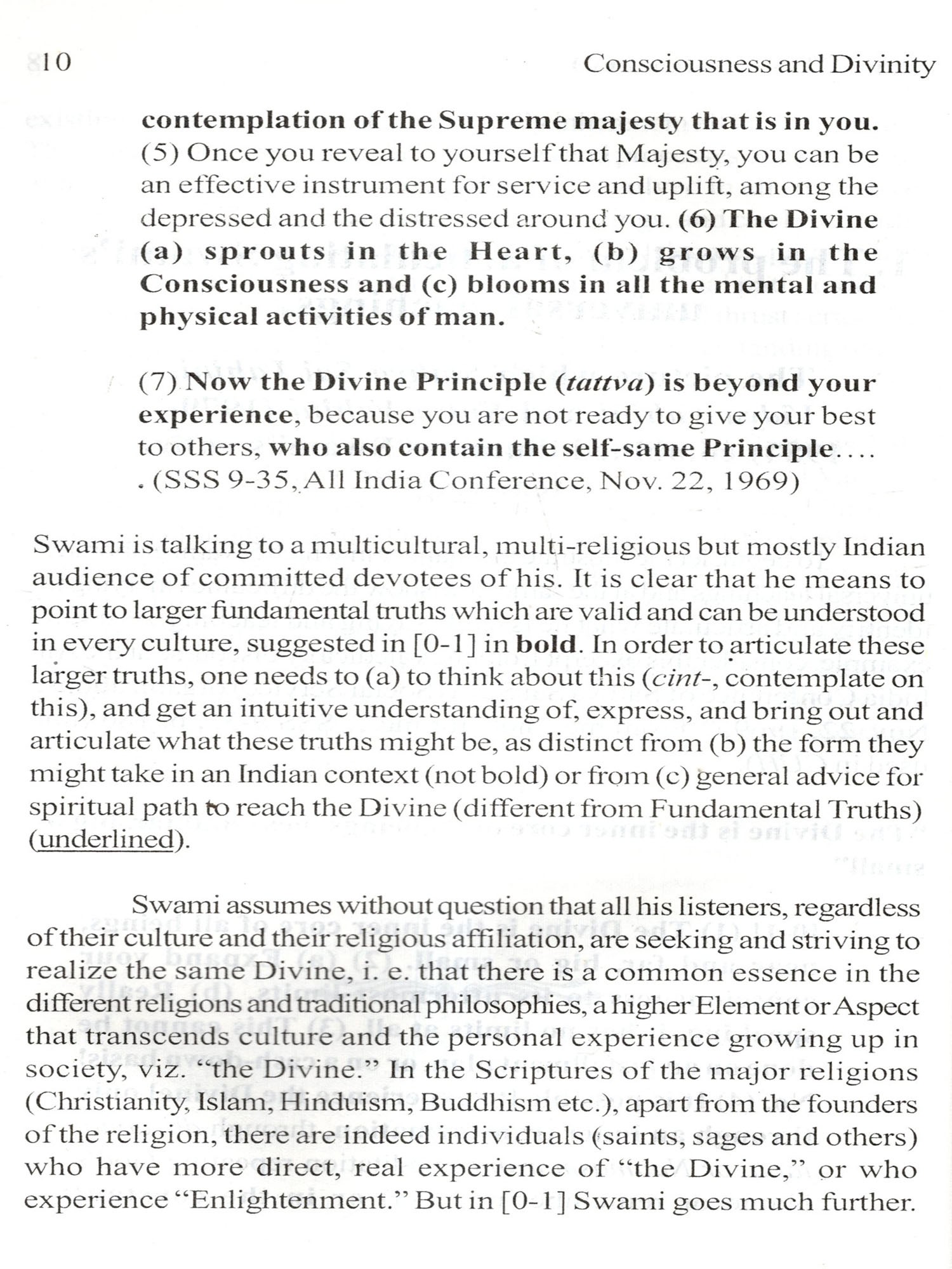 However, it is not so easy to articulate and communicate this universal self-standing vision/understanding. Swami teaches that human nature is Divine - Divinity or Divineness, Divyatvam ("that what is in essence Divine-ness"): "The same One Divine manifests in the constant daily experience of all human beings, in all cultures, religions, philosophies, arts." Here "Divinity" or "the Divine" includes not only the usual connotations of "the Divine" in the major religions, but also the higher ideals of truth and of "objective truth" that can be felt in Philosophy and Science, and the higher ideals expressed in Myth, community life and in Art in all (including non-literate) cultures and all societies. Swami teaches that this One Divine or Divinity "pervades," and is constantly (at all times) "present in" the daily experience of all human beings, but human beings are not aware of it. It is the "source of all consciousness," i. e., all consciousness experienced by human beings (and animals) is a manifestation of it. (E. g. it is "indissolubly knit together" with, "inextricably interpenetrative", avinaa bhaava sambandha, of all ordinary conscious beings in the world, cf. excerpt [3-5A] Section 8).