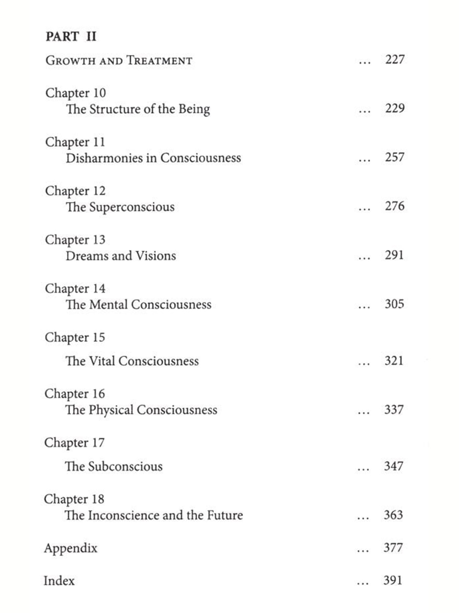 Part 2 addresses advanced topics in CBP, beginning with Sri Aurobindo's yogic map of the planes and parts of the being (Chapter 10), and his description of the levels and causes of dis-harmonies in consciousness (Chapter 11). Chapters 12-18 review the planes of consciousness from the Superconscous down to the Inconscient, with case studies of clinical problems that can arise at each level, plus practices for yogic growth and self-development. Note that in CBP growth is a fluid process in which both the client and clinician are evolving in consciousness across the lifespan, and each may be more developed in certain planes and parts of the being than the other at a given point in time. Thus, there is not a fixed division between growth and treatment, nor an assumption that the clinician has to be more "advanced" than the client. Finally, the Appendix contains an essay that examines how Western psychology and culture have unfairly pathologized mystics in the past, and explains why current diagnostic criteria for mental ill-ness now view spirituality as potentially healthy. This problem is illustrated with reference to misguided interpretations about the etiology of Sri Aurobindo's interest in mysticism.