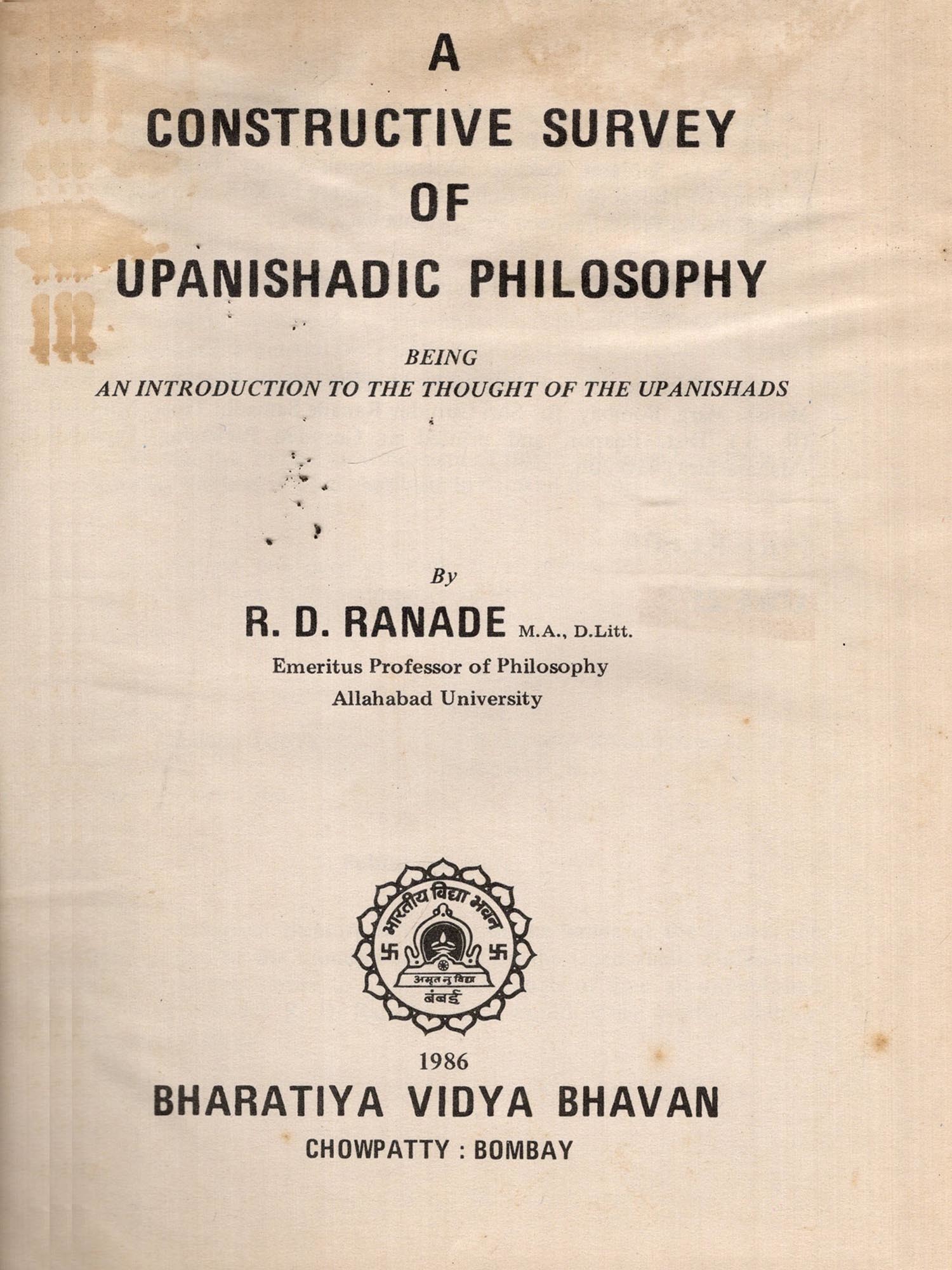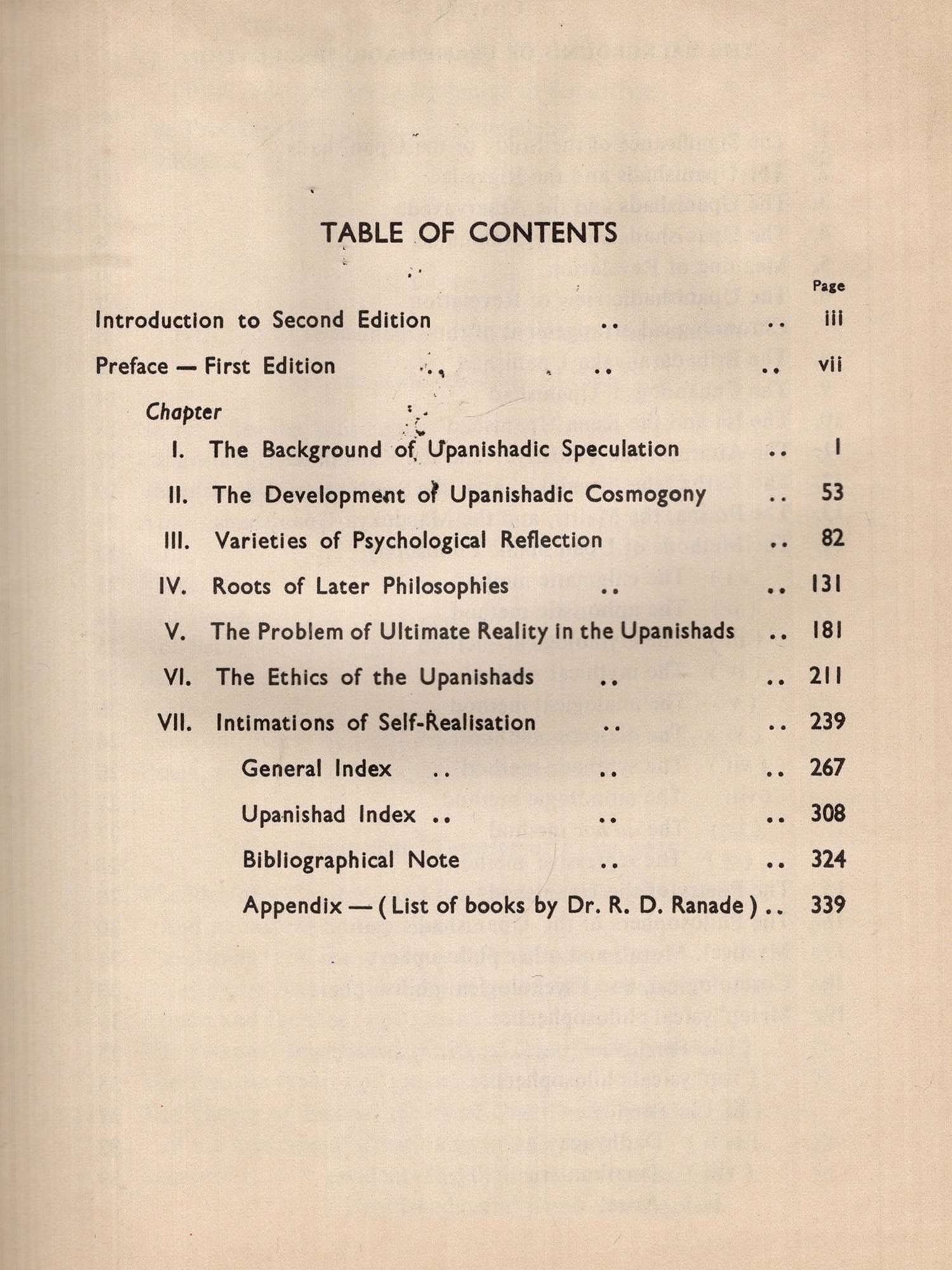 The lectures on the basis of which Dr. R. D. Ranade wrote the 'Constructive Survey of Upanishadic Philosophy' were delivered in 1915. The first edition of the book was published in 1926. It is out of print for the last few years. It is fortunate that now a second edition could be placed in the hands of readers.