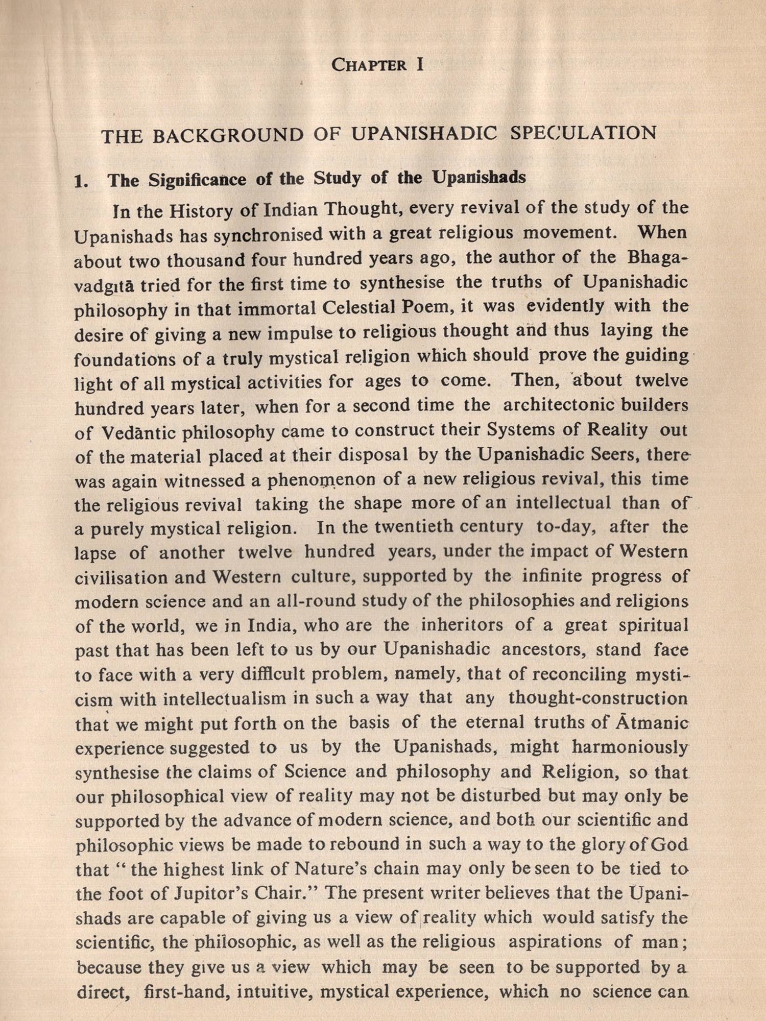 The Upanishads occupy a unique place in the development of Indian thought. They contain the roots of all systems of philosophy rising one upon another like the crests of the Himalayas culminating in a vision of the Absolute Reality.