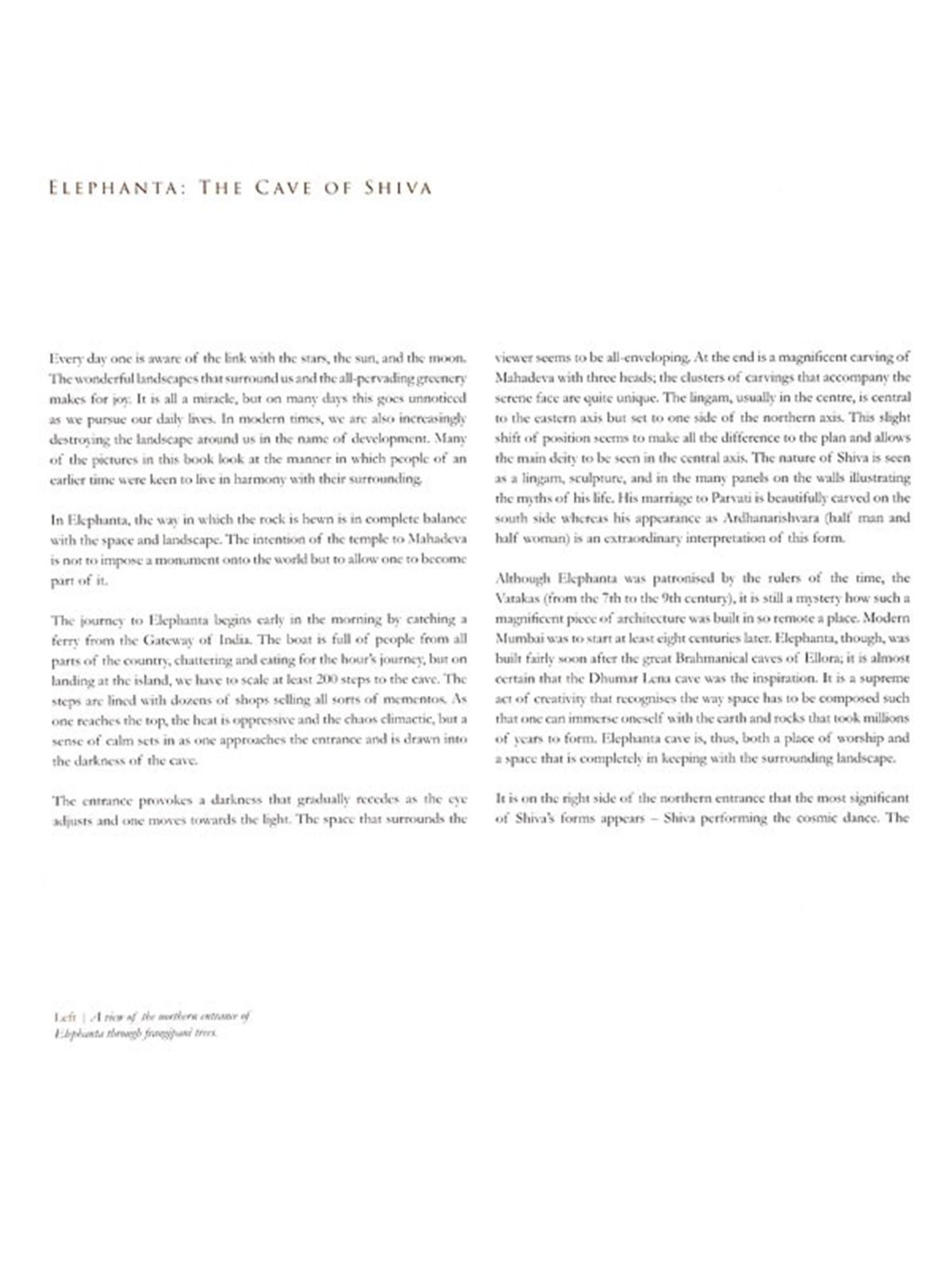 Stone is a material that takes many million years to form and offers a sense of permanence, Craftsmen and designers of an earlier era were able to use it most effectively to produce masterpieces of art and architecture. This volume is largely a collection of photographs and illustrations that shows how wonderful landscapes of stone have been devised to transcend space and time. It is an attempt to discover how the designers of the past envisaged structures that could link us to the stars and help us apprehend the nature of our existence. The primordial aspect of stone is perhaps why we feel so full of energy when wandering in areas with an abundance of this material. Stone offers magnificent compositions and becomes art in the vast expanses of the countryside, but man's intervention in order to find a higher level of being alleviates them to a level of beauty. The builders of Mahabalipuram, Ellora, Elephanta, Angkor War, Badami, and Hampi were concerned not only with creating shelter in harmony with the natural landscape, but also allow us to experience a sense of elation when confronted with the architecture of these places. The places I have chosen in this book, I believe, are structures that immerse the visitor in the universe. They are built in harmony with the landscape, but both the order and disorder of Hampi and Mahabalipuram are part of this extraordinary design. Mahabalipuram is said to have been a port where the Romans sent their ships to trade. The stone found here is among the hardest in India, and, consequently, the sculptures have not eroded or decayed.