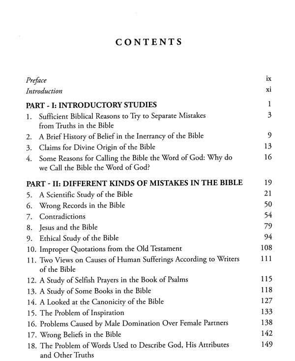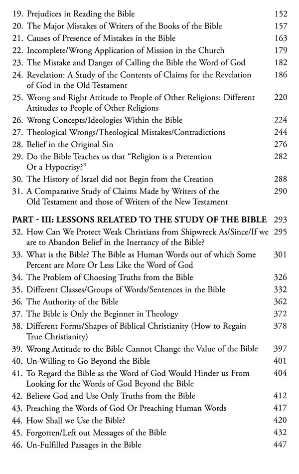 The Bible contains many warnings about false prophets and false teachers. Mistakes in the Bible may have the same causes. Therefore, it is very important to have the same kind of carefulness or watchfulness against such wrongs or mistakes. Writers of the books of the Bible really supported inerrancy of the Bible. Early theologians too somehow supported such claims, for belief in the inerrancy of the Bible for most writers of the books, the Bible claimed to write down something from the direct revelations of God. Therefore, most readers of the Bible too claimed the Bible to be the Words of God. However, a very careful study shows that there are many mistakes in the Bible. Certain kinds of mistakes in the Bible are shown in the chapters of PART - 11.