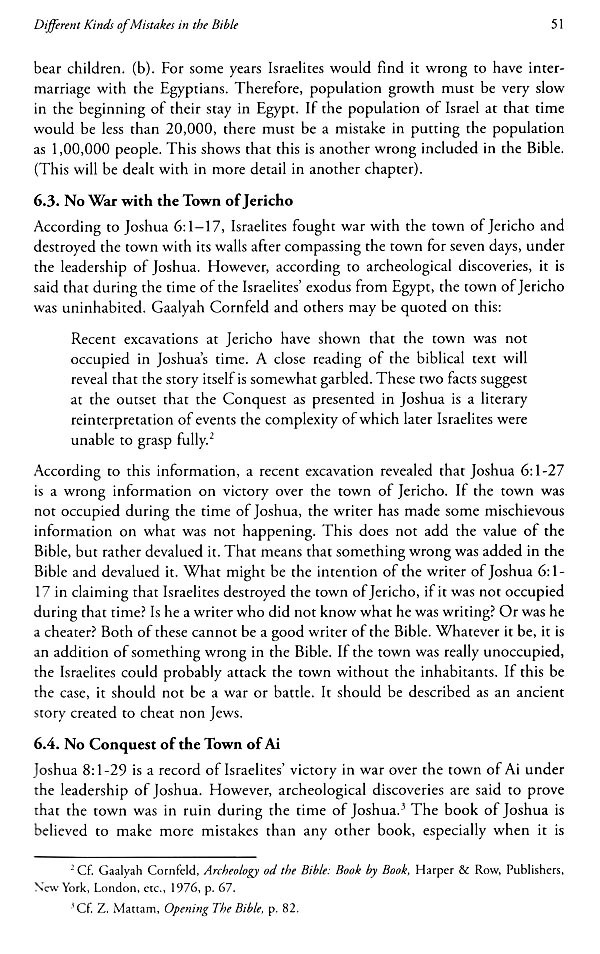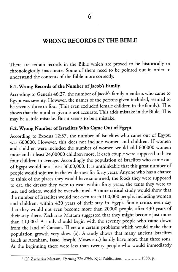 There are also many wrong records in the Bible. The writer of the book of Exodus is believed to make a wrong record of the population of Israelites who came out of Egypt. It is recorded that the population of the Israelites who came out of Egypt were 600000, excluding women and children. If women and children were included it would at least be 3600000 including women and children. Such a big number of people would even be more than the people of Egypt. Therefore, it is believed to be a wrong record of the population of Israel. A chapter is used to point out contradictions in the Bible. A number of contradictions both in the Old Testament and the New Testament are to be found. There were two different accounts on same events which contradicted to each other, both in the Old Testament and in the New Testament. An example is on the change of the name of a place called Luz to Bethel. Jesus' attitude to the Bible is also worthy to be studied. Jesus used to quote some words from the Old Testament. However, he never used them as they were in the Old Testament. He used to replace them with better and stronger words.