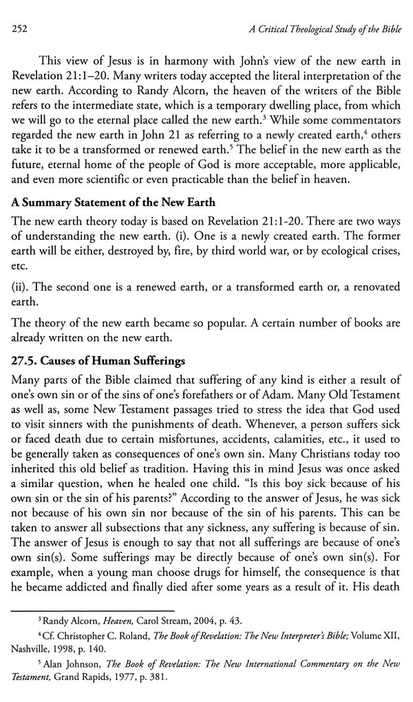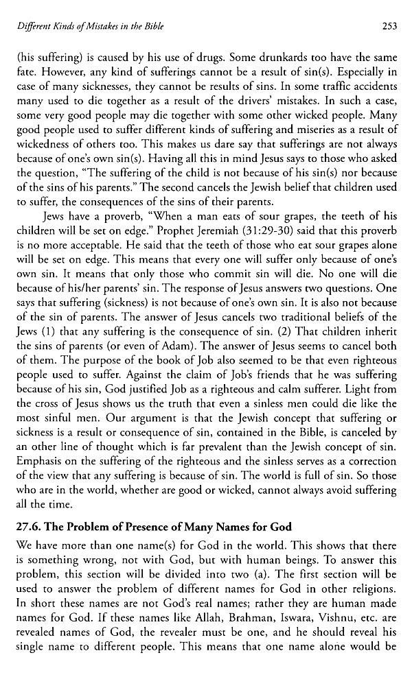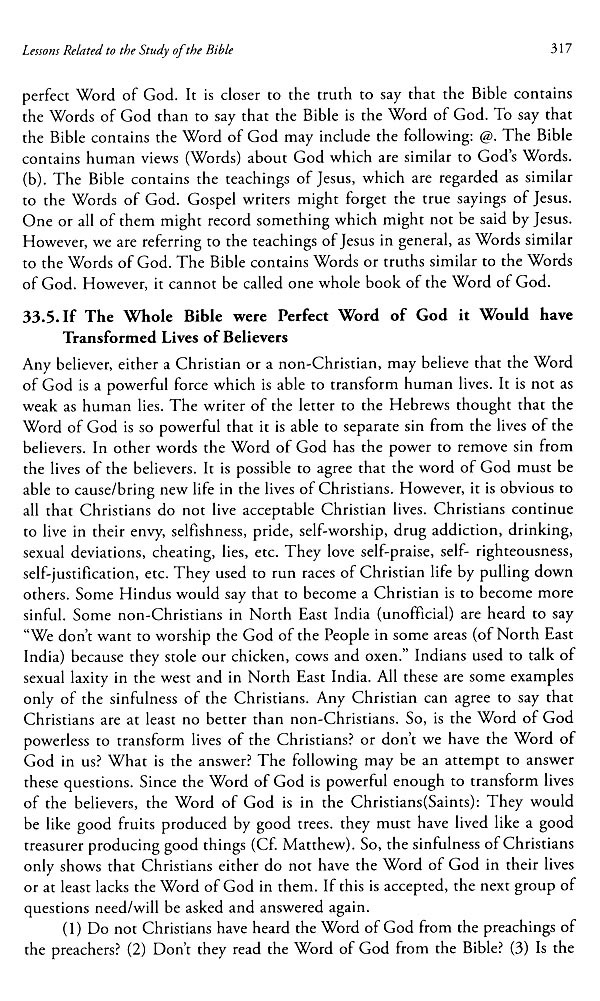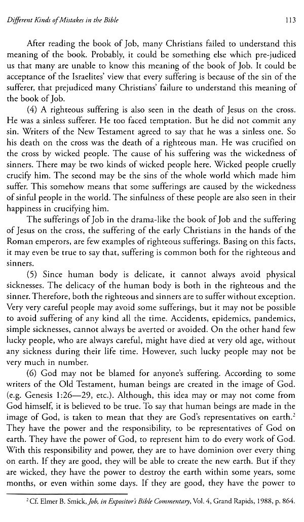 An ethical study of the Bible shows that the ethical standard of the Old Testament appeared to be lower than that of the New Testament. For example, while polygamy was practiced very much in the Old Testament, monogamy was strongly emphasized in the New Testament. This is indicated here to emphasize that some ethical situations in the Old Testament are not worthy to be read as the Words of God. Writers of the New Testament are also seen to make some improper quotations from the Old Testament. However, they made some wrong quotations or that they mostly quoted only partly, but not fully. There too are wrong concepts both in the testaments. For example, the idea of God as fixing the days for the death of everyone is detected in the Old Testament. Writers in both the testaments are seen to make some theological mistakes too. For example, the view that sin passed on from Adam to his offspring is believed by few writers of both testaments. This is taken to be a wrong theology in this work.