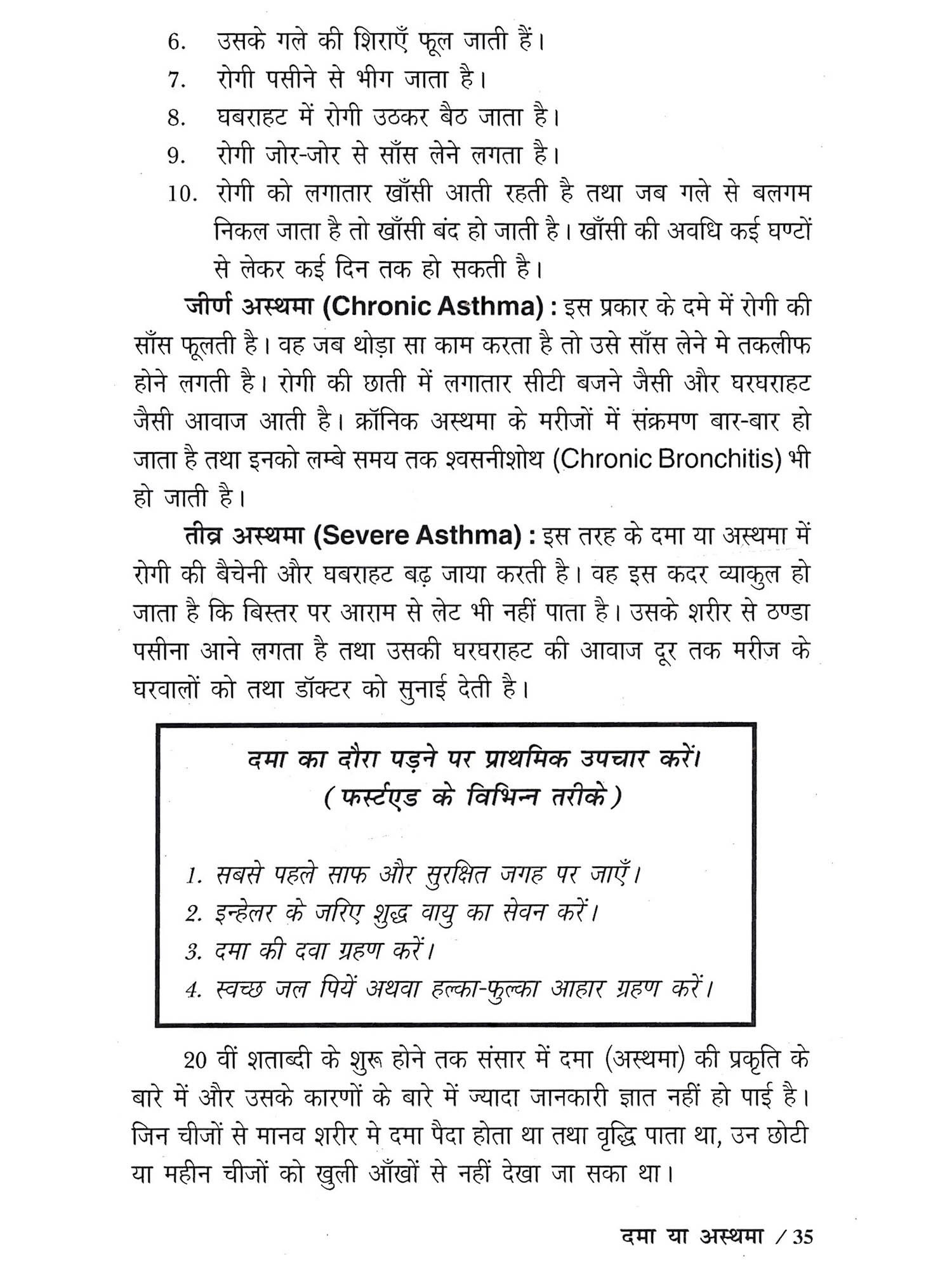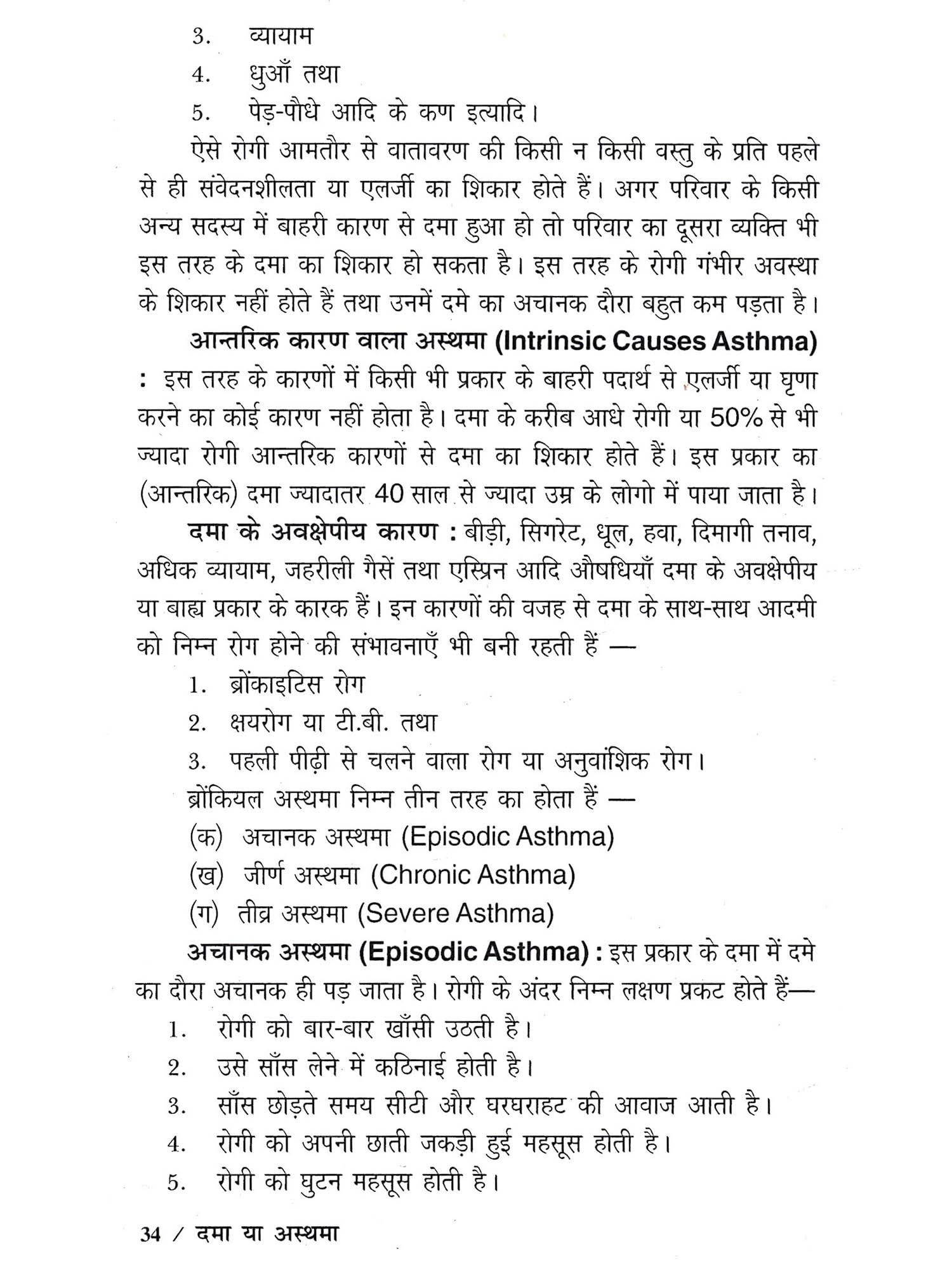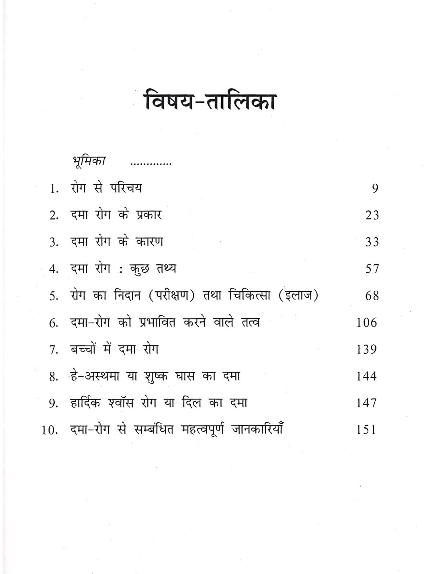इस पुस्तक में दमा रोग के कारणों पर विस्तार से प्रकाश डालने की चेष्टा की गयी है। एलर्जी अथवा किसी पदार्थ के प्रति अत्यधिक संवेदनशीलता को दमा रोग का प्रमुख कारण माना जाता है लेकिन एलर्जी के अलावा मौसम में परिवर्तन तथा व्यक्ति के अंदर आया हुआ भावात्मक बदलाव भी दमा या अस्थमा रोग का गौण कारण माना जाता है। दमा रोग के इलाज के लिए यौं तो अब तक कई प्रकार की दवाओं या औषधियों का आविष्कार हो चुका है और दमा रोगी डॉक्टर के परामर्श से इन औषधियों का नियमित सेवन करके स्वास्थ्य लाभ पाता है लेकिन दमा का इससे भी ज्यादा बेहतर इलाज ऐसे पदार्थों, मौसम और माहौल से बचना है, जिसमें दमा रोग पैदा करने वाले कीटाणु पैदा होते हैं। असल में अपना बचाव ही दमा रोग का सबसे बेहतर इलाज है। ऐसा देखा गया है कि युवकों एवं प्रौढ़ व्यक्तियों के अलावा छोटी और बड़ी उम्र के बच्चे भी दमा रोग का शिकार हो जाते हैं। बड़ी उम्र के बच्चों में तो दमा रोग के लक्षण आसानी से पहचाने जा सकते हैं लेकिन छोटी उम्र के बच्चों में अस्थमा के लक्षणों को खोज पाना मुश्किल होता है। निरंतर बदलता हुआ भौगोलिक एवं सामाजिक परिवेश, बढ़ता हुआ प्रदूषण और खानपान में सतर्कता न बरतना ये सभी कारण दमा रोग की उत्पत्ति के मूल हैं। अतः दमा रोग से बचने के लिए हमें इन सब पहलुओं पर ध्यान देना होगा। जहाँ तक हो सके, हम एलर्जिक पदार्थों से बचे रहें और यदि हमको दमा रोग हो जाए तो हम घबराने के बजाय अस्पताल या डॉक्टर के पास जाएँ। डॉक्टर हमारे लिए जो औषधियाँ लिखे, उन्हें डॉक्टर के बताए अनुसार ही नियमित रूप से लेते रहें। इसी से दमा या अस्थमा रोग पर काबू पाया जा सकता है।
