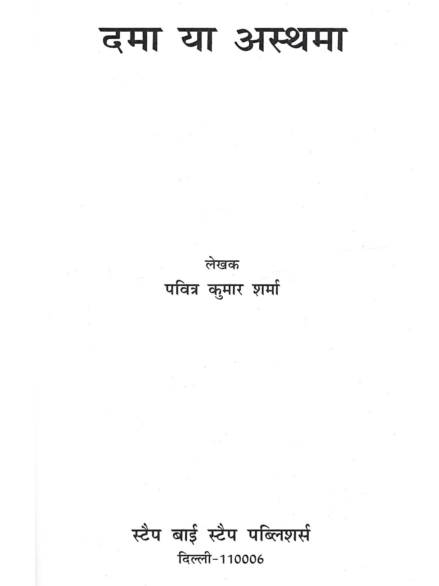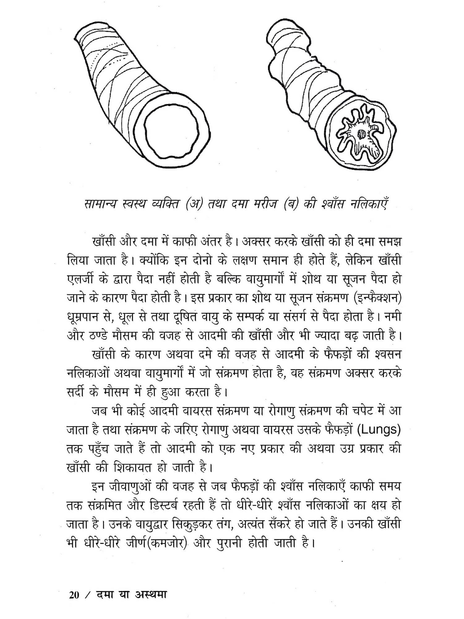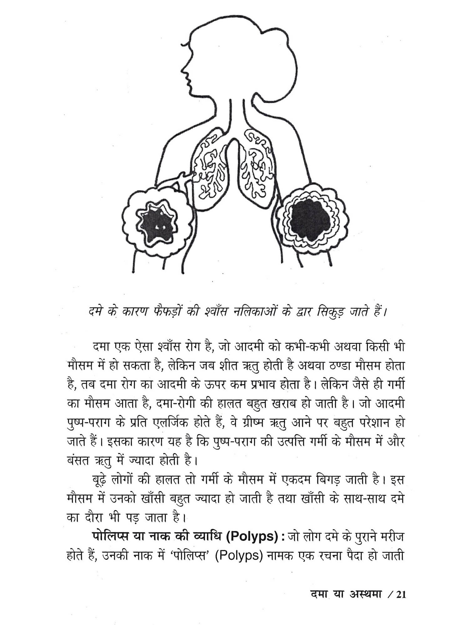 इस पुस्तक में दमा रोग के कारणों पर विस्तार से प्रकाश डालने की चेष्टा की गयी है। एलर्जी अथवा किसी पदार्थ के प्रति अत्यधिक संवेदनशीलता को दमा रोग का प्रमुख कारण माना जाता है लेकिन एलर्जी के अलावा मौसम में परिवर्तन तथा व्यक्ति के अंदर आया हुआ भावात्मक बदलाव भी दमा या अस्थमा रोग का गौण कारण माना जाता है। दमा रोग के इलाज के लिए यौं तो अब तक कई प्रकार की दवाओं या औषधियों का आविष्कार हो चुका है और दमा रोगी डॉक्टर के परामर्श से इन औषधियों का नियमित सेवन करके स्वास्थ्य लाभ पाता है लेकिन दमा का इससे भी ज्यादा बेहतर इलाज ऐसे पदार्थों, मौसम और माहौल से बचना है, जिसमें दमा रोग पैदा करने वाले कीटाणु पैदा होते हैं। असल में अपना बचाव ही दमा रोग का सबसे बेहतर इलाज है। ऐसा देखा गया है कि युवकों एवं प्रौढ़ व्यक्तियों के अलावा छोटी और बड़ी उम्र के बच्चे भी दमा रोग का शिकार हो जाते हैं। बड़ी उम्र के बच्चों में तो दमा रोग के लक्षण आसानी से पहचाने जा सकते हैं लेकिन छोटी उम्र के बच्चों में अस्थमा के लक्षणों को खोज पाना मुश्किल होता है। निरंतर बदलता हुआ भौगोलिक एवं सामाजिक परिवेश, बढ़ता हुआ प्रदूषण और खानपान में सतर्कता न बरतना ये सभी कारण दमा रोग की उत्पत्ति के मूल हैं। अतः दमा रोग से बचने के लिए हमें इन सब पहलुओं पर ध्यान देना होगा। जहाँ तक हो सके, हम एलर्जिक पदार्थों से बचे रहें और यदि हमको दमा रोग हो जाए तो हम घबराने के बजाय अस्पताल या डॉक्टर के पास जाएँ। डॉक्टर हमारे लिए जो औषधियाँ लिखे, उन्हें डॉक्टर के बताए अनुसार ही नियमित रूप से लेते रहें। इसी से दमा या अस्थमा रोग पर काबू पाया जा सकता है।