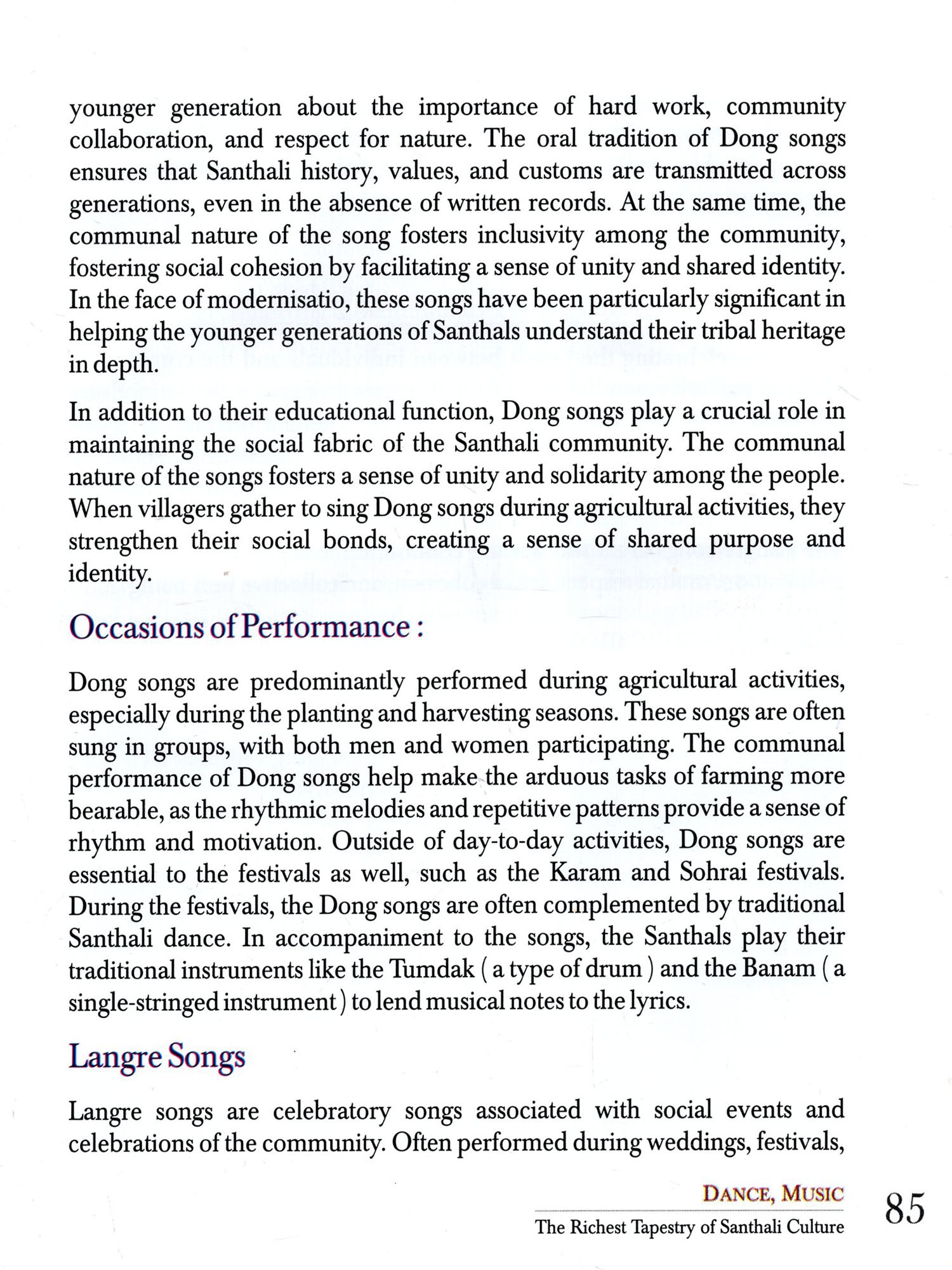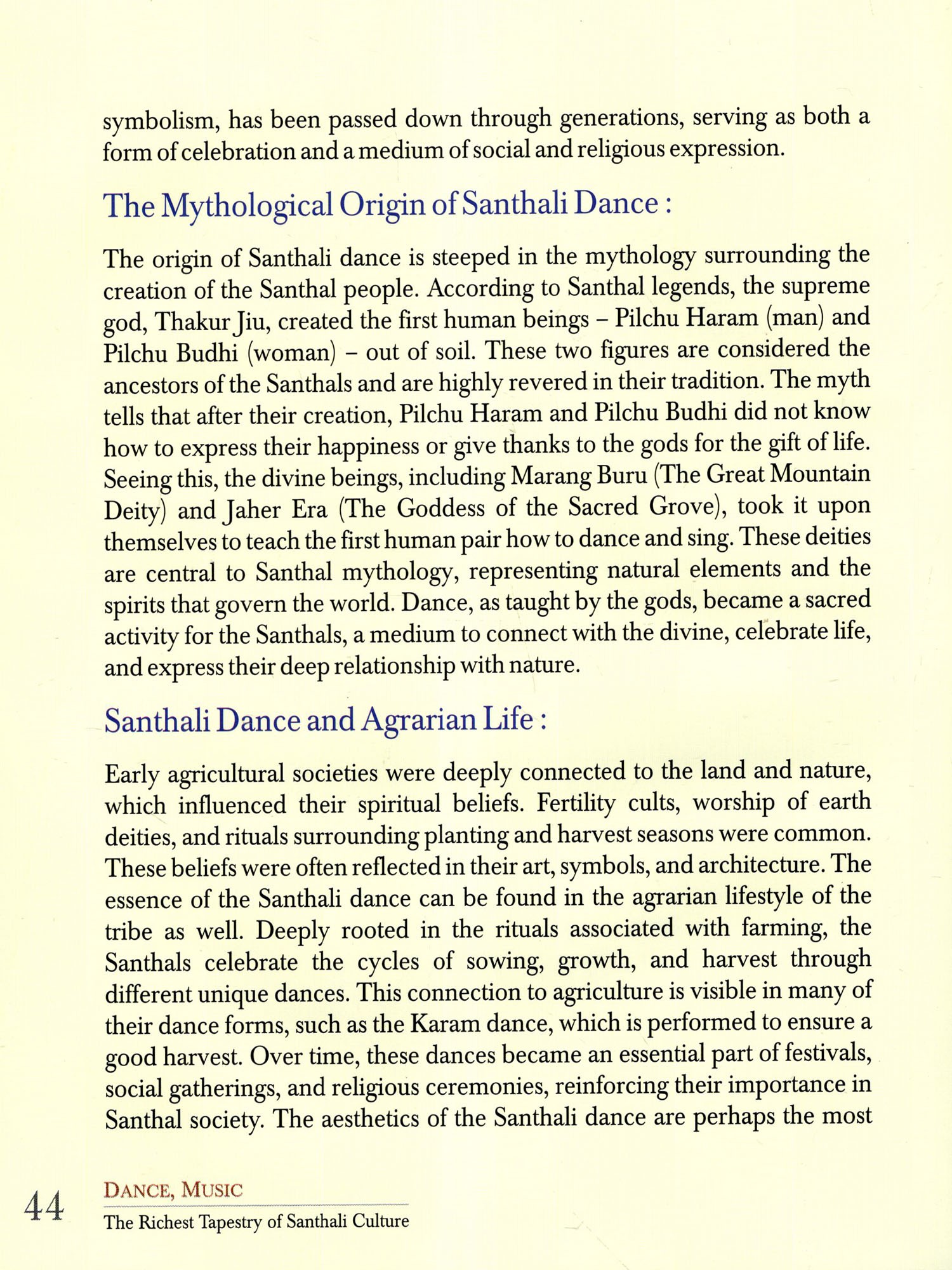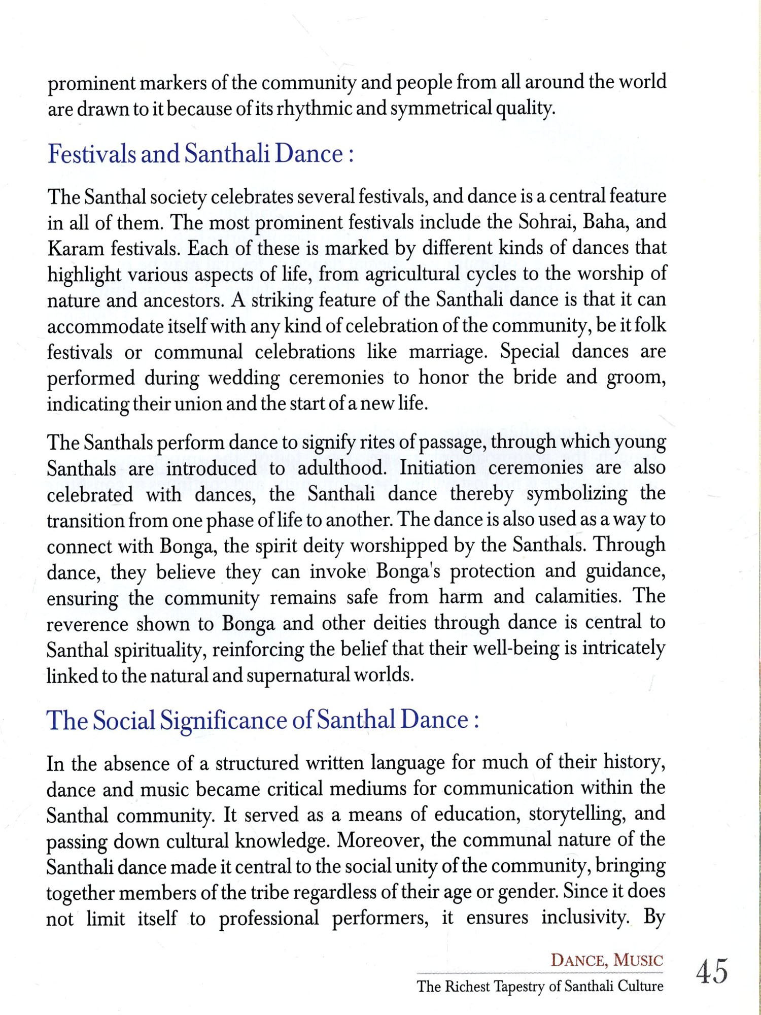 This preface aims to introduce readers to the diverse and fascinating aspects of Santhali culture, which has remained resilient in the face of modernization. Exploring their heritage is not only a means to honour the Santhali people but is also an attempt to truly and deeply understand the cultural nuances that have characterised the Santhals since time immemorial. This work is an invitation to celebrate the legacy of the Santhals-a legacy that speaks of harmony, resilience, and the enduring beauty of cultural diversity that forms an indispensable part of India's identity.