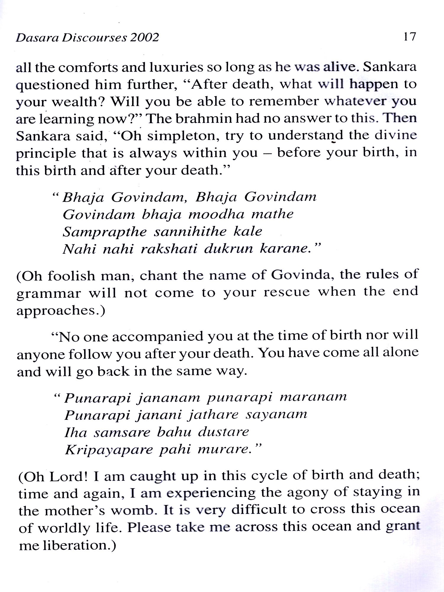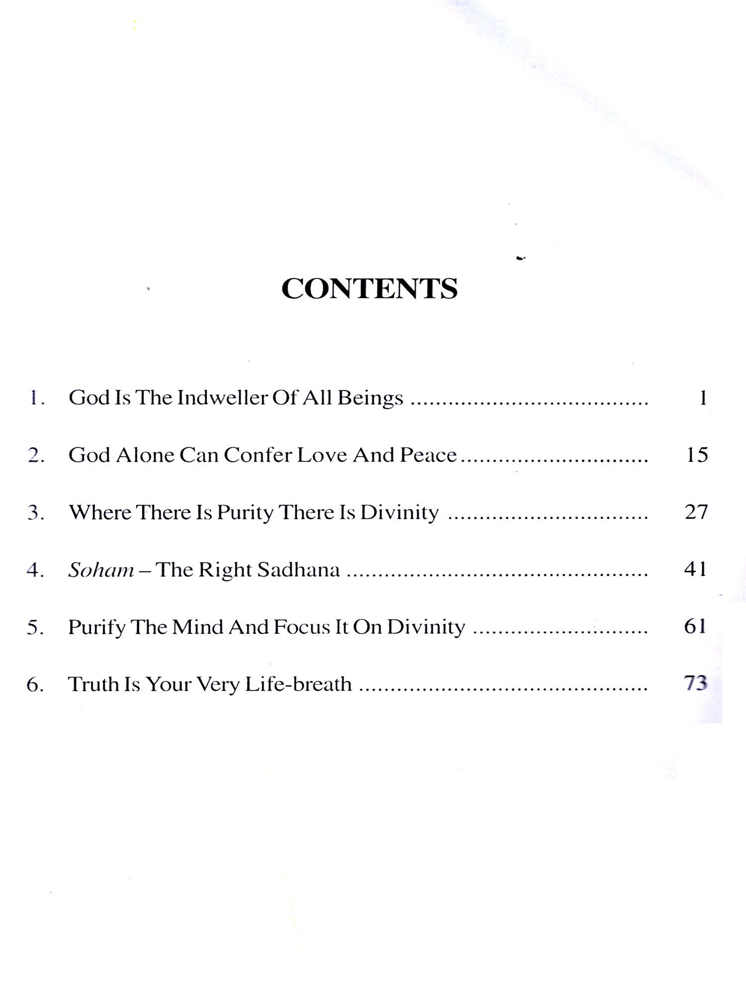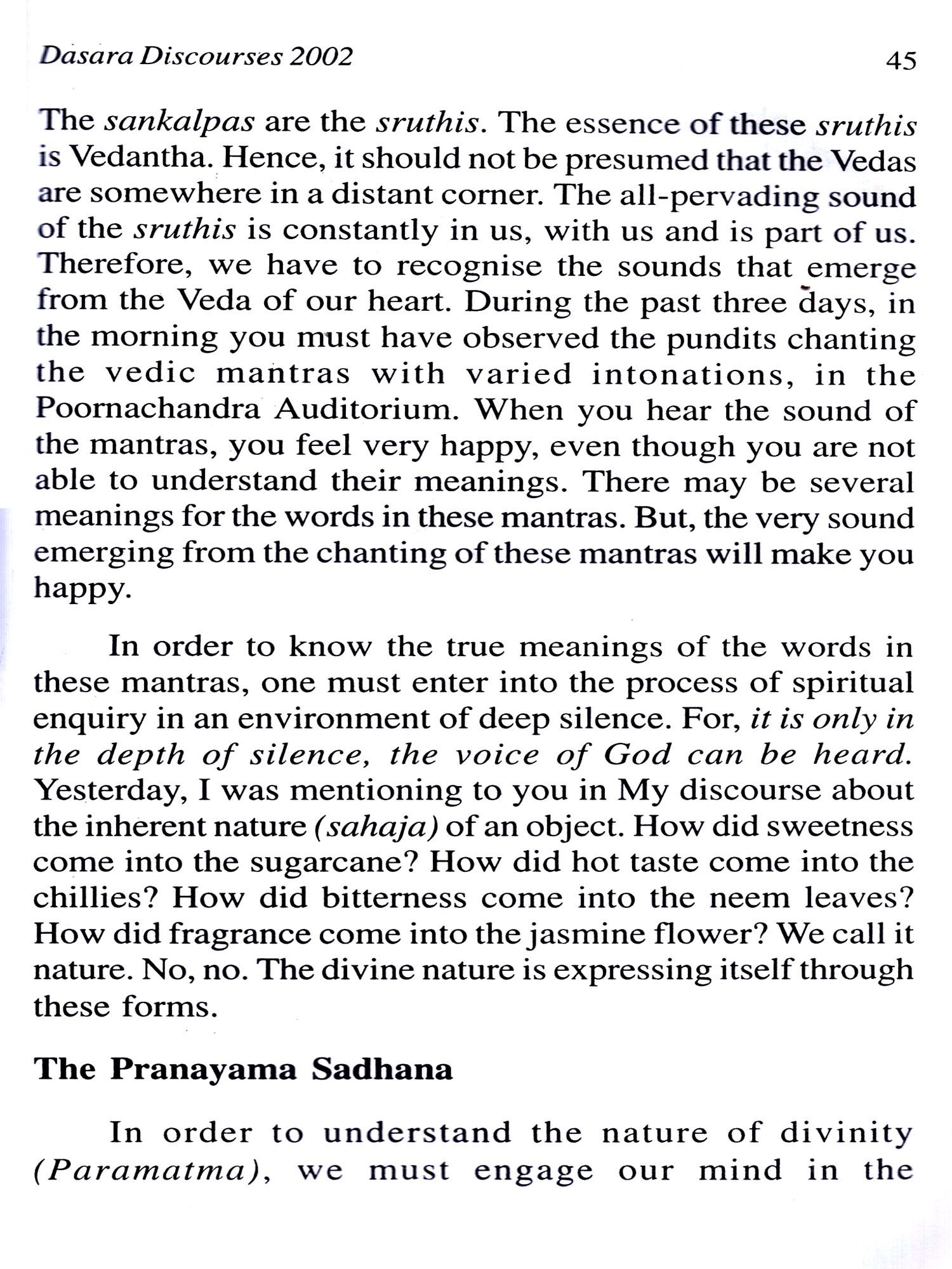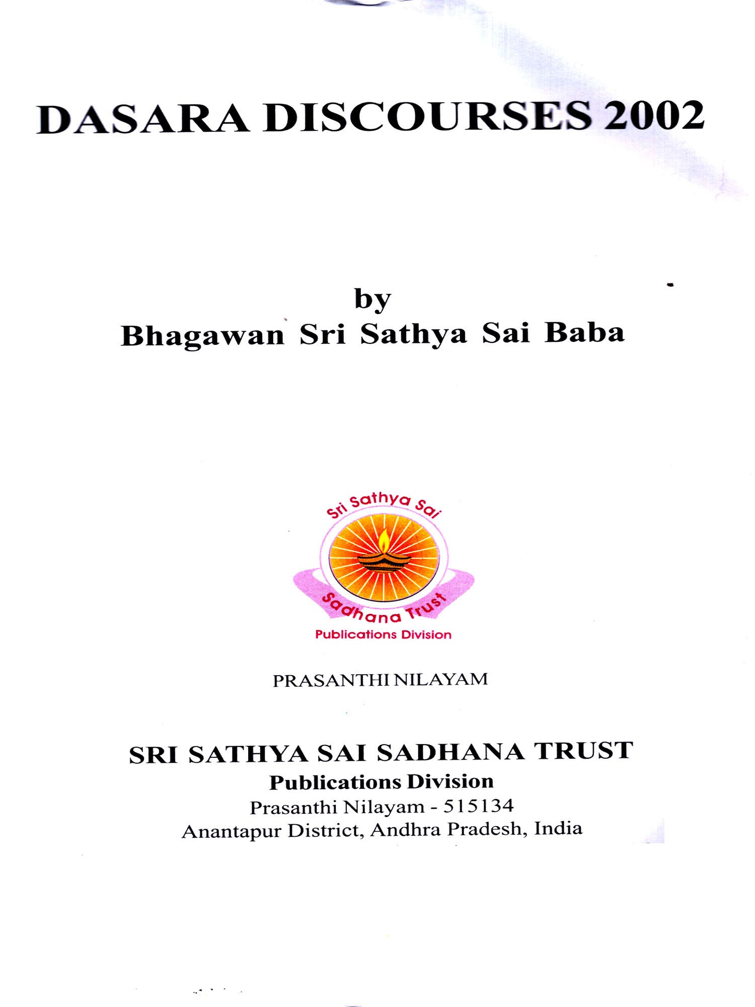 Veda Purusha Saptaha Jnana Yajna, a seven day Vedic sacrifice is held every year at Prasanthi Nilayam during the Dasara festival. Bhagawan Baba usually gives Discourses in the evenings preceded by talks by distinguished speakers during this period. We have a collection of the six Discourses that Bhagawan delivered in the year 2002 in this book during this festival. The central theme is the binding nature of the mind and its vagaries, the control of which, with the constant remembrance of the Lord, can bestow on man love, peace and happiness, the Upanishads and other scriptures being potent aids in this direction.