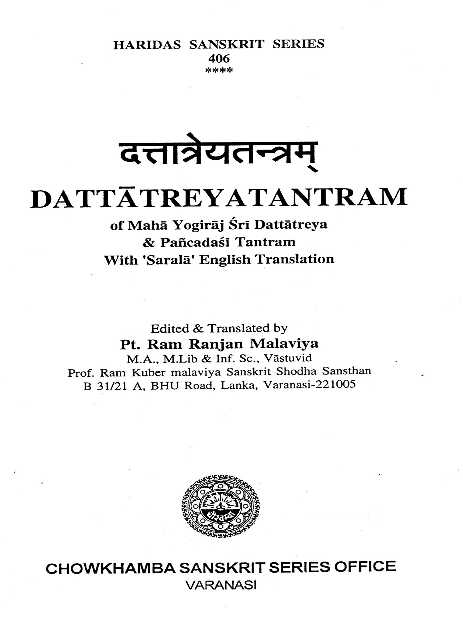 The directors of 'Chowkhamba Sanskrit Series Office, Varanasi' Shri Sachin Gupta deserve special thanks, who have done a great favor on many Tantra worshipers by publishing the Dattaatreya Tantram with pure editing and attractive printing.