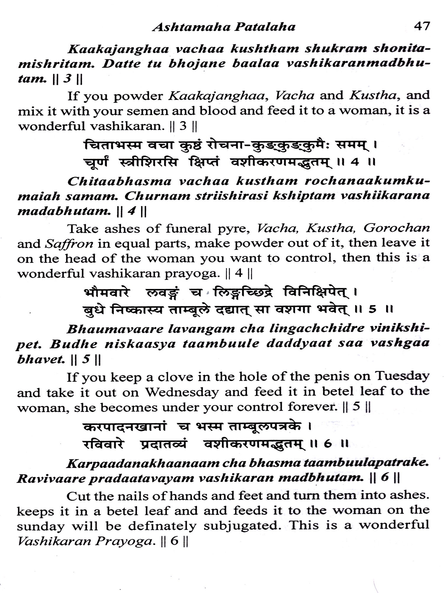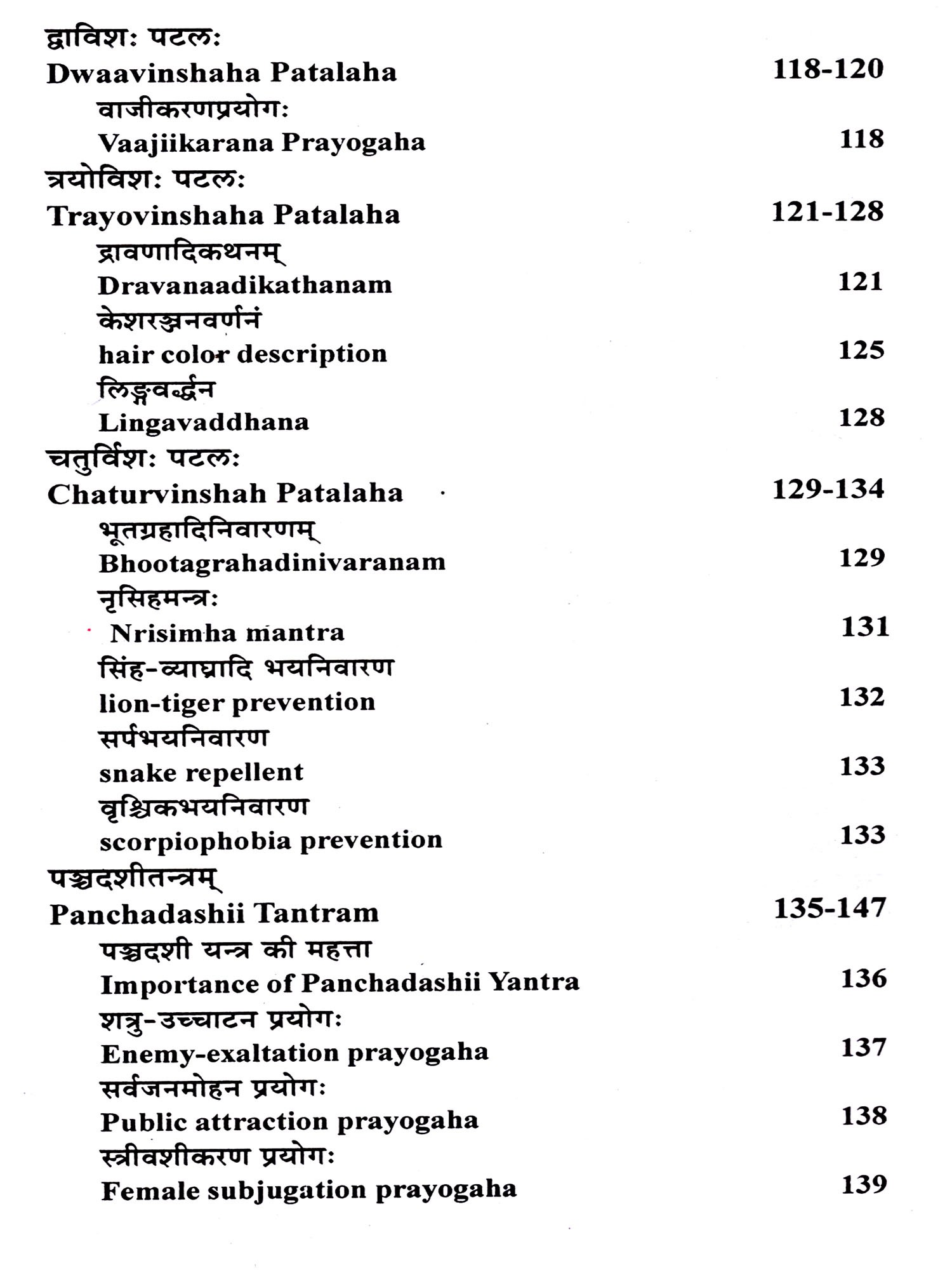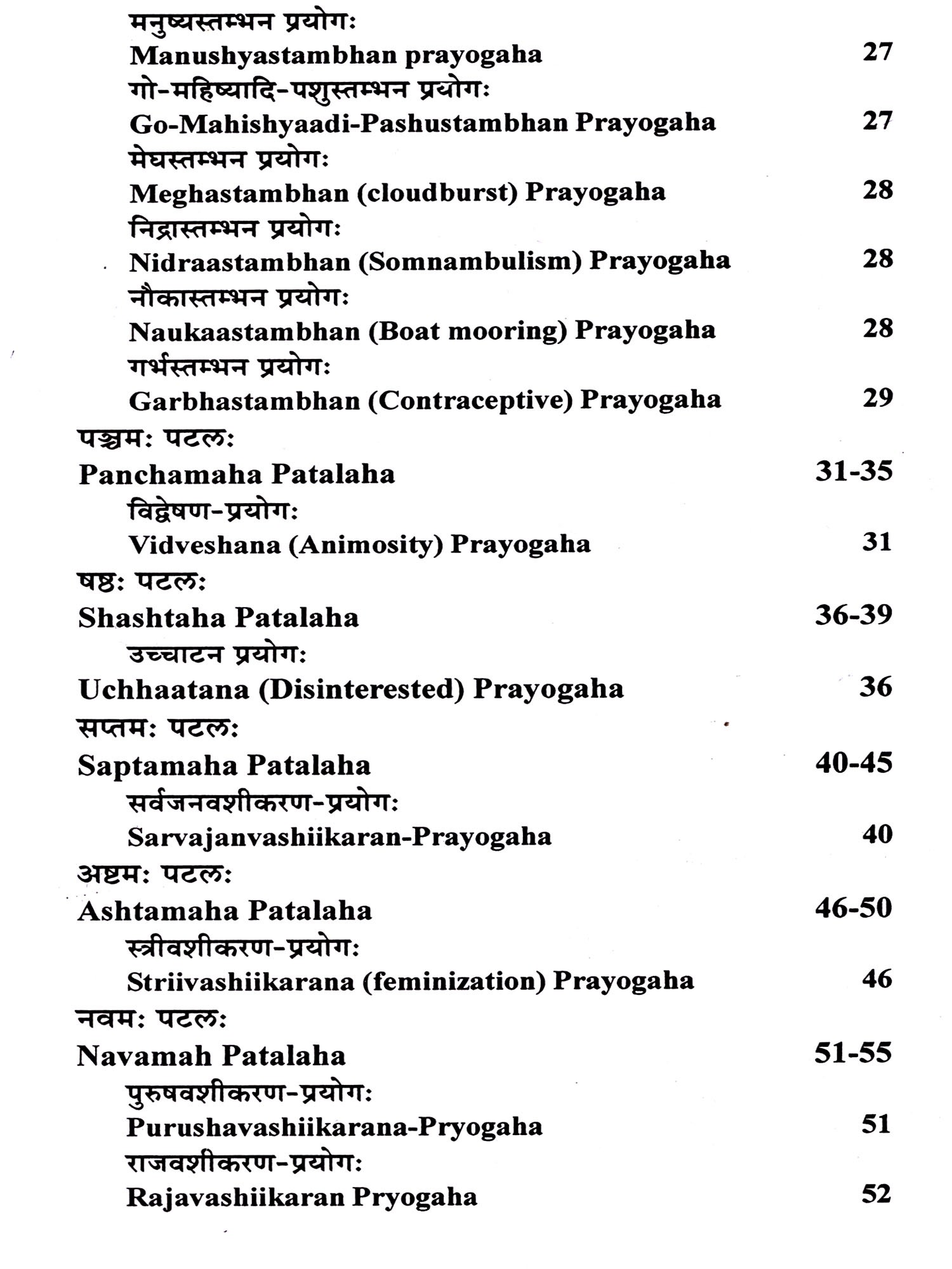 Maarana, Mohana, Stambhana, Vidveshana, Ucchaa-tana, Vashiikarana, Aakarshana (Attraction), Indrajaala, Yakshinii means, Alchemy (past, future etc.), Kaal Gyan, Anaahaar (indirect), Aahaaram (direct), Nidhidarshana, Bandhyaa having a daughter and death of Mritvatsaa. The survival of the son, victory in the war, Vaajiikarana (stimulate virility), exorcism, and removal of lion, tiger, snake and scorpion etc. from the place. Many true prayoga like removal of fear etc. have been said in this Tantra, hence it should always be kept as a secret.