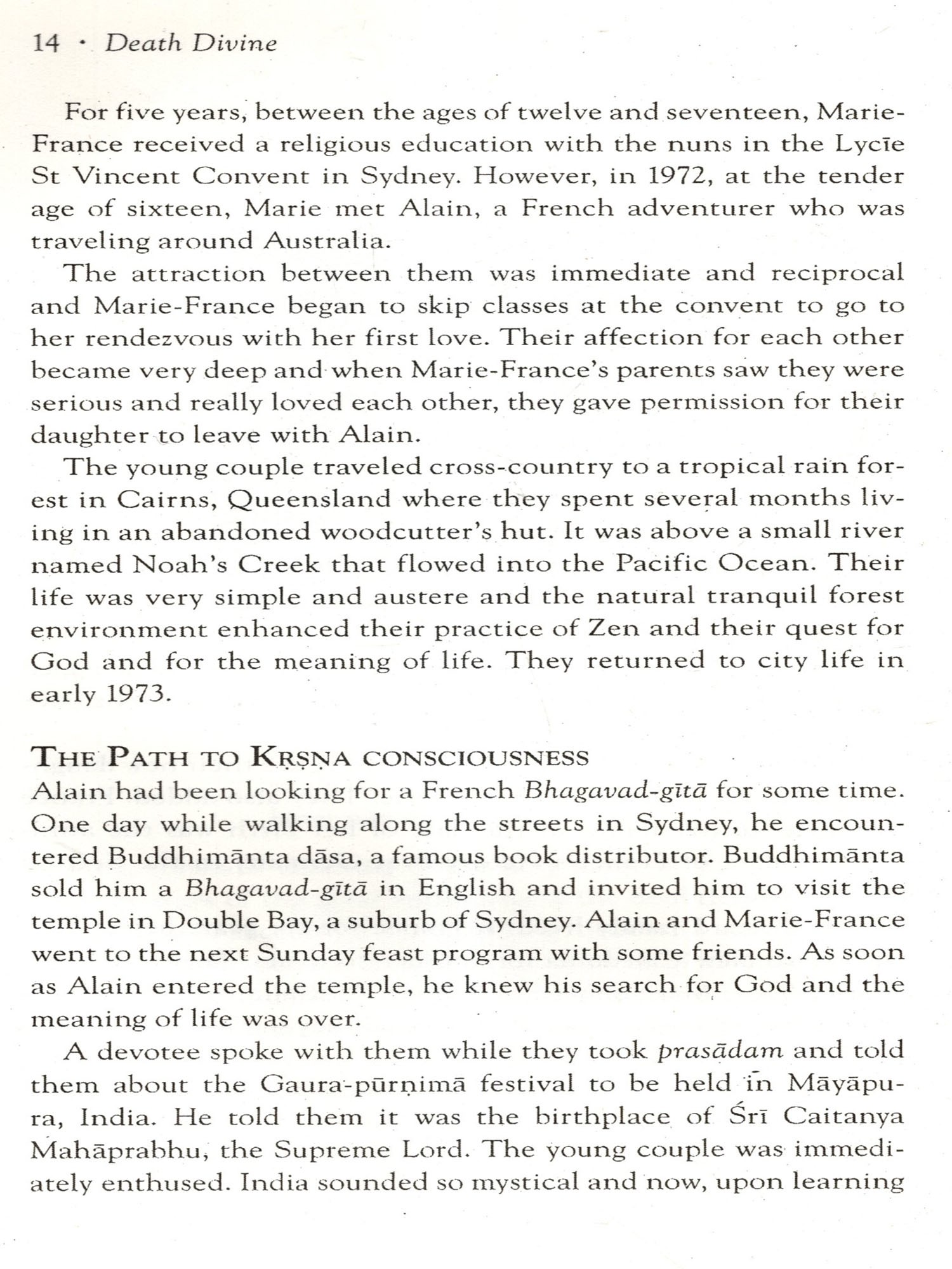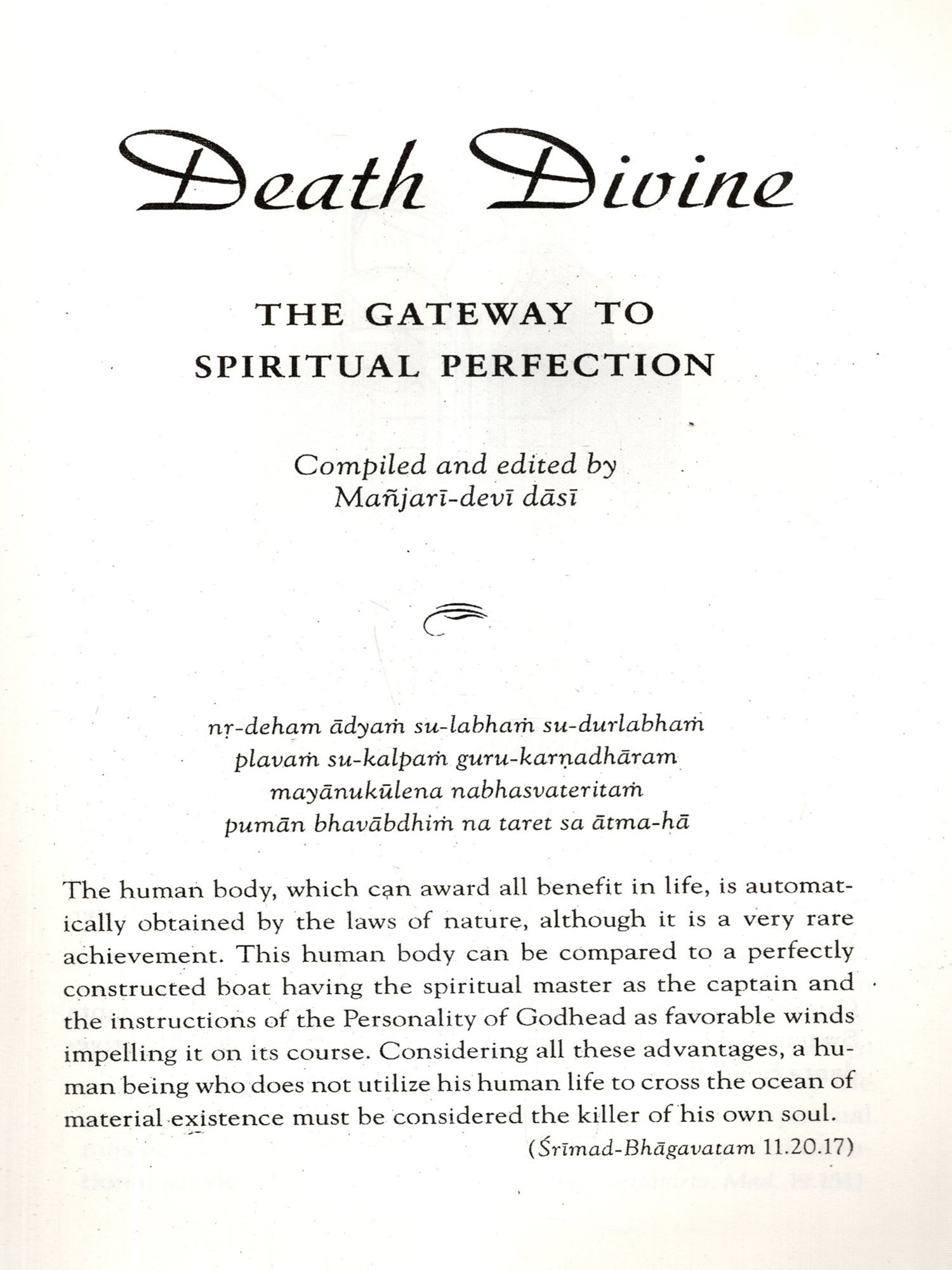 One purpose of this book is to speak to those practicing Krsna consciousness by saying, "Yes, we know it is difficult to keep on going in spiritual life and to maintain your enthusiasm and conviction that you can be Kryna conscious at the time of death. Don't be disheartened. Just look at the glorious passing of these unknown simple devotees. Just see the special mercy Krsna gave them and how He was there for them at the crucial time of leaving the body. If they can do it, so can you." And for those who have not yet taken to spiritual life, we hope this book will evoke a desire to perfect your existence in this material realm by enquiring into this most crucial question-how to live and die to attain the topmost spiritual destination.