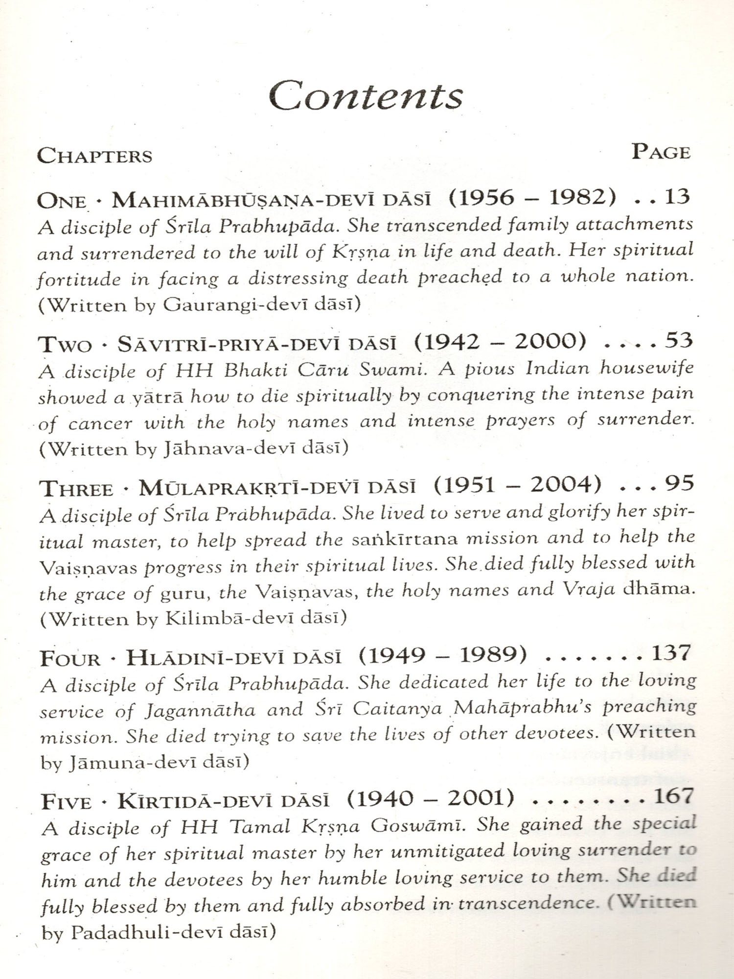 My gratitude goes to Manjari for doing this wonderful book so devotees everywhere can hear the transcendental pastimes of these devoted Vaisnavis who offered mind, body and soul to guru and Krsna. Their stories are meant to inspire-and that they do. These exceptional pastimes between Lord Krsna and His beloved devotees will enliven you to continue your devotional practices with enthusiasm so that at the end of this life, you too can return home, Back to Godhead.