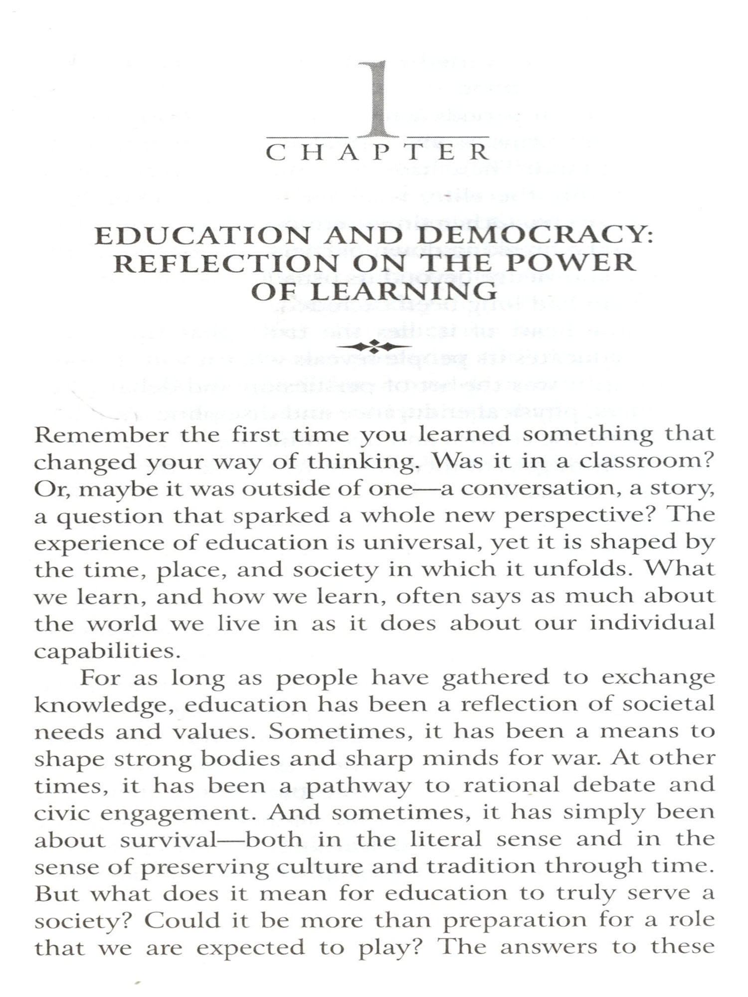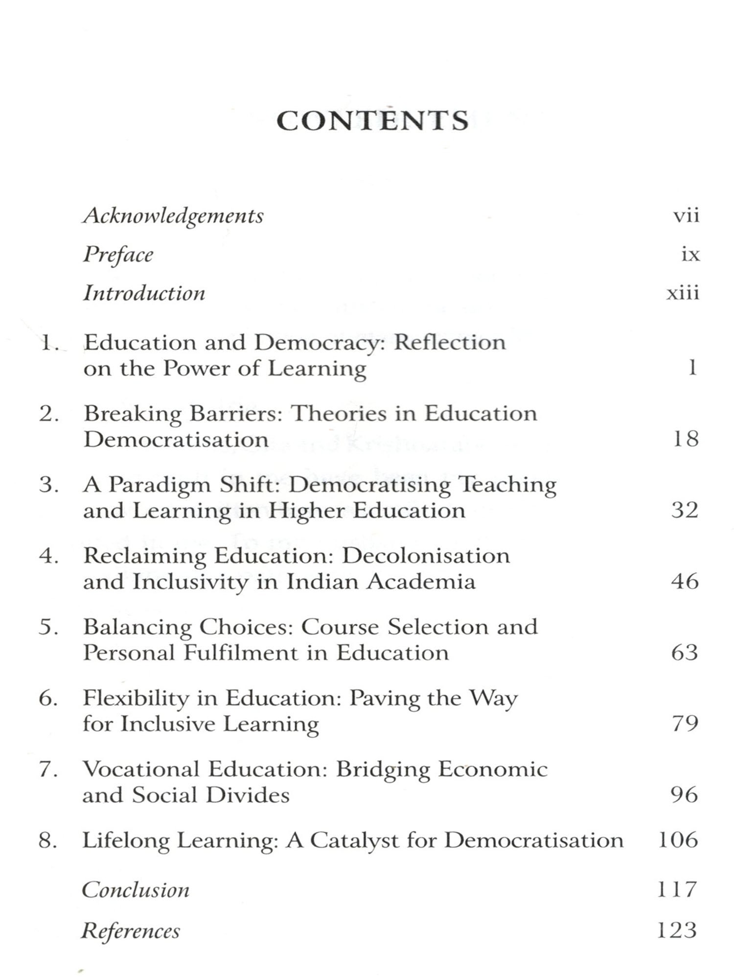 At the intersection of education and democracy lies an idea: that learning is not only about acquiring knowledge, but also about shaping individuals who can think critically, act ethically, and contribute meaningfully to their communities. India's education system, steeped in a rich historical context, has undergone transformative changes, yet challenges persist. How do we ensure that education reflects the aspirations of a diverse population? How can it accommodate individual pathways while addressing collective needs? This book was written to explore these questions, drawing from both global perspectives and the unique socio-cultural realities of India. By examining the historical evolution of education, its philosophical foundations, and its current trajectory, this work seeks to contribute to an ongoing dialogue about the role of education in fostering equity, inclusion, and meaningful participation.