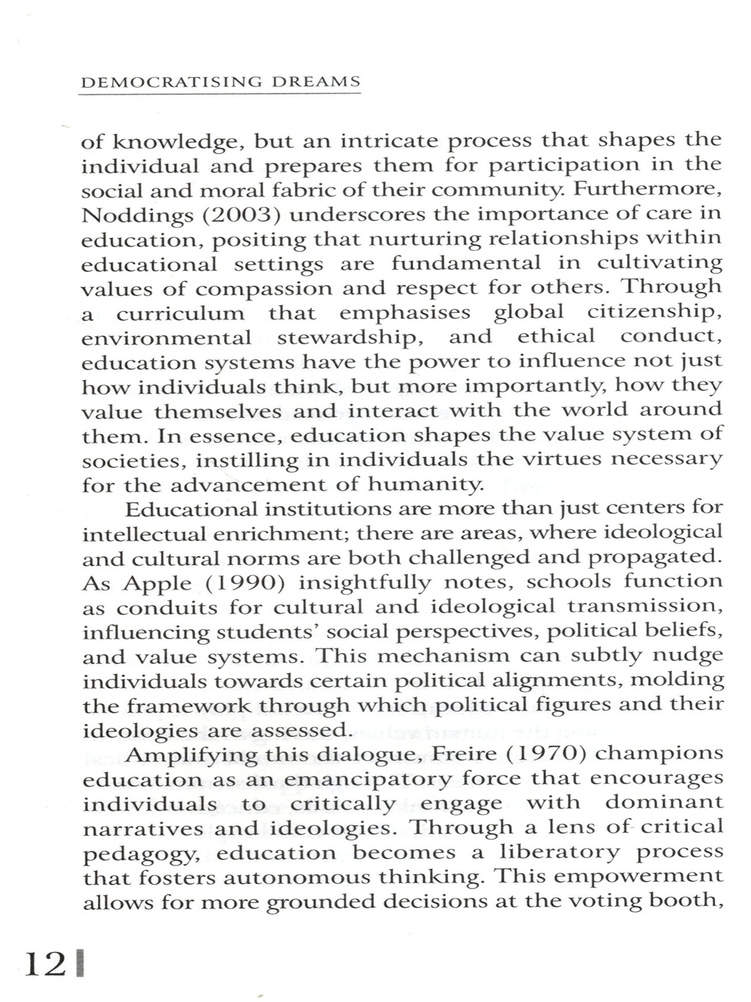 The democratisation of education is, by no means, limited to the introduction of democratic forms into the management of the education services, the democratisation of the activities of educational establishments, or even the organisation of the educational process properly as is generally believed. The concept of democratisation is far broader for it assumes a free choice of educational options, the relatively easy access to any level of education, a smooth transition from one level of education to another, freedom with regard to creative endeavours for the teacher and the student, the easy granting of copyrights and patents, social guarantees, and much more in the way of measures that remove the shackles from education and liberate individual potentials of all those involved in education. (Bondarenko and Kozulin, 1991) This book seeks to explore the intersections between education and democracy, not merely as abstract concepts, but as lived experiences that shape individuals and our societies. We are not simply looking at education as a system for imparting knowledge, but as a transformative force capable of creating pathways for self-discovery, and the realisation of personal and collective dreams. Within this framework, education evolves from a mechanism of information transfer into a dynamic space for nurturing good decision-making, critical thinking, and the capacity to discern, learn, and grow.
