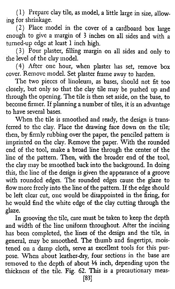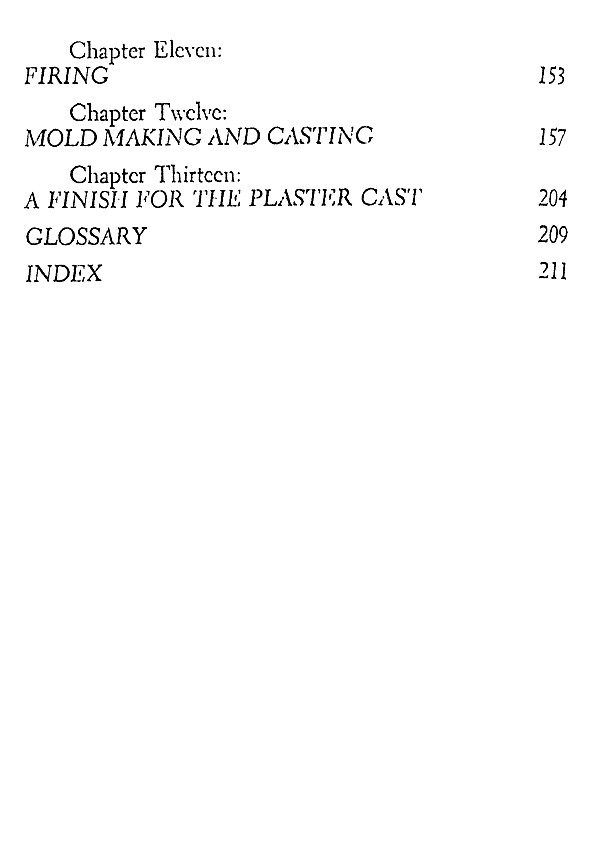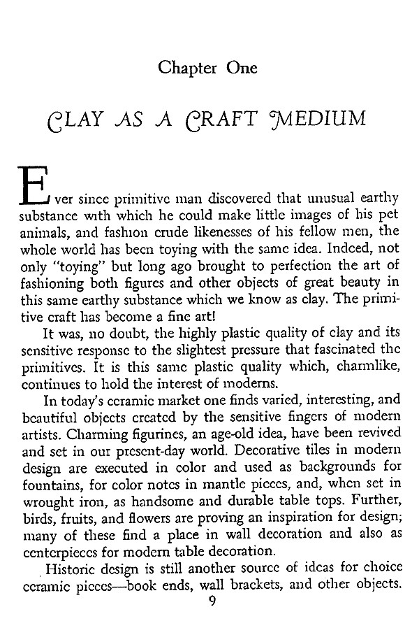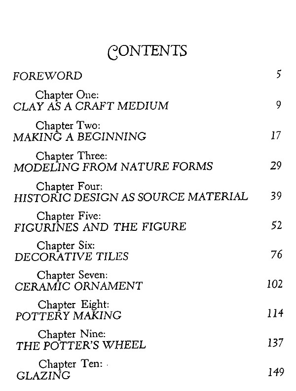 Though the book covers a wide range of possibilities in clay as a craft, it is primarily written for those who have not had a broad experience in the clay field, for beginners and amateurs, if you please. It is the hope of the author that the various possibilities presented for interesting projects, all of which give the creative ability of the worker free range, may serve as a stimulus to original endeavor. Also, that he may find not only a pleasure but a real satisfaction in a material so responsive to his every idea.