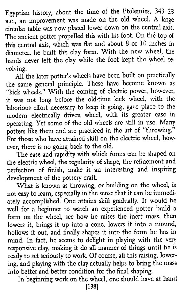 The author wishes to express sincere appreciation for the many courtesies and privileges extended while the text was in preparation, very especially to S. W. Rapp, Jr., secretary-treasurer of the Morton Potteries, Morton, Illinois, whose splendid cooperation contributed much to the development of the book. To Nathan Rapp, expert ""thrower"" at the Morton Potteries, the author is indebted for making possible the photographs on throwing, Chapter Nine. Acknowledgments are also made to The Metropolitan Museum of Art, New York City, The Art Institute of Chicago, and the New Mexico State Tourist Bureau, Santa Fe, New Mexico, for the excellent photographs used as illustration; to Helen Westermann for pen drawings; and to the several individual studios and craftworkers who have so generously contributed to the illustrations of the text, to each of whom a credit is given with the illustration.