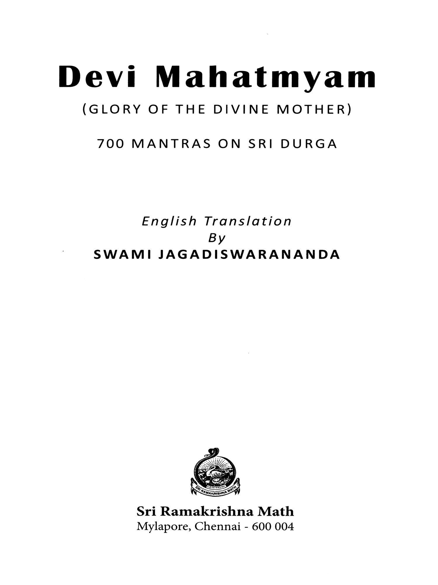 Devi-Mahatmya, otherwise called Durga-Saptasati or the Candi is a sacred text used by the Hindus for daily chanting like the Gita. My Bengali rendering of the Devi-Mahatmya, published by the Udbodhan Office of Calcutta has already undergone several editions. Its popularity in Bengali has encouraged me to undertake the present English translation whose want has been, for long, keenly felt by the English knowing public. This edition is meant for them.