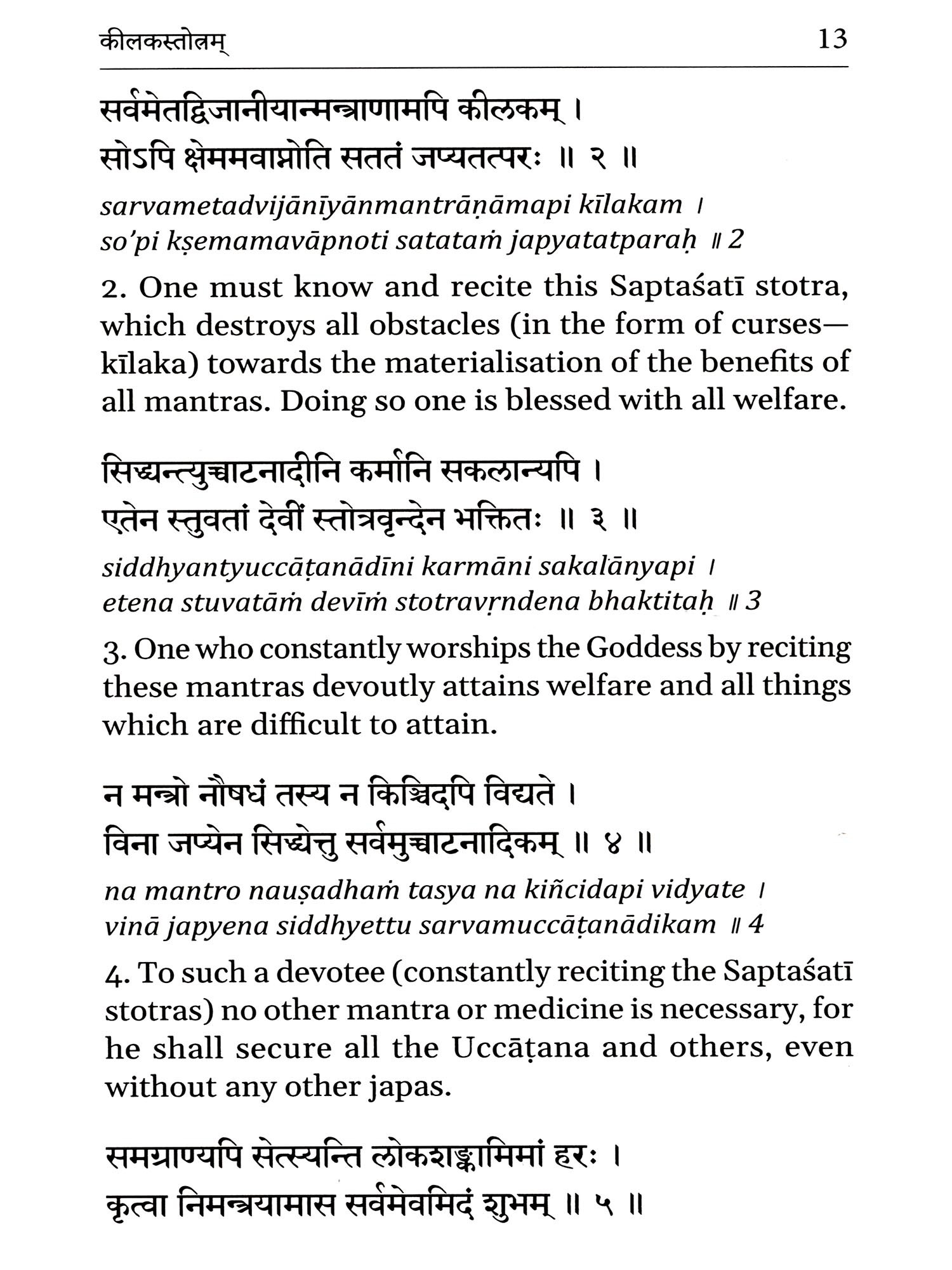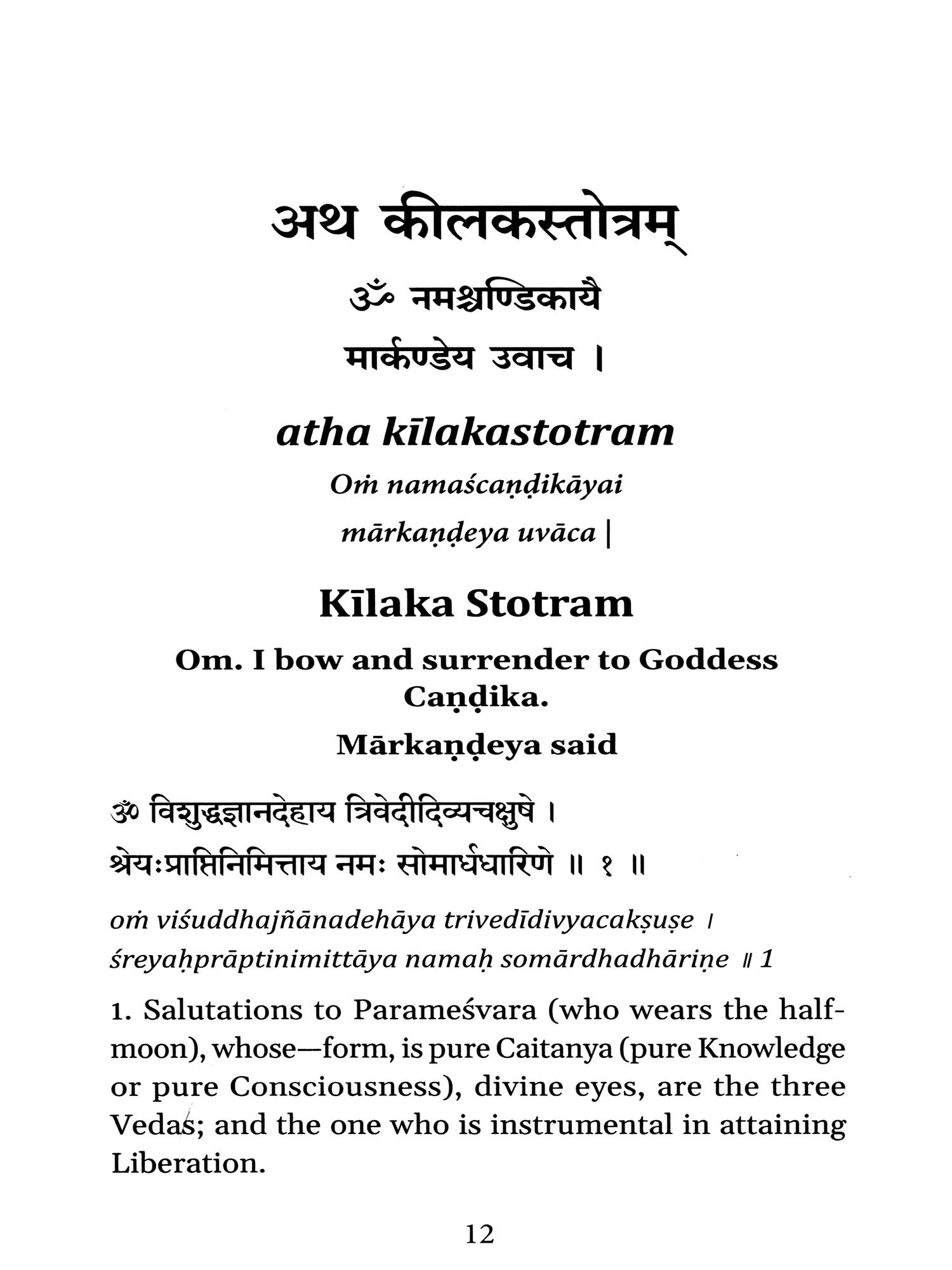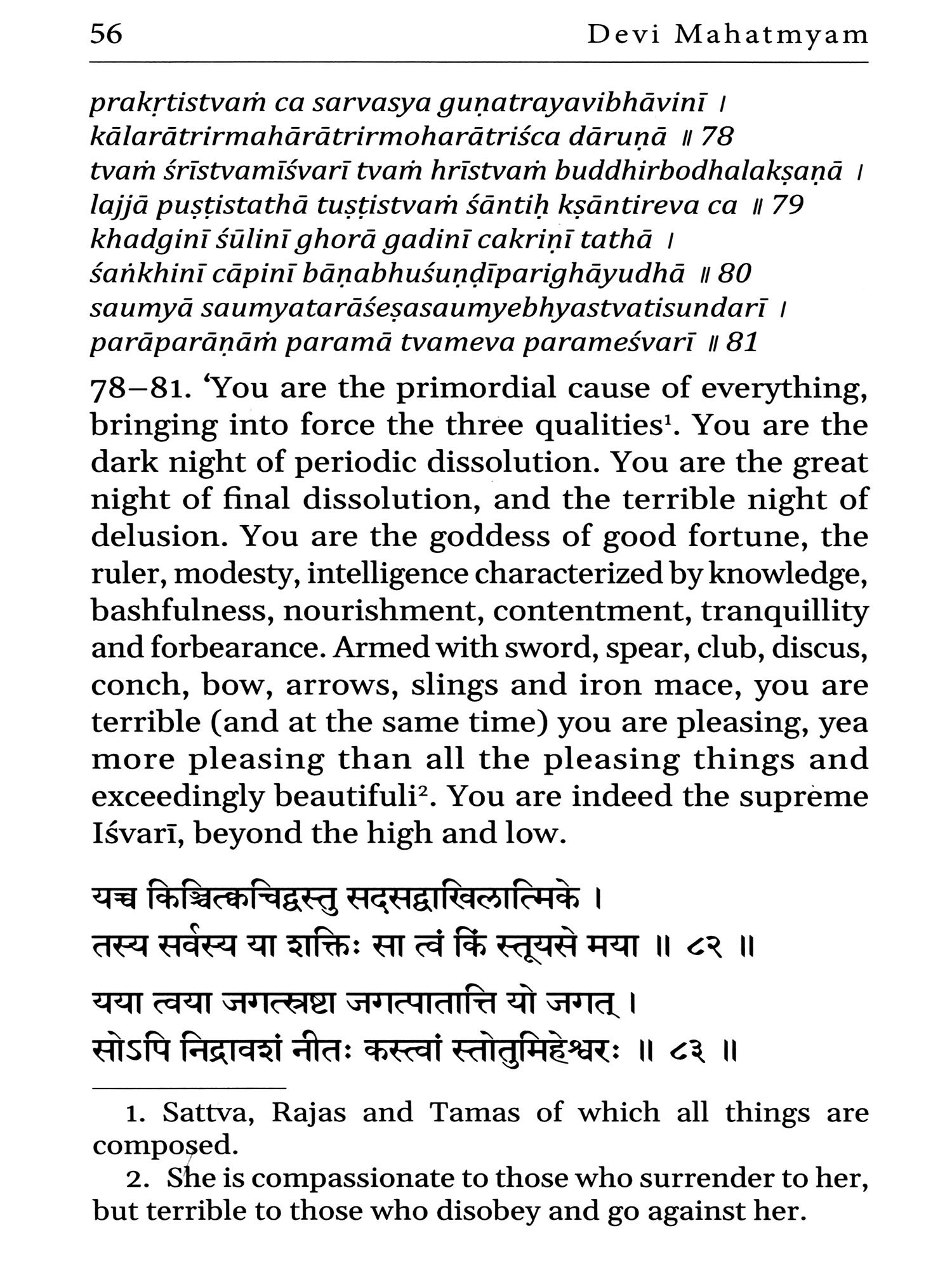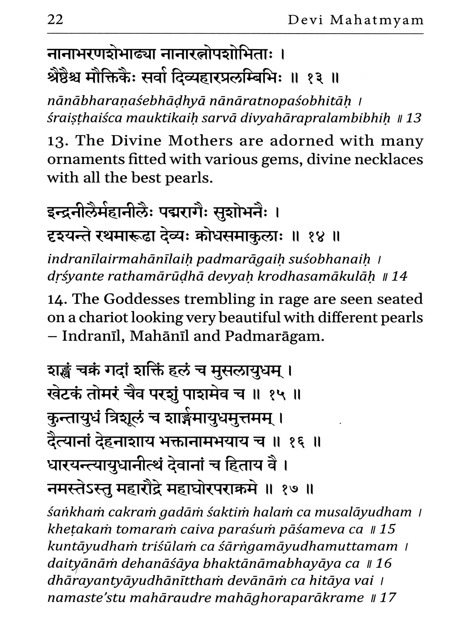 To call on God as Mother is a most characteristic feature of Hinduism. Sri Ramakrishna has shown in his life that to adore God in this way is best suited for this age. Mother-worshippers like Ramaprasad, Kamalakanta and other also have inspired Bengal with this doctrine. Bengali Hindus are beside themselves with joy at the time of the autumnal festival of the Mother, when the Mother is worshipped for four days continuously in hundreds of earthen images. The Devi-Mahatmya is chanted as part of the worship. Devi-cult and Devi-Mahatmya are popular all over India, but their hold over Bengal is unique. Through the English works and translations of the Tantrika Texts of Sir John Woodroffe and through the Life and Teachings of Sri Ramakrishna the doctrine of God as Mother has spread throughout the religious world. My humble efforts will be amply rewarded if this translation enables the English-knowing readers to understand and enjoy the work which is one of the most important texts of this cult.