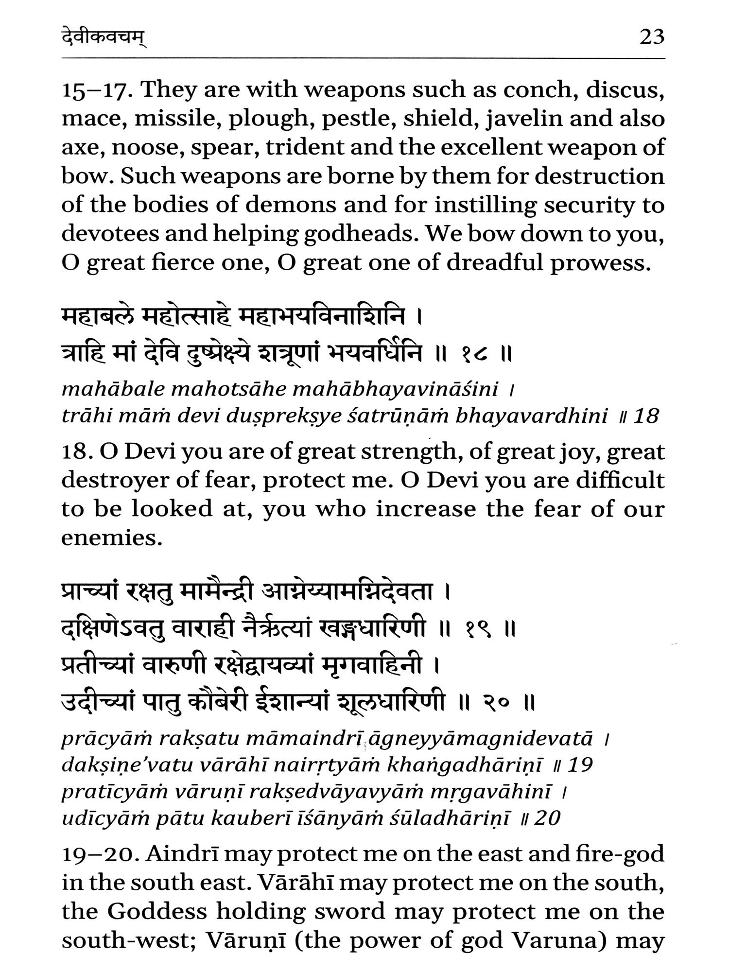 The translation made in this book is literal as far as practicable and I hope, will help the reader to understand the original Sanskrit. The hymns to the Devi in the cantos I, IV, V & XI are so sweet and sublime that they should, if possible, be chanted in the original. Footnotes are given from the commentaries to clarify difficult terms and proper names.