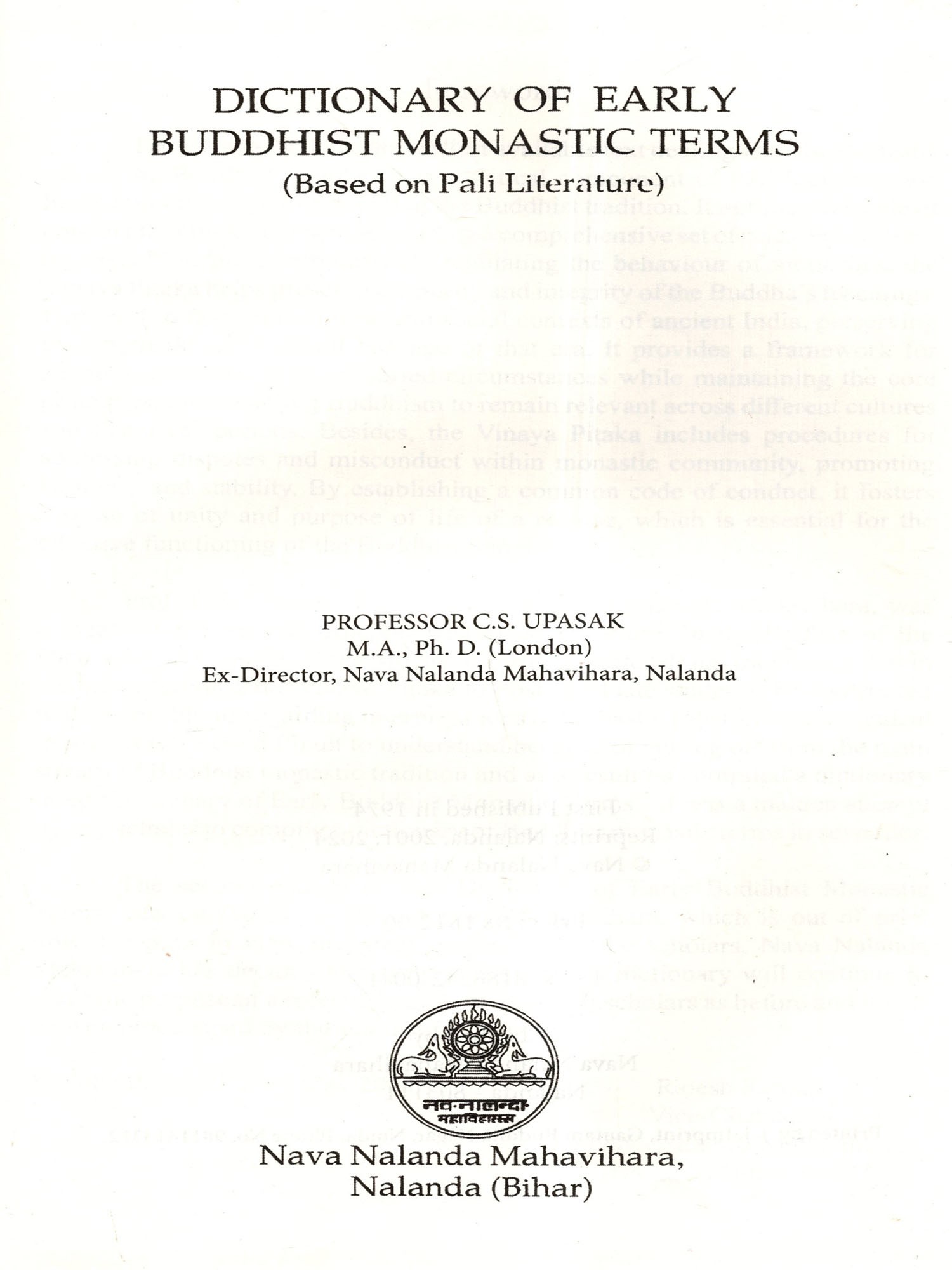 Prof. C.S. Upasak, former Director, Nava Nalanda Mahavihara, was a great scholar of Pali, Ancient History and Culture. In the Preface of the Dictionary of Early Buddhist Monastic Terms, he himself has mentioned that in course of teaching the Vinaya Pitaka to Post Graduate students, he confronted with the problems regarding interpretations of monastic rules and ecclesiastical terms, which were difficult to understand because of cutting off from the main stream of Buddhist monastic tradition and as a result he compiled a dictionary titled 'Dictionary of Early Buddhist Monastic Terms'. It was a maiden attempt by any scholar to compile a dictionary of Buddhist monastic terms in seventies.