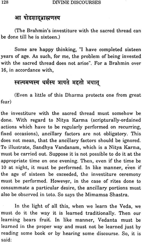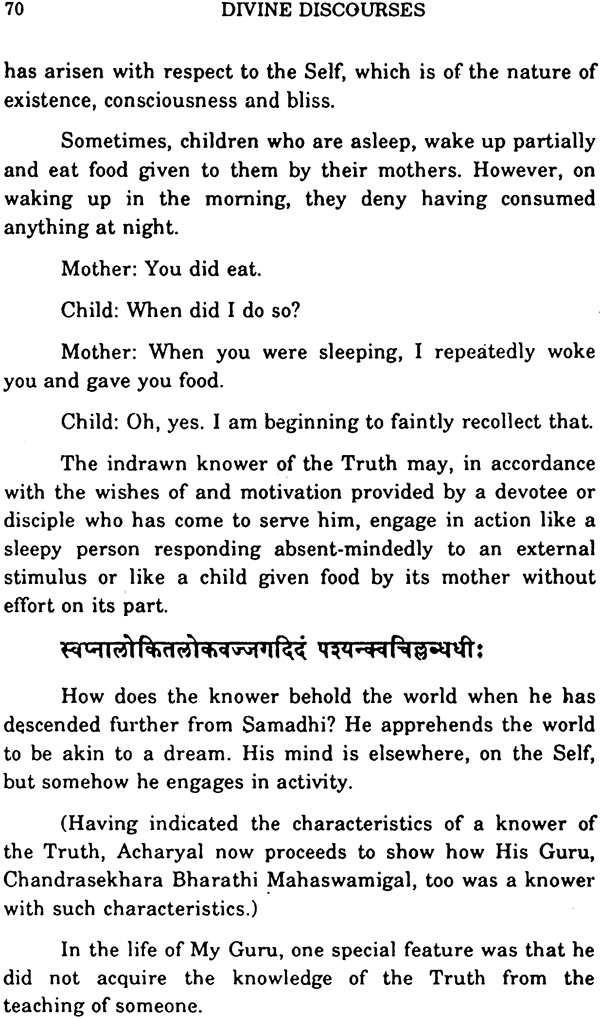 A rare sage, who renounced the world before completing 14 years of age and who attained Nirvikalpa Samadhi, the highest state of Yoga, before He was 20, His Holiness Abhinava Vidyatheertha Mahaswamigal was a renowned Jivanmukta and a scholar par excellence in Tarka and Vedanta. He adorned the sacred Sringeri Sharada Peethan and brought great glory to it during the 35 years of His pontificate as its 35th Jagadguru Shankaracharya. The very embodiment of compassion, the Acharya graced innumerable devotees in myriad ways. His numerous benedictory addresses in Sanskrit, Hindi, Kannada, Telugu and Tamil were characterised by lucidity, cogency, practicality, humour and accurate exposition of the intricacies of the scriptures. This book contains eleven of His gracious talks delivered in the three years preceding His Mahasamadhi on September21, 1989.
