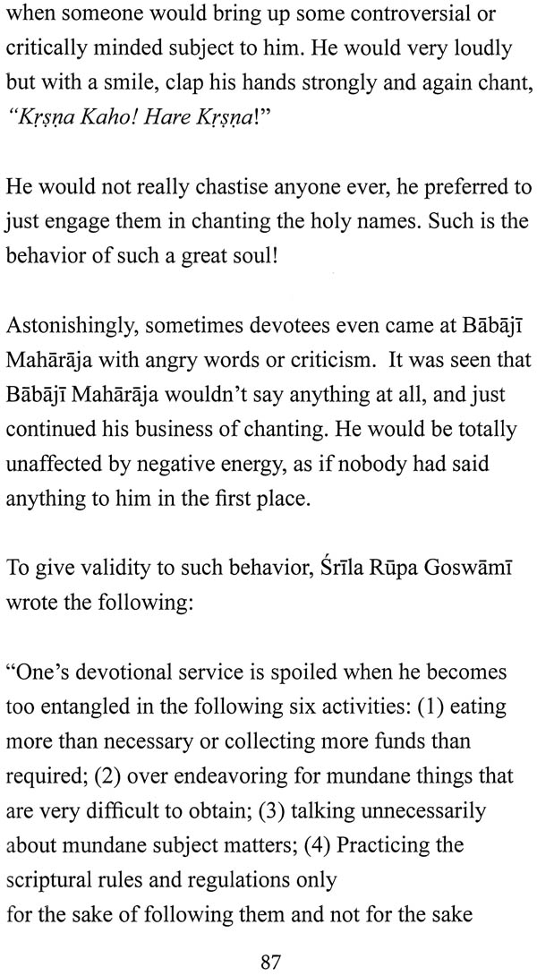 Because I visited India only twice, in the early 1980s, I only met Babaji Maharaja briefly on a couple of occasions. I do remember how delighted I was to encounter him when he joined us on parikrama in Jagannatha Puri in 1980. Another day during that visit a friend and I decided to visit the §ri Caitanya Gaudiya Math located where Srila Bhaktisiddhanta Sarasvati Thakura, our grand spiritual master, was born. As we crossed the courtyard toward Srila Sarasvati Thakura’s - room, we heard the sound of a mrdanga. Then my hair stood on end as I recognized Krsna Dasa Babaji’s voice chanting the Hare Krsna mantra. I stopped, looked at my friend, and whispered, ‘""That’s Babaji Maharaja." He nodded back in assent. And there he was, sitting at the foot of his spiritual master’s bed, eyes closed, playing mrdanga and chanting like no one else could. We struggled with competing impulses: enter the room and join him, or, fearing we may disturb his mood, stay outside and just listen, drinking in that mood from a distance. We chose the latter, sitting outside the door, just out of Babaji’s sight, until he was done. Only then did we dare to enter, but only to offer obeisance, thank him, and take our leave.