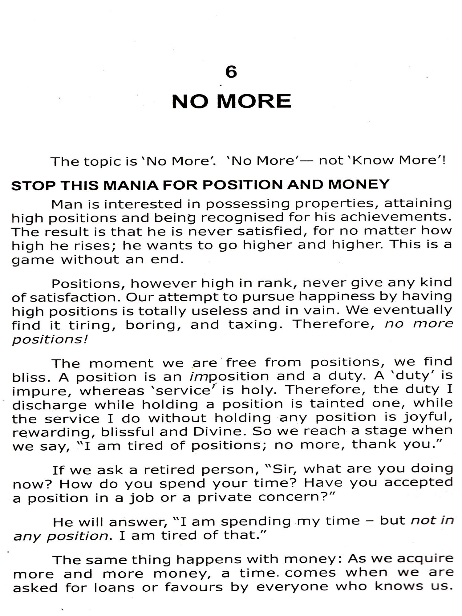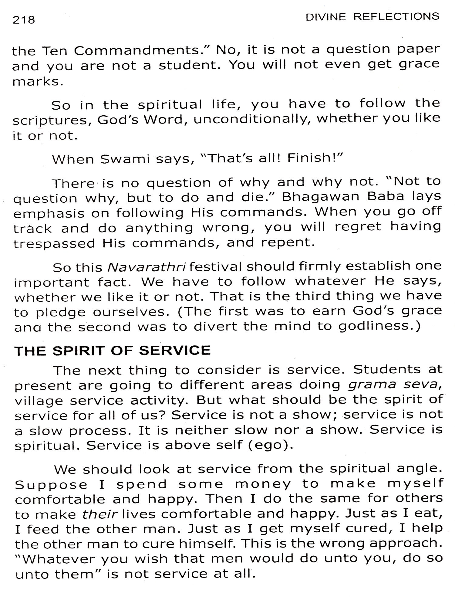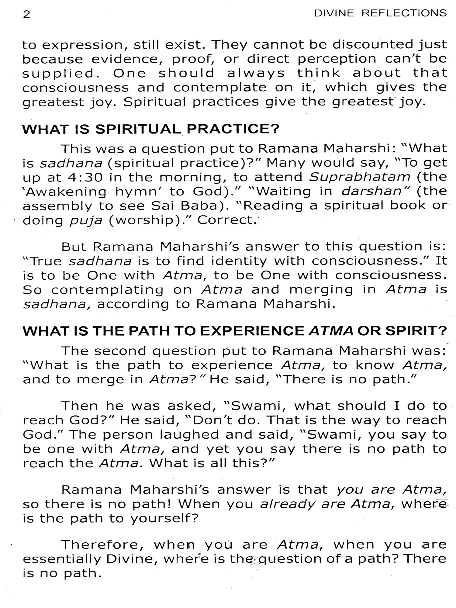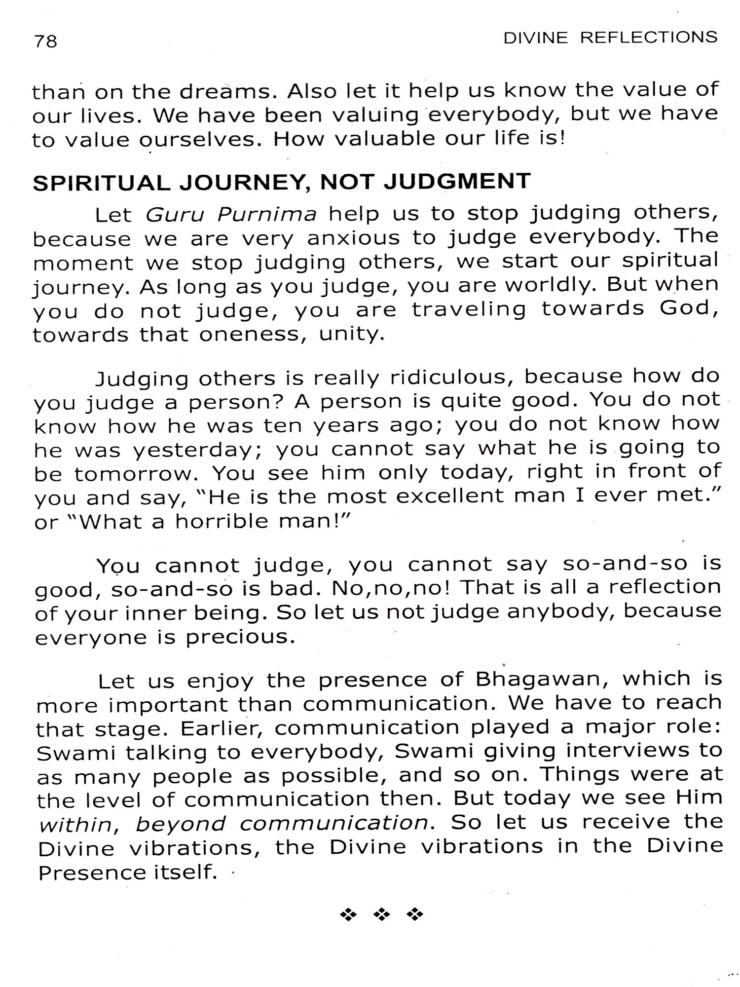 Bhagawan Sri Sathya Sai Baba's expositions will appease the healthy appetite for spiritual investigation and metaphysical realization of the infinite. Baba opened a fresh path. All the divine discourses of Bhagawan are scholarly to the core and essentially philosophic. We express our deep gratitude to Bhagawan whose wonderful manifestation is mysterious universe, who lights up all souls great and small and from whose grace spring all our tiny activities, before whose might all earthy grandeur is but dust and glamour. Bhagawan gives a concise and succinct account of spirituality as distinguished from Incorrect and conflicting interpretations on the one hand and misrepresentations of adverse schools on the other. His traditional method of presentation elucidates the central theme of Sanathana Dharma and convincingly reconciles all apparently conflicting doctrines. Bhagawan's wisdom contained in His work and discourses ensures everyone an equally clear vision of its powerful and eternal message. It is a message which cannot fail to touch the minds and spirits of all those who will reach for it. We seek comfort and enlightenment within the message, Bhagawan's views are practical and help to resuscitate and strengthen the mind and emotions. This directs us towards selecting the most useful and effective options in life. There is an eradication of ego and of our insatiable desires. The title of this book DIVINE REFLECTIONS makes it self-explanatory. Yet it is much more. It is a journey of discovery, for that, which always has been and still is there, within us, but cannot be found. This is the hidden splendour. We also come across instances when Baba pin-points the problems and weaknesses that we have to face and cope with. Bhagawan changes our thinking and attitude. All that we can do is to live by Bhagawan's teachings and pray that Swamy guides us at all times. He is doer. Our job is to do whatever He directs us to do with His divine grace. Baba's teachings are sure to bring a smile in our life whenever we are obedient to them in our words and deeds. Swamy will continue to remain by us eternally. We decide to place Him and not any one as we keep on doing our duty. We learn to thank Him in all conditions, circumstances and in all incidents of life. These are the lessons we learn in our Satsanghs, as we understand Swamy's teachings.