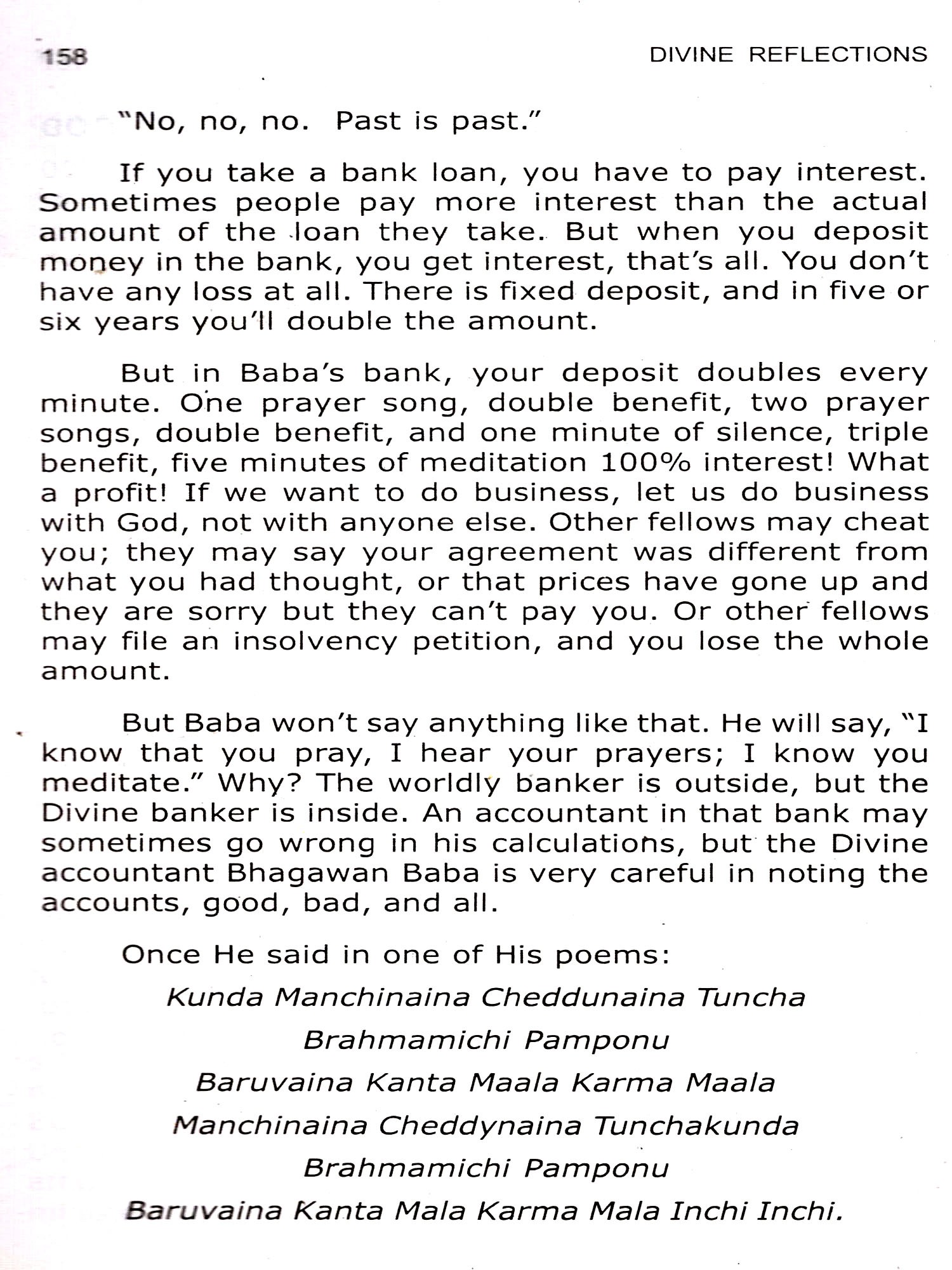 I'm much indebted to Prof. P.V. Vaidyanathan, Thiruvananthapuram, Kerala who read the type script, edited and finally brought out the present book 'DIVINE REFLECTIONS' placed in your hands now. I feel inadequate in my expression to thank Prof. P.V. Vaidyanathan for all valuable advice and help. I'm profited by the suggestions and support by V. Bhadran, District President, Sri Sathya Sai Organizations, Thiruvananthapuram, Kerala and Prof. Mukundan, State President, Sri Sathya Sai Seva Organizations, Kerala. I'm very greatful to all of those brethren for encouragement and pray Bhagawan to shower His choicest blessings to continue to spread His divine message.