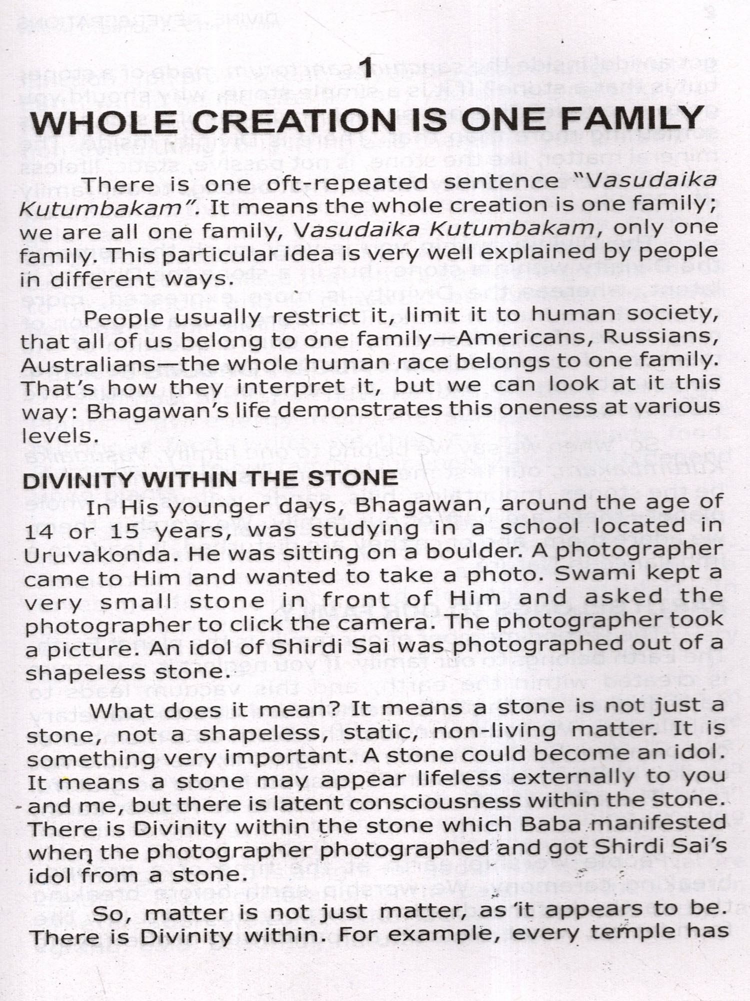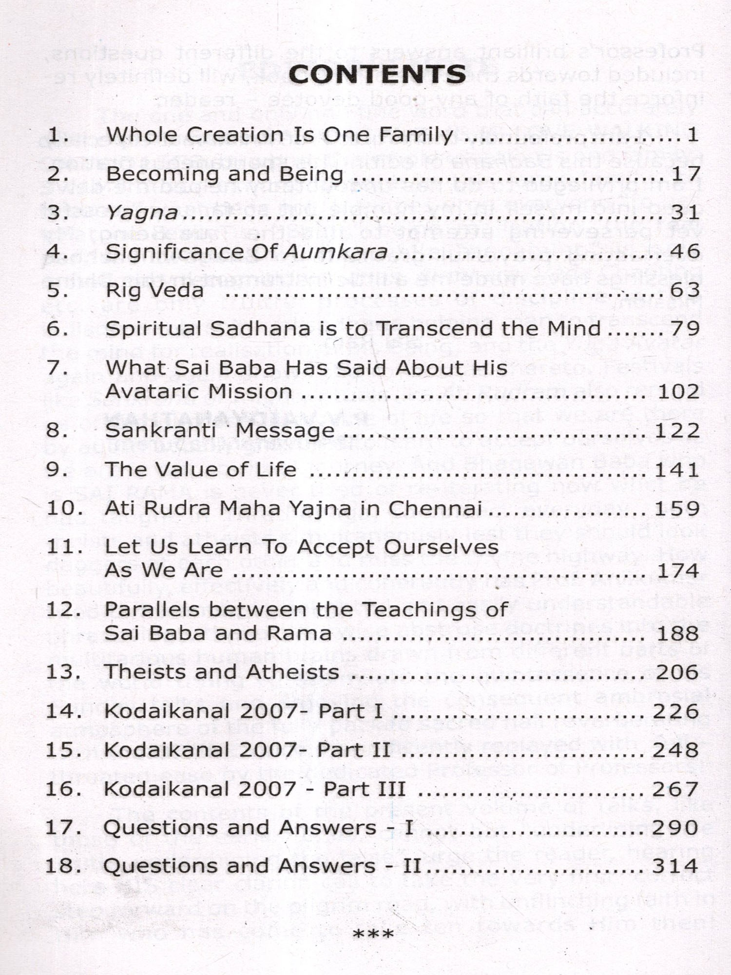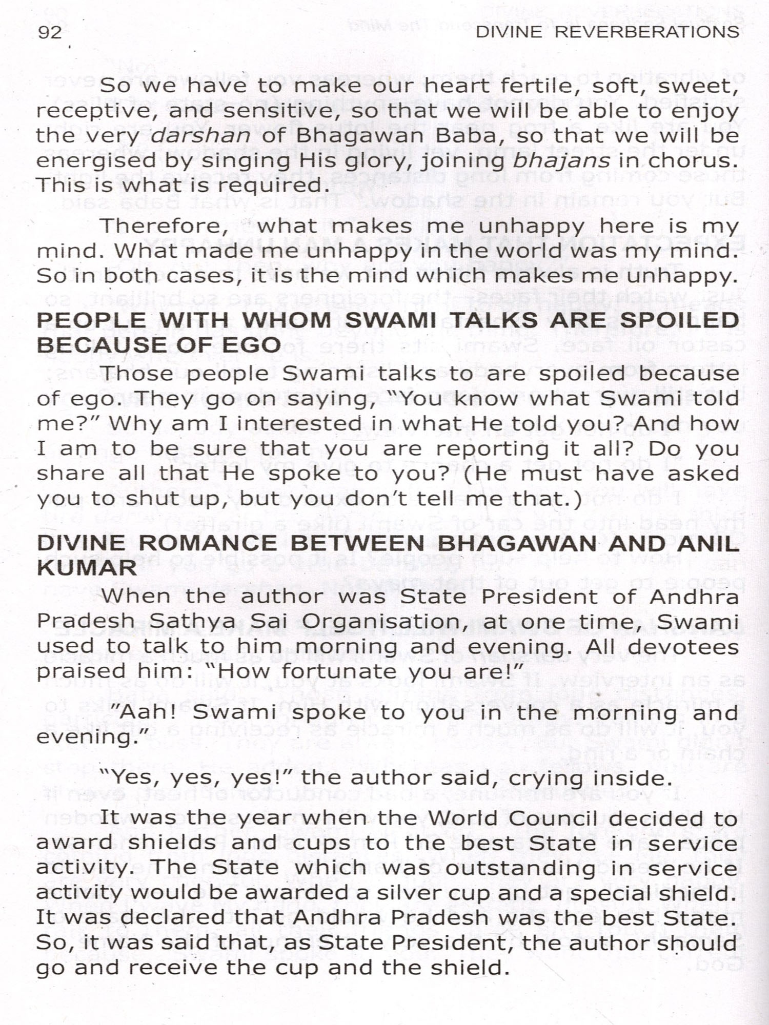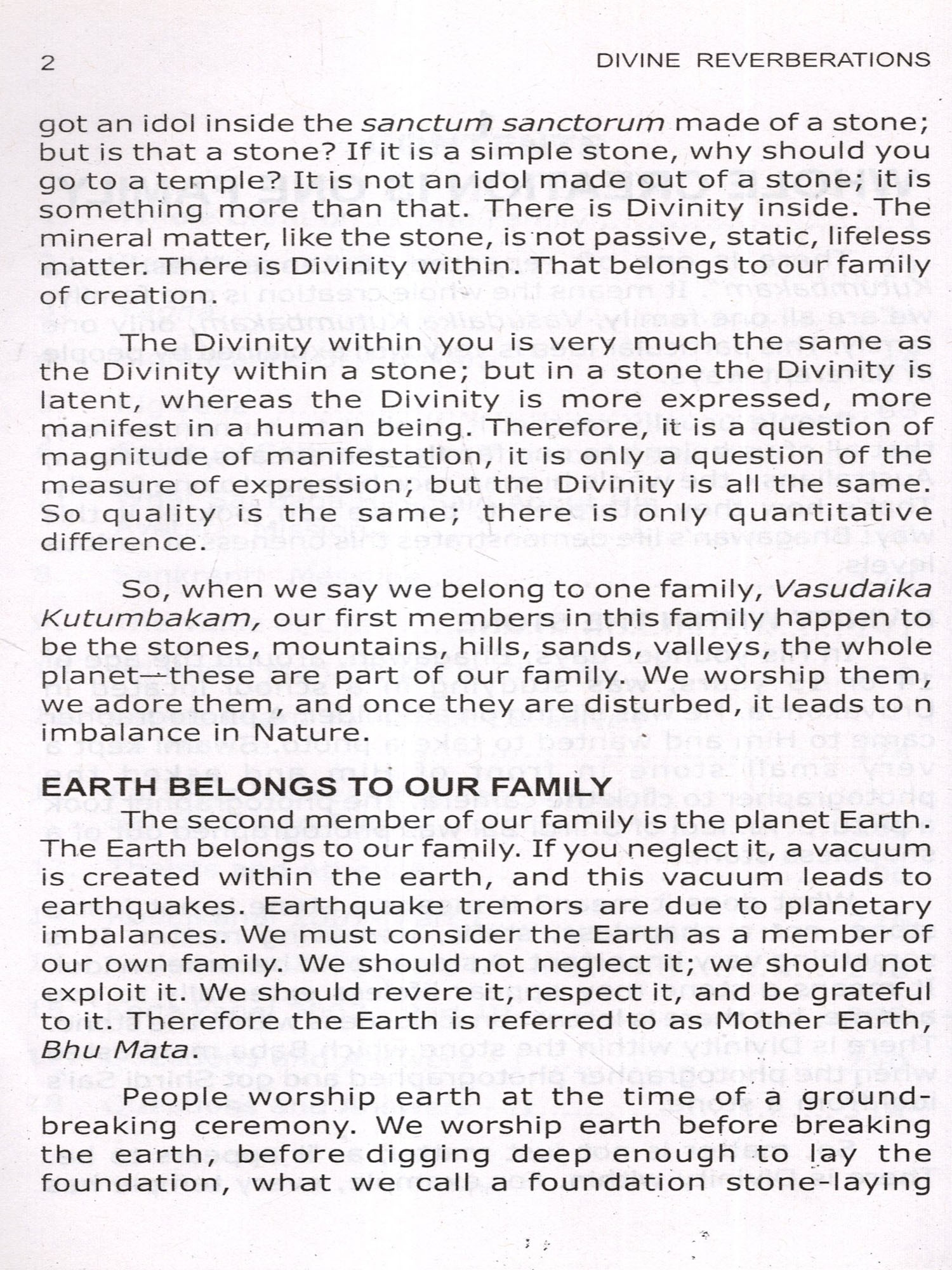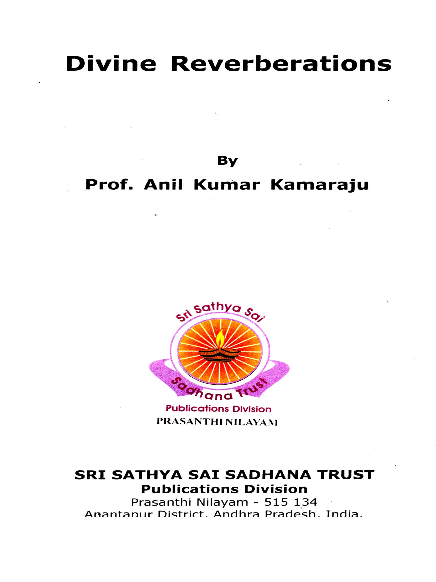 We humbly place in the hands of our readers the present book DIVINE REVERBERTIONS. It is His sheer grace and will that enabled us to bring out the present volume. I express my heartfelt gratitude to Prof. P.V. Vaidyanathan, Thiruvananthapuram, Kerala for going through all transcriptions, edit and finally compiling in a book form. I am highly indebted to him. I profusely thank Sri V. Bhadran, District President, Sri Sathya Sai Organisations, Thiruvananthapuram, and Prof. Mukundan, State President, Sri Sathya Sai Organaisations, Kerala for their love and support.