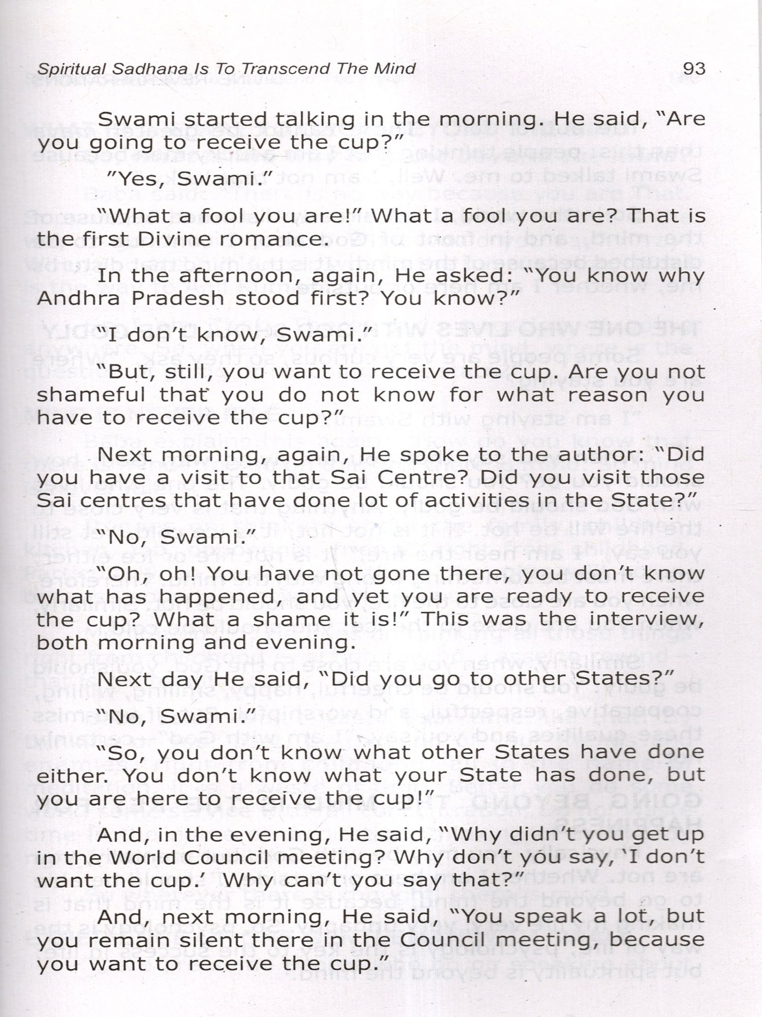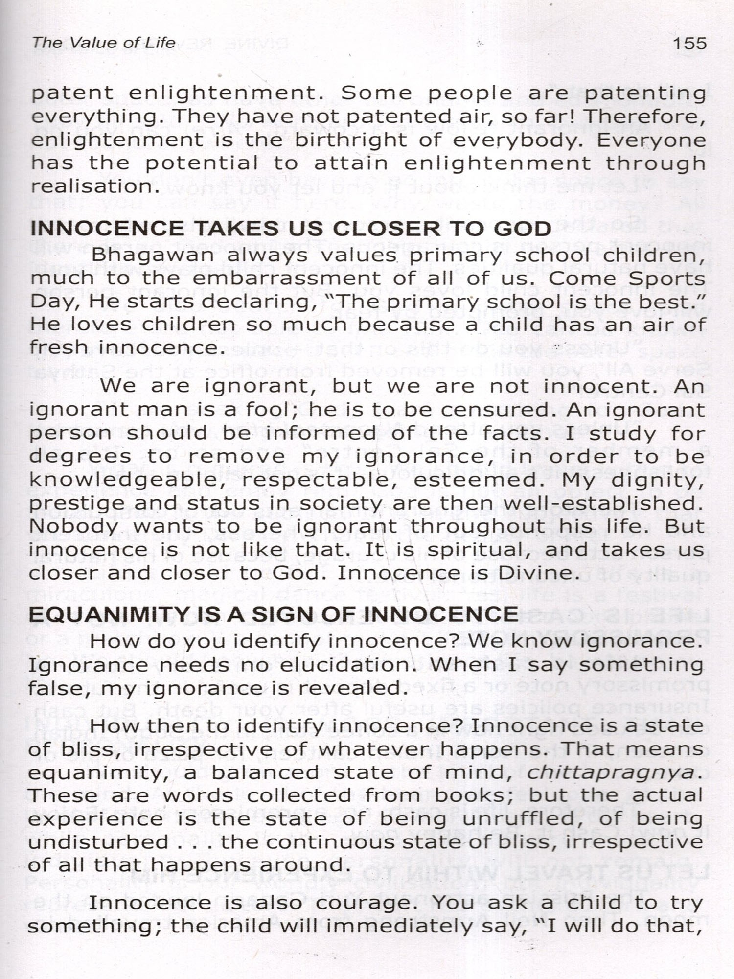 Bhagawan Baba is a boon to our generation. His teachings vitalize our cultural heritage. His message of compassion, His profound emphasis on high values and His divine expression of truth elevate our emotions and refine our inner being. Bhagawan Sri Sathya Sai Baba's teachings are influencing steadily and powerfully world leadership and world populations. How wonderful that He moves us so deeply, turning our lives Godward moulding us into a family of spiritual aspirants dedicated to bringing His message of love ever more clearly and fully into all we do. Many have learnt the value of intellectual surrender and humility and many have become quiet creative beings. He states that the minds and hearts of people need to be changed. Baba looks after the entire Universe, but never neglects the individual soul. No change is possible by the sect we profess or the label we wear or the slogans we shout, but only by the work, the industry, the sacrifice, the honesty and purity of character. The Saipath leads to serenity of spirit through surrender of the unsteady mind. Our task is to find our personal place in His divine mission. It is for each of us to assume our minute share of the spiritual revolutionary task of building a world based on love. It is for all to benefit by the flow. He represents the totality of Cosmic energy. To share the moments of joy of His divinity is an opportunity of life. This is my conviction in giving Sunday talks at Prasanthinilayam. Bhagavan Sri Sathya Sai Baba is not only a living divinity but also a living deity. To see the Seer the inner vision has to be cultivated. This can be grasped only by means of genuine faith. We shall be profited by His Ganga of spirituality and the Jamuna of morality. Bhagawan is all light and all illumination, all knowledge, all love, all benevolence and benediction rolled into one.