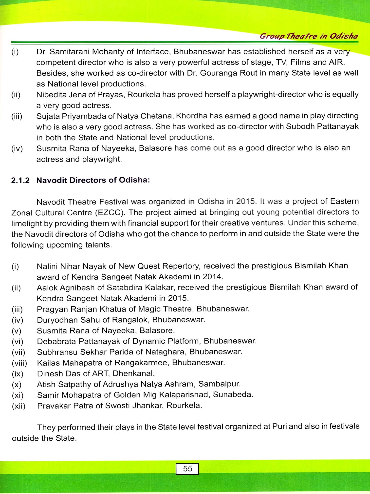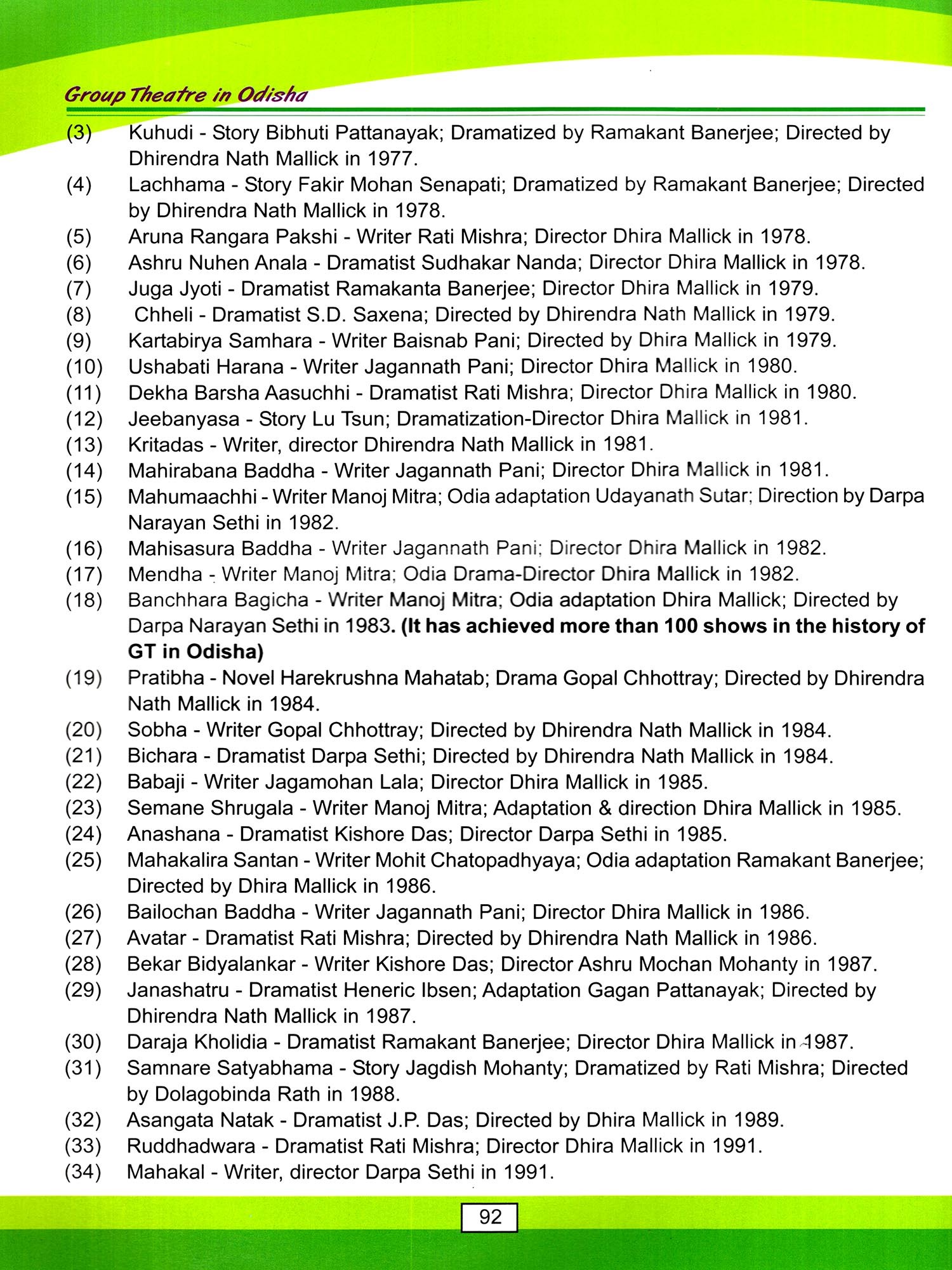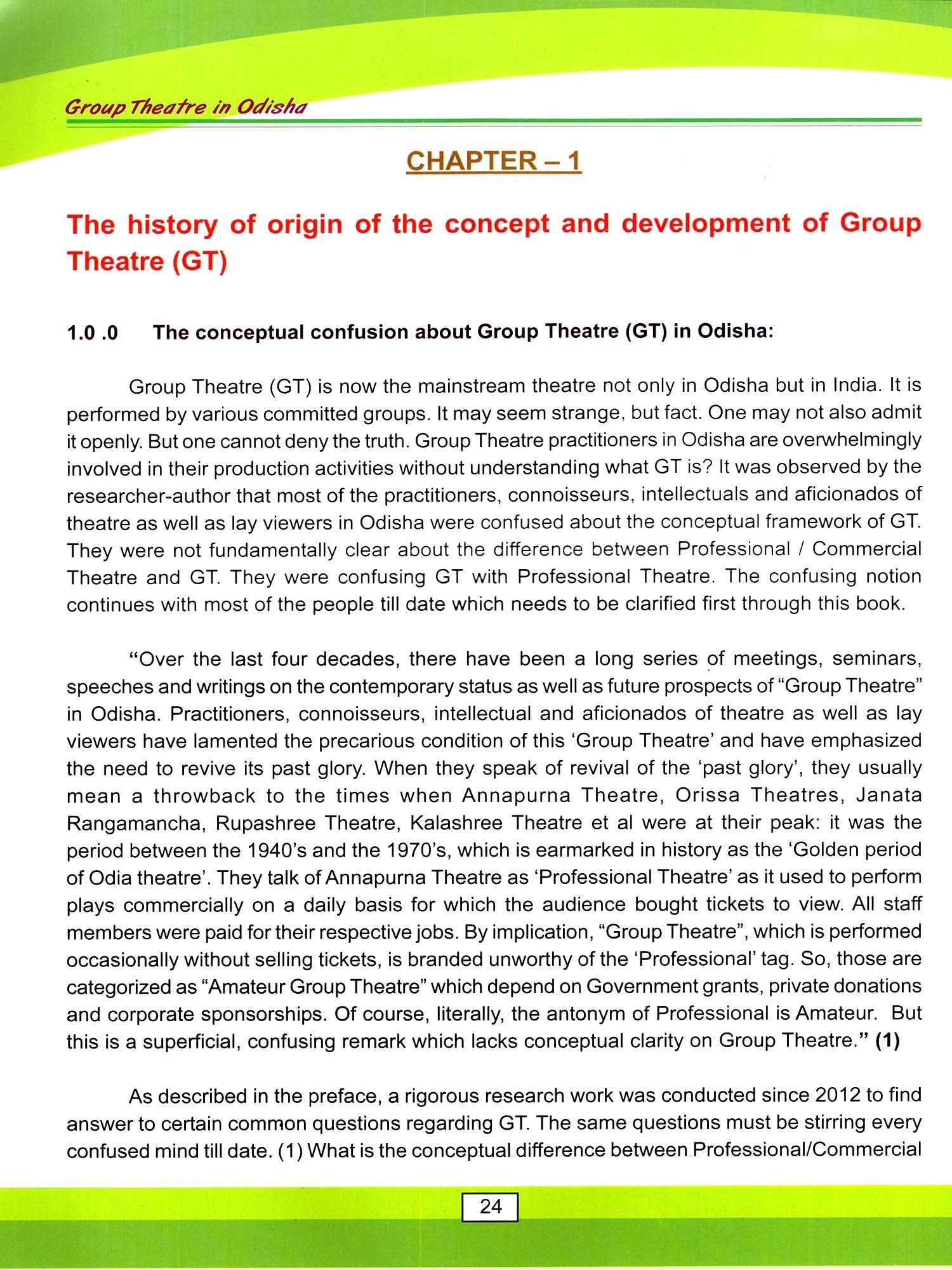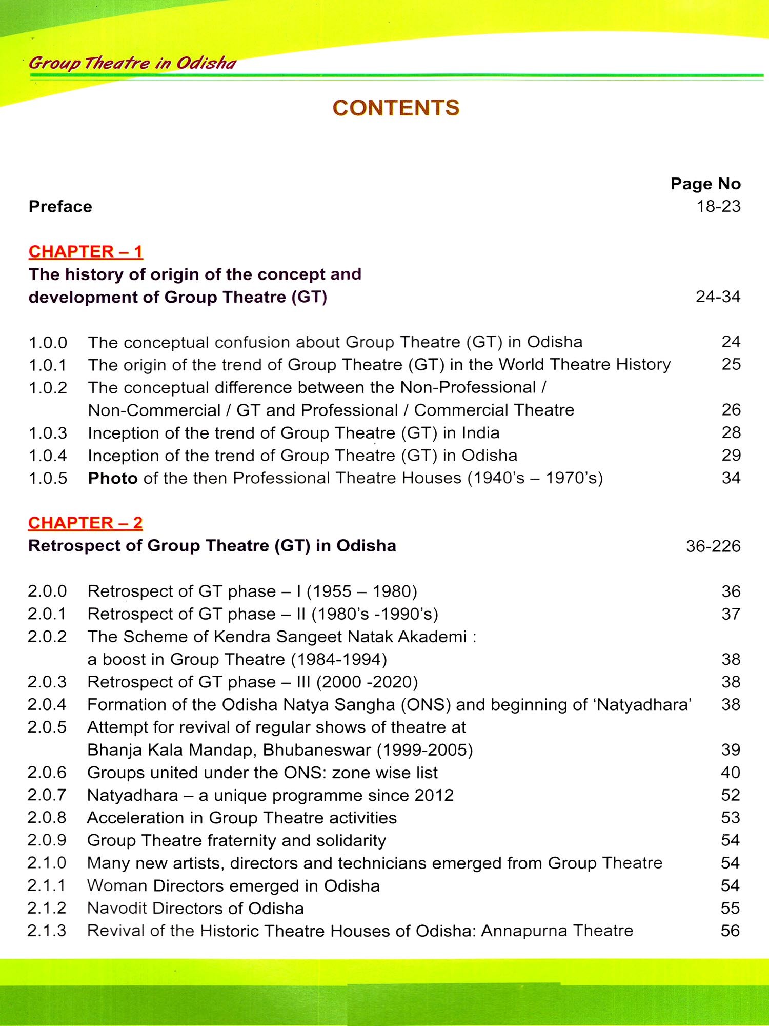 I am very glad that they have prepared the research-based unique book titled "A documentary history: Group Theatre in Odisha (1955-2020)" which is published by Odisha Sangeet Natak Akademi (OSNA). So far, my knowledge is concerned there is no book either in Odia or in English covering the history of Group Theatre (GT) in Odisha. This first book in English will be an eye-opener as it brings into limelight the origin and development of GT as well as clarifies the conceptual difference between GT and Professional / Commercial Theatre. The book is first of its kind in Odisha (may be also in India) which contains more than 900 photographic documents on the history of GT in Odisha. Besides, it contains valuable, authentic information to know our contemporary theatre-culture in Odisha. The book will be definitely helpful both at the State and National level.