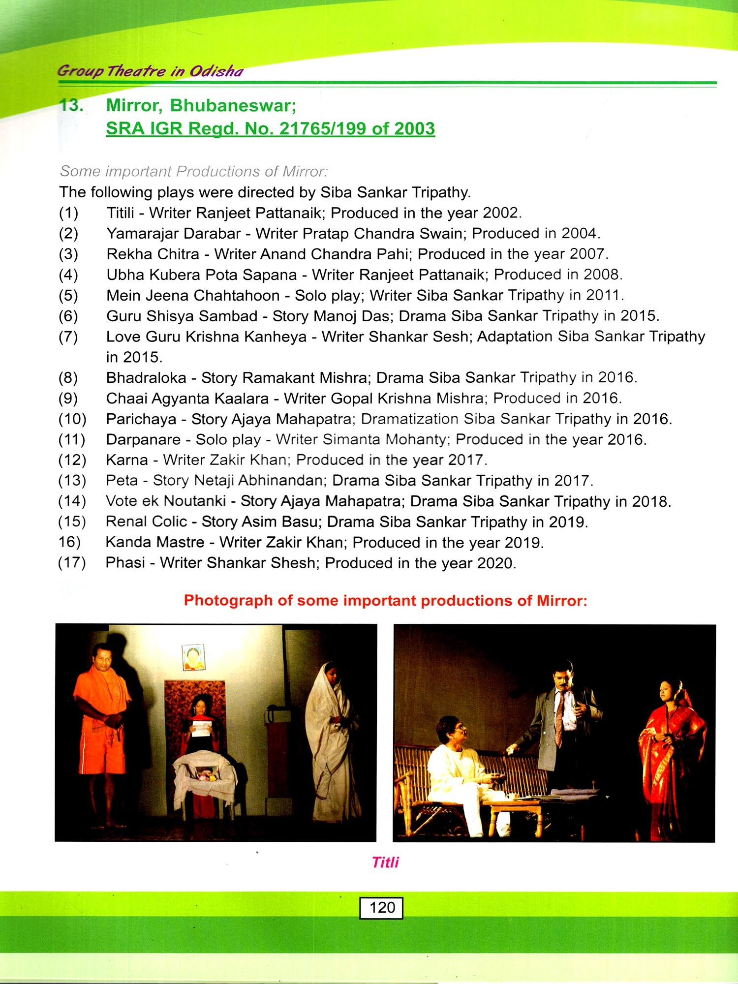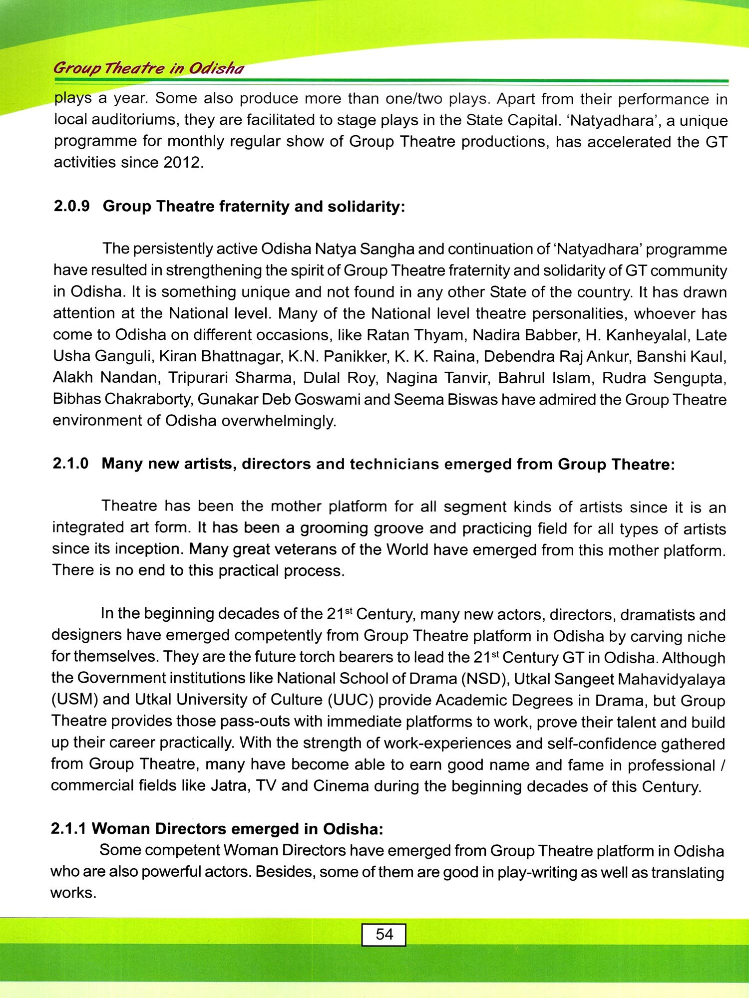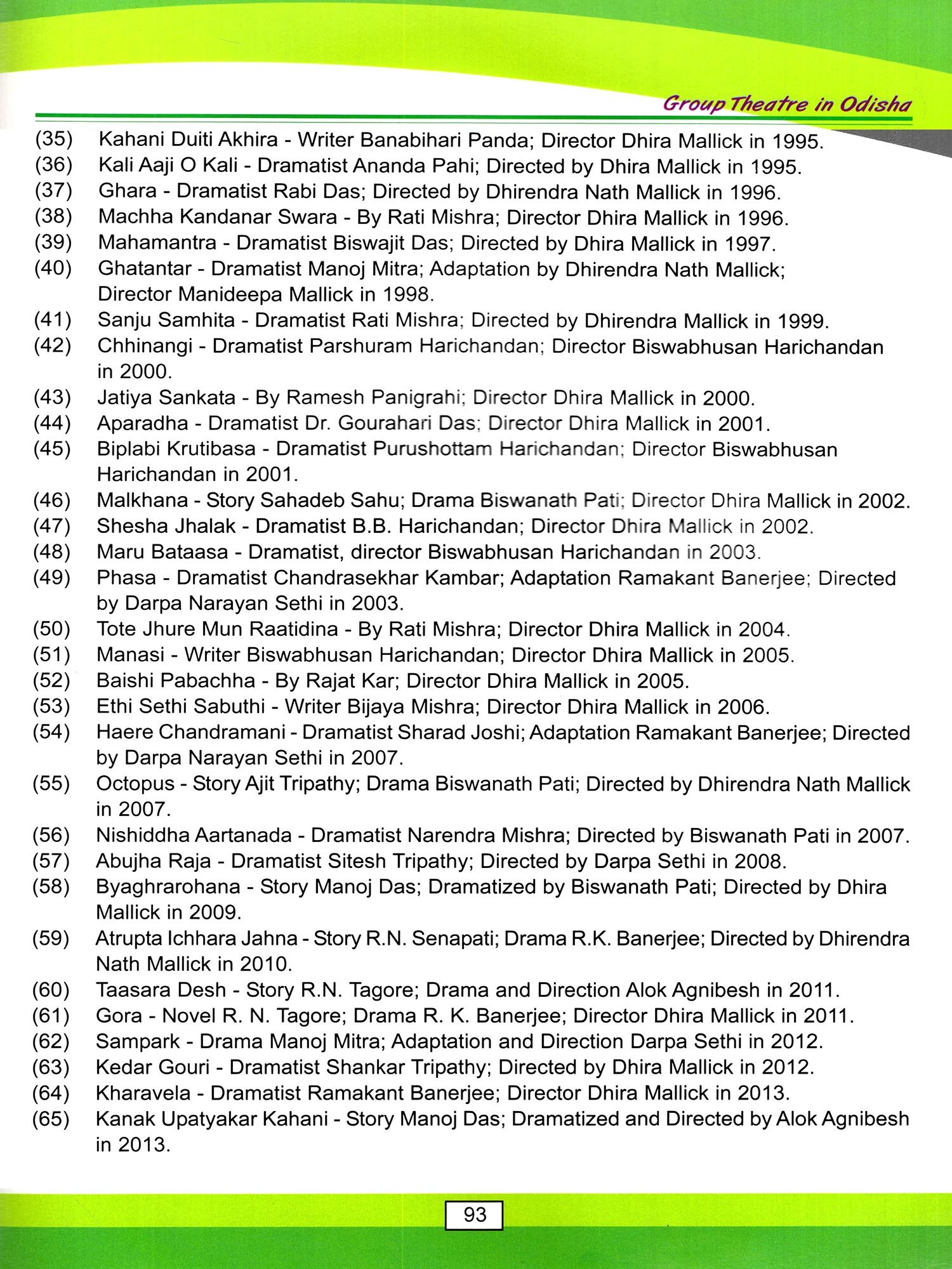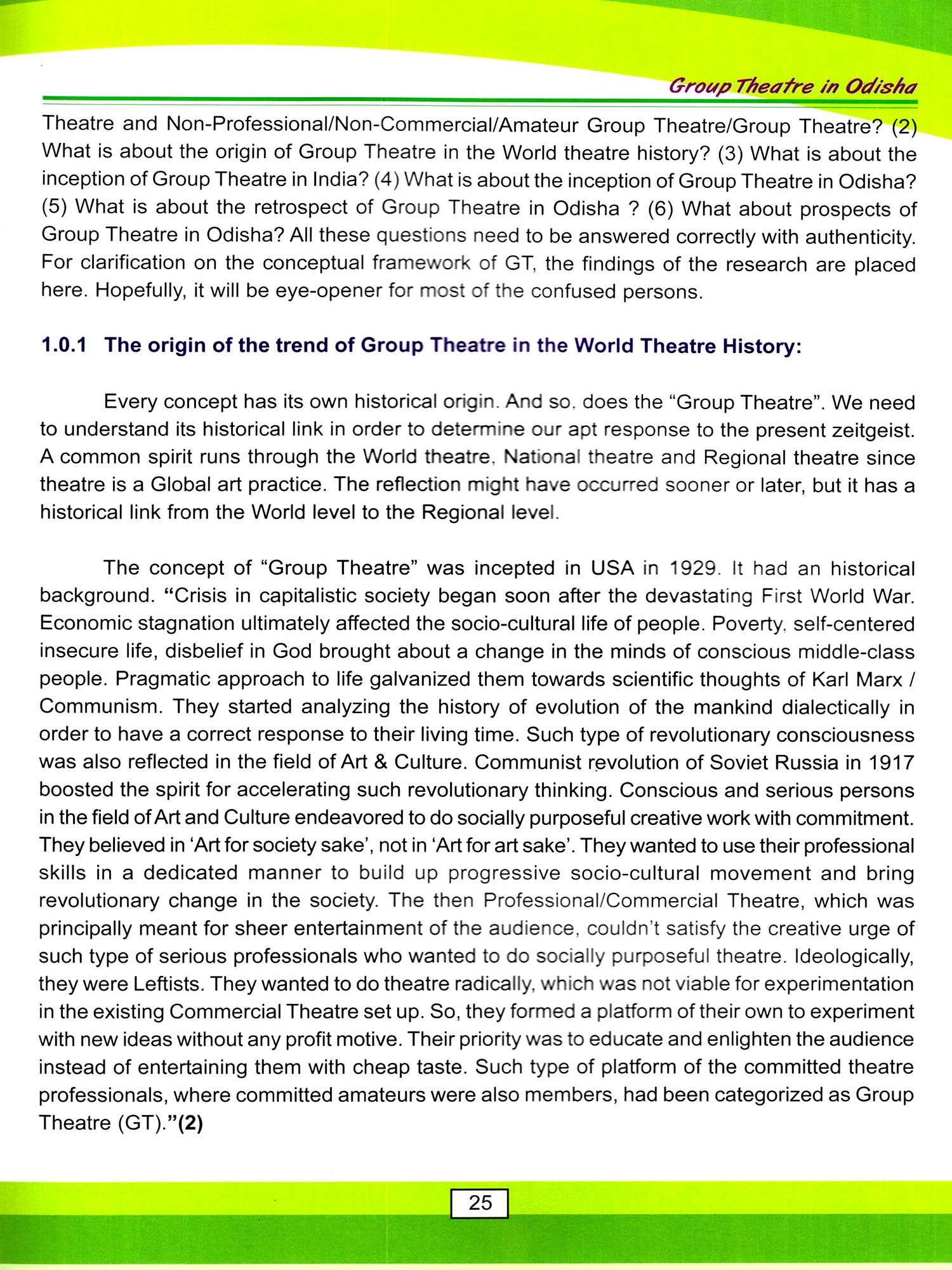 I am very glad that they have prepared the research-based unique book titled "A documentary history: Group Theatre in Odisha (1955-2020)" which is published by Odisha Sangeet Natak Akademi (OSNA). So far, my knowledge is concerned there is no book either in Odia or in English covering the history of Group Theatre (GT) in Odisha. This first book in English will be an eye-opener as it brings into limelight the origin and development of GT as well as clarifies the conceptual difference between GT and Professional / Commercial Theatre. The book is first of its kind in Odisha (may be also in India) which contains more than 900 photographic documents on the history of GT in Odisha. Besides, it contains valuable, authentic information to know our contemporary theatre-culture in Odisha. The book will be definitely helpful both at the State and National level.
