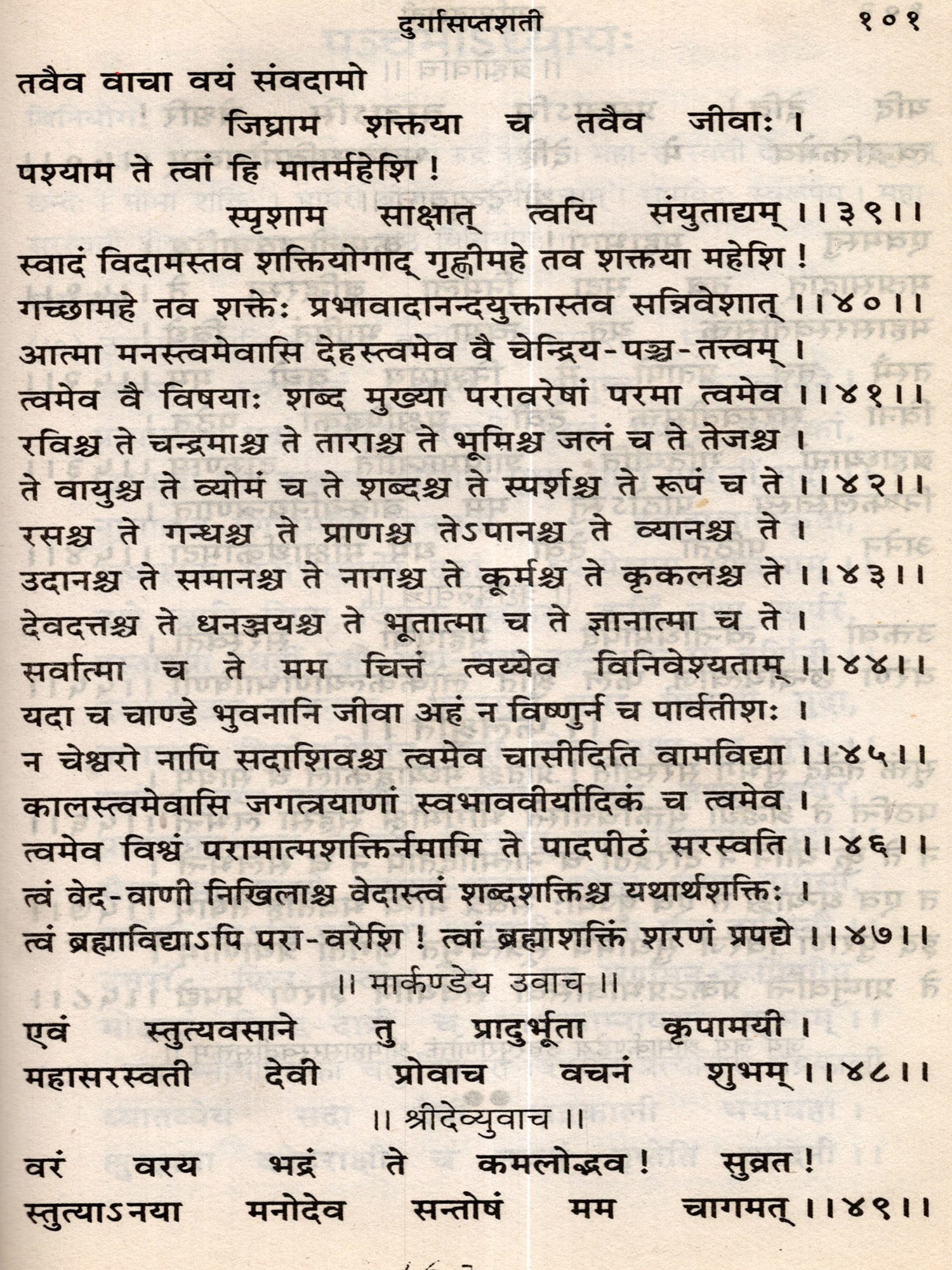 "ऋषिप्रवर मार्कण्डेय आठवें मनु को पूर्व कथा के माध्यम से नृपश्रेष्ठ सुरथ एवं वणिक् श्रेष्ठ समाधि को पात्र बनाकर मेधात्रऋषि के मुख से भगवती महामाया के जिन स्वरूपों का वर्णन किया है वही सप्तशती का मूल आख्यान है।"