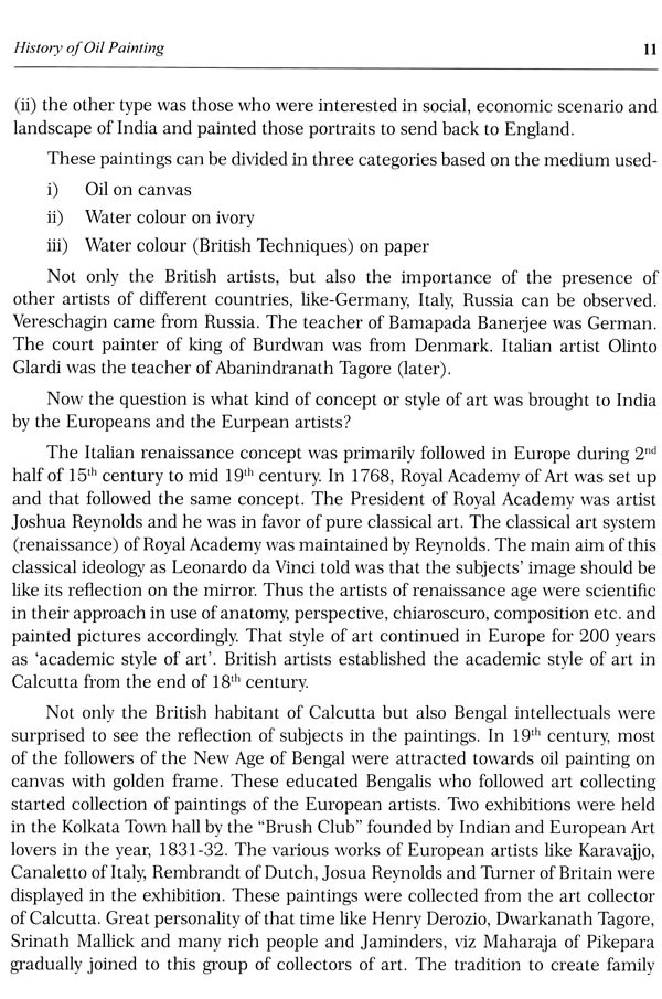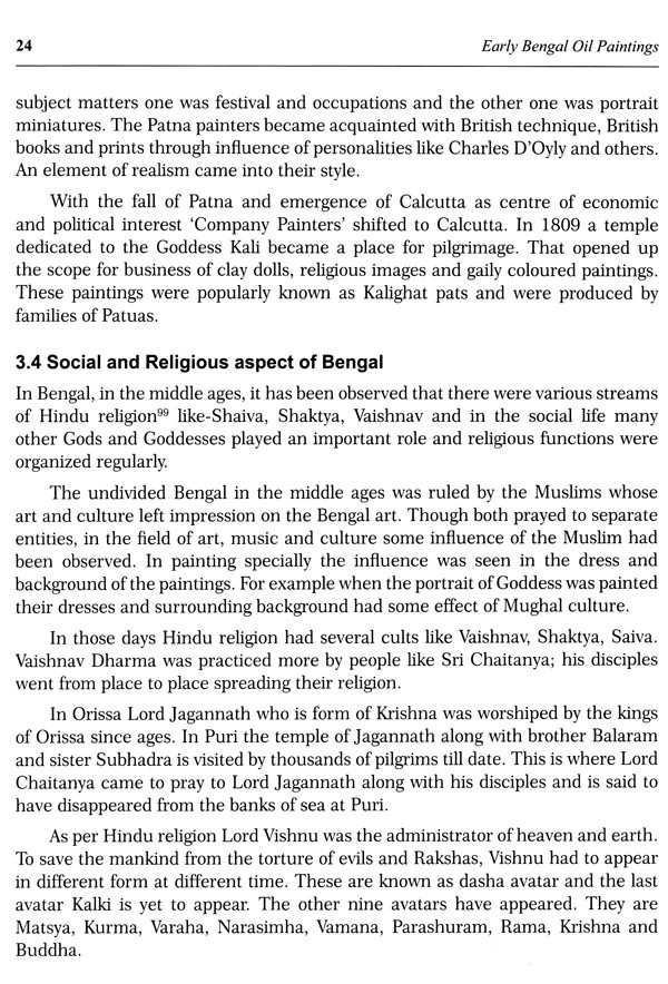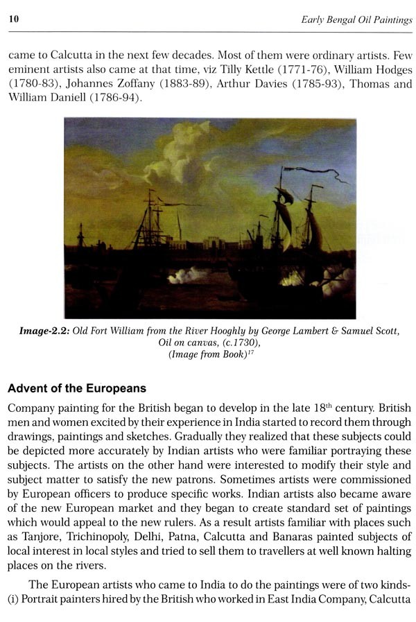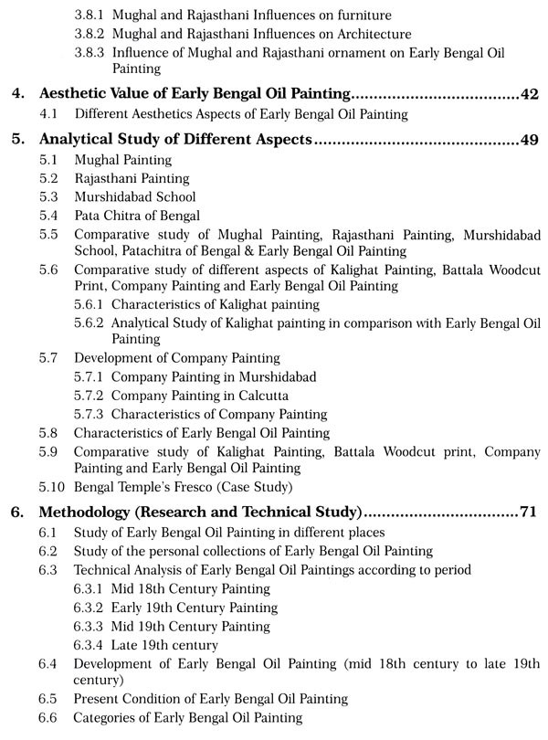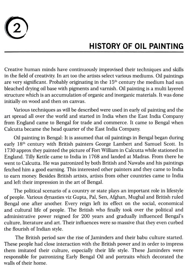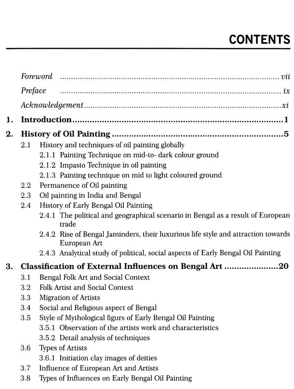 Art, literature, architecture are expression of man's creative self. Influenced by time, place and personalities art has its varied expressions. It can never be restricted within boundaries. Choice of medium is significant for any artist's creative expression. 15 century Europe saw the development of a new medium of oil paint. Innumerable renowned paintings were created through this medium. Jan Van Eyck of Netherland is credited with the invention of the medium and technique of oil paintings. Oil painting developed from Tempera medium and gained popularity in 15th century in Venice. Tempera and Gouache were the traditional and conventional medium in the realms of Bengal art and painting also. The medium of oil was gradually introduced in the realms of Indian Art by European painters. When the Europeans who included Portuguese, Dutch, French others and finally British emerged in the Indian scenario with their business ventures, apart from political and social interactions, economical influences were also observed in the field of art. Europeans encouraged paintings of environmental scenario, flora and fauna, social customs and traditional practices of their new found land. These paintings fulfilled purpose of photographic documentation of the milieu. They were popularly known as Company paintings. The Indians on the other hand, got exposed to the western world including art and culture. Being influenced, as well as to impress the Europeans, powerful traders and Zaminders (landlords) ventured for construction of palatial buildings along the banks of Hooghly near the European settlements especially in Chandannagar, Chinsurah, Kolkata and Nasipur. European artifacts were acquired for the purpose of adorning those houses. It was during that period interest for western oil paintings developed among the affluent cultured Bengali personages. Under their patronage the Indian painters were initiated into using the new medium of oil and a distinct genre of painting originated which is termed as Early Bengal Oil Painting. However, the history of these paintings and their techniques have not been surveyed in details. This book is an effort to unveil the lesser known and lesser published history of Early Bengal Oil Painting. The importance lies not only in about the glorious creations of a unique period of amalgamation of western and Indian influences. Some myths are popular about these paintings. This writing is a venture to find justifications of the popular beliefs. Between 1770 and 1825 the European artists who visited India included 30 oil painters and 28 miniature painters. They visited many places across India including Bengal for their purpose of painting. Eminent among them were Tilly Kettle. William Hodges, Johannes Zoffany, William Hickey, Thomas Daniell, William Daniell and others. Many among them inspired Indian painters to adopt od paintings. However the Indian artists who initiated the utilization of oil medium is not clearly known. It was an era of turmoil. With the fall of Mughal and Muslim rule artists from courts of Delhi and Rajasthan migrated to Mushidabad in Bengal, and then to Kolkata for sustenance. Hence this study is an effort to establish the identity like the Darbari painters, folk painters and others in the realm of Early Bengal Oil Painting. The oil paint medium was utilized and experimented with by different categories of painters but the technique of oil medium was not mastered. It was used in indigenous style giving birth to an exclusive style neither known before nor practiced later. These unique creations are neither familiar to general public nor art lovers. However, they form an important phase of Bengal art. Many research works have been conducted about different phases of Bengal art but Early Bengal Oil Painting remain less traveled and virgin area. Critical study of the techniques of the paintings is necessary for proper realization of the excellence of the paintings. A study of history of Bengal art reveal that folk art, Company painting and Kalighat paintings were executed in water colour. Artists of Early Bengal Oil Painting created new history by utilizing a new foreign medium of oil paint. The uniqueness of style, technique and social environment of the Early Bengal Oil Painting will be focused in this study. The gradual development of the technical aspects along with modifications of style of these paintings is presented in this book. The painters were untrained in using this new medium. Hence the conventional procedures of oil paintings were not followed. A unique technique developed where the materials and tools were also unconventional for oil paintings. This aspect has not been analyzed scientifically and systematically till date. This book is a novel venture in this aspect. Not only technique and skill of the painters underwent changes with time but style also was modified.