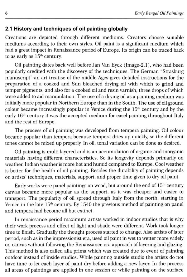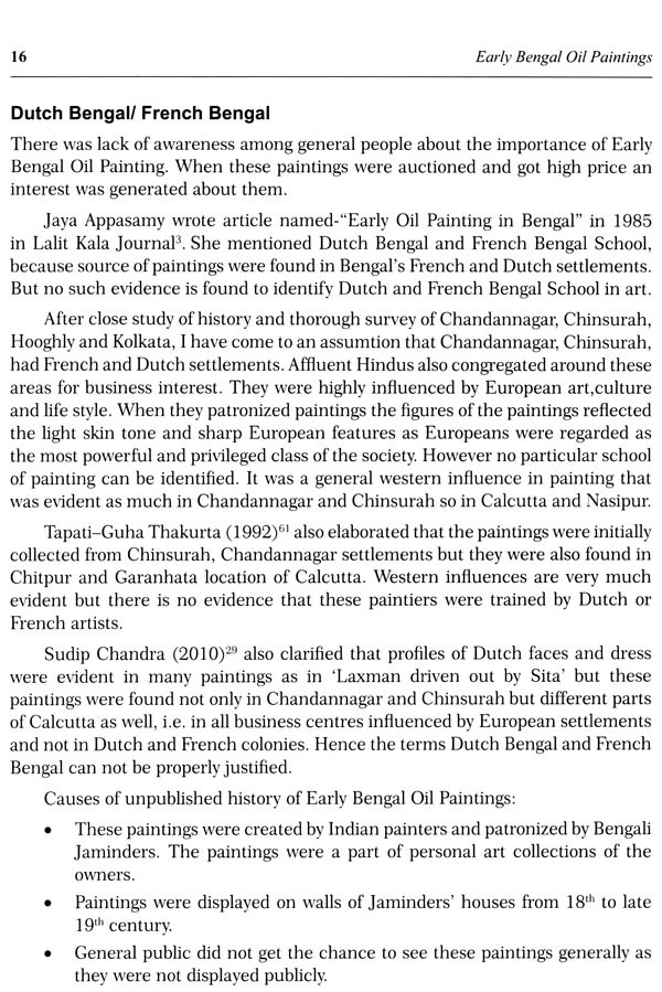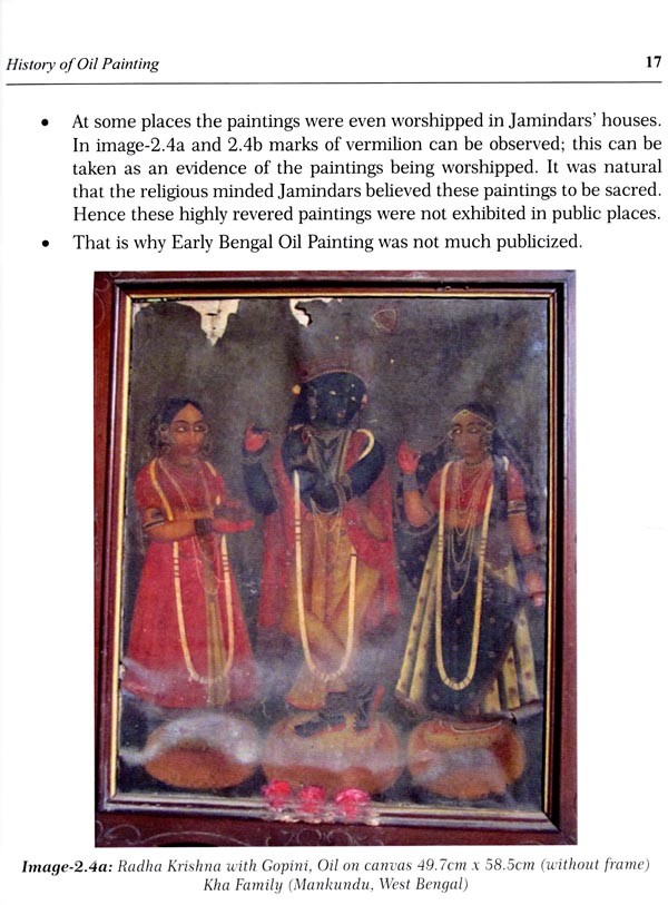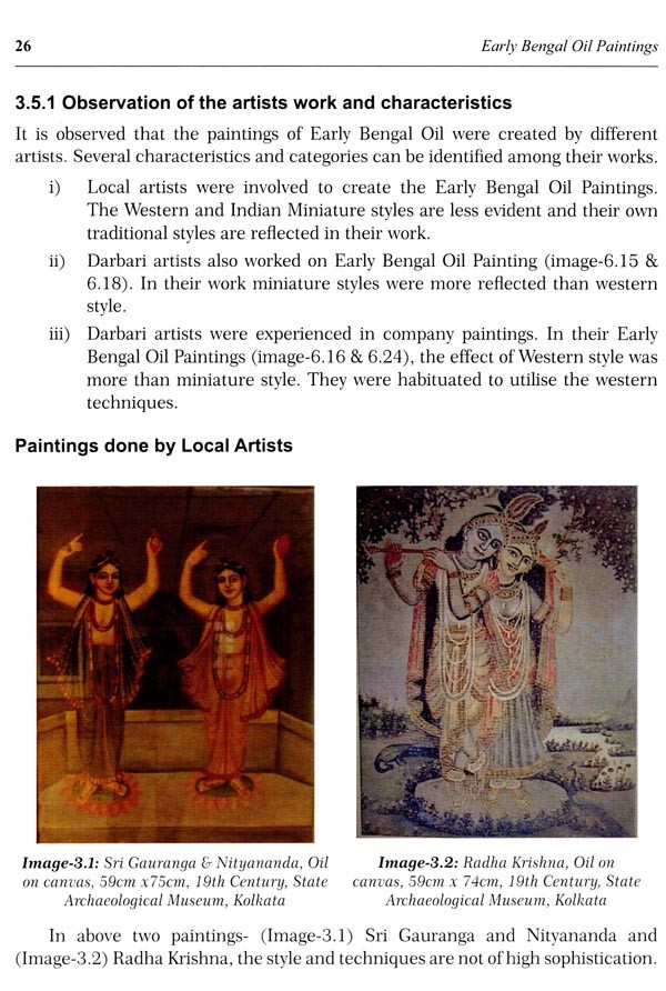 The Early Bengal Oil Painting flourished in the trading centers of Chandannagar, Chinsura, Kolkata, Nasipur and others. These places had both European settlements as well as congregation of Jaminders who traded with these Europeans. Before the advent of the British, the French had settled in Chandannagar and Chinsura had Dutch settlements. The Jaminders, influenced by European oil paintings patronized Early Bengal Oil Painting to decorate their residences and highlight their status in society. As they preferred traditional Indian theme, the Jaminders relied more on the Indian painters who included Darbari artists, local sutradhar, folk artists and patuas to execute their paintings utilizing the western medium of oil paint. Being not proficient with the techniques of oil medium, a unique style of execution developed. Moreover the traditional miniature style, Rajasthani influences and folk traditions reflected in the paintings. The Early Bengal Oil Paintings were executed between mid-18th century to late 19th century. So the paintings are now 150 to 200 years old. Natural signs of decay are evident in the paintings. The book has looked into the various aspects of technical, methodical and materials utilized in Early Bengal Oil Paintings. The various problems of Early Bengal Oil Painting in present condition are identified, like over paint, unethical restoration etc. Hence proper awareness about scientific techniques of conservation and restoration is necessary to save the paintings and related heritage for posterity. With the decline of the Jaminders (late 19th century) and change in socio-economic condition of the society this school of art lost its patronage. Hence the art declined. Besides Prints becoming available of the mythological subjects there was a decline in Early Bengal Oil Painting Simultaneously Art colleges were established and changed the scenario. As they were private collections so no historical documentation was done.