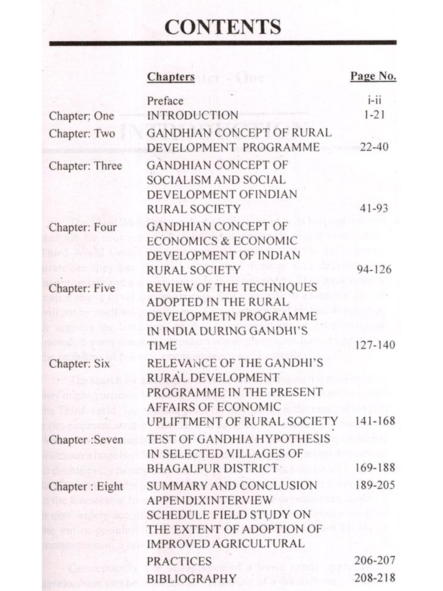 The book has been divided into eight chapters. The first chapter is an introductory and deals with research techniques used for the study. The second chapter examines the Gandhian concept of rural development. The third chapter presents the Gandhian concept of socialism and features development of Indian rural society. The fourth chapter delineates the Gandhian concept of economics relating to Indian rural society. The fifth chapter presents a review of Gandhian techniques experienced in India during Gandhi's life time in sixth chapter the relevance of the Gandhian approach to rural development has been discussed. In seventh chapter findings of the testing of Gandhian hypothesis in selected village have been presented. The last chapter contains summary and conclusion. Hence this book proves to be most relevant for those researchers and readers who are interested in Gandhian studies.