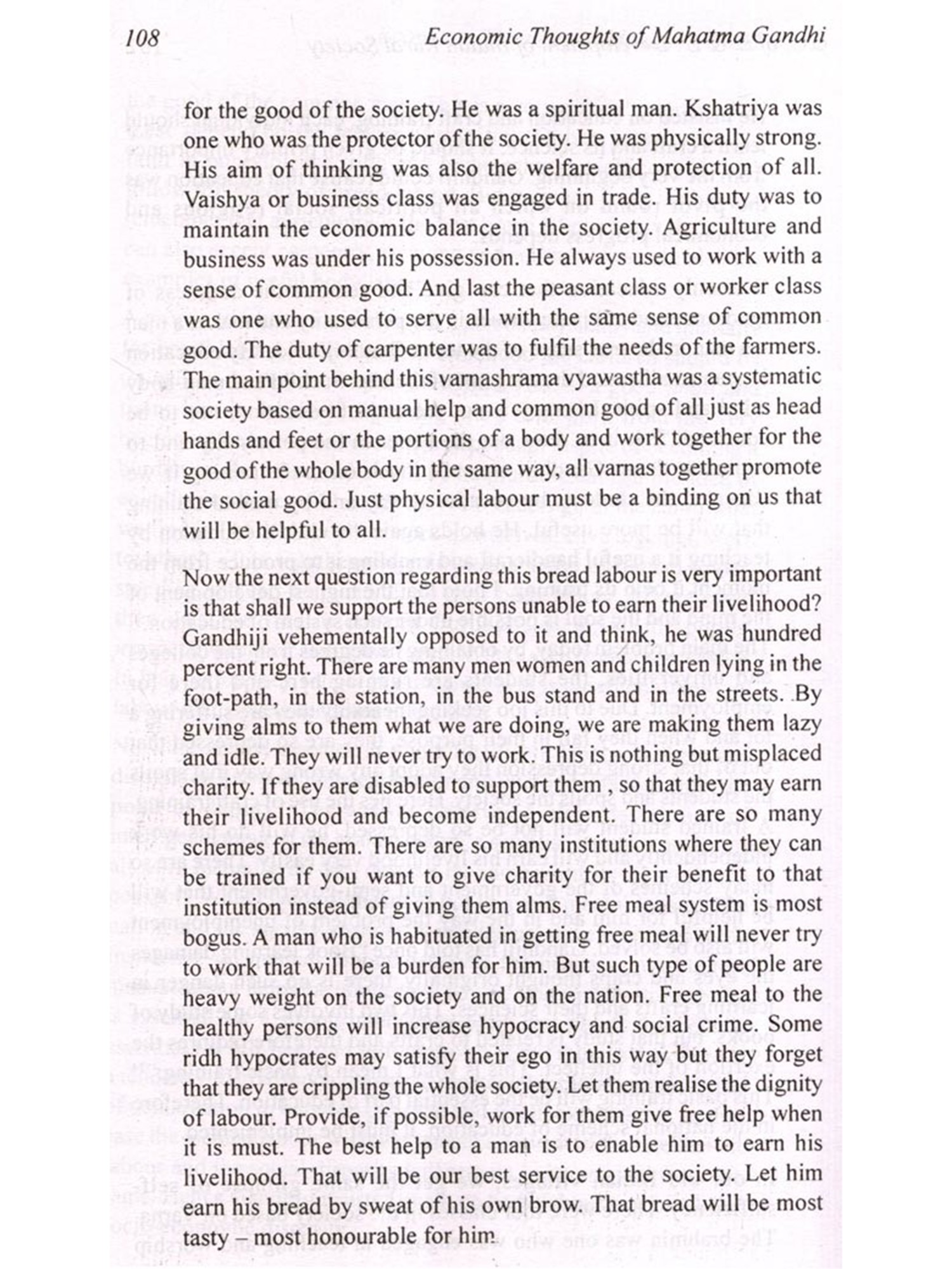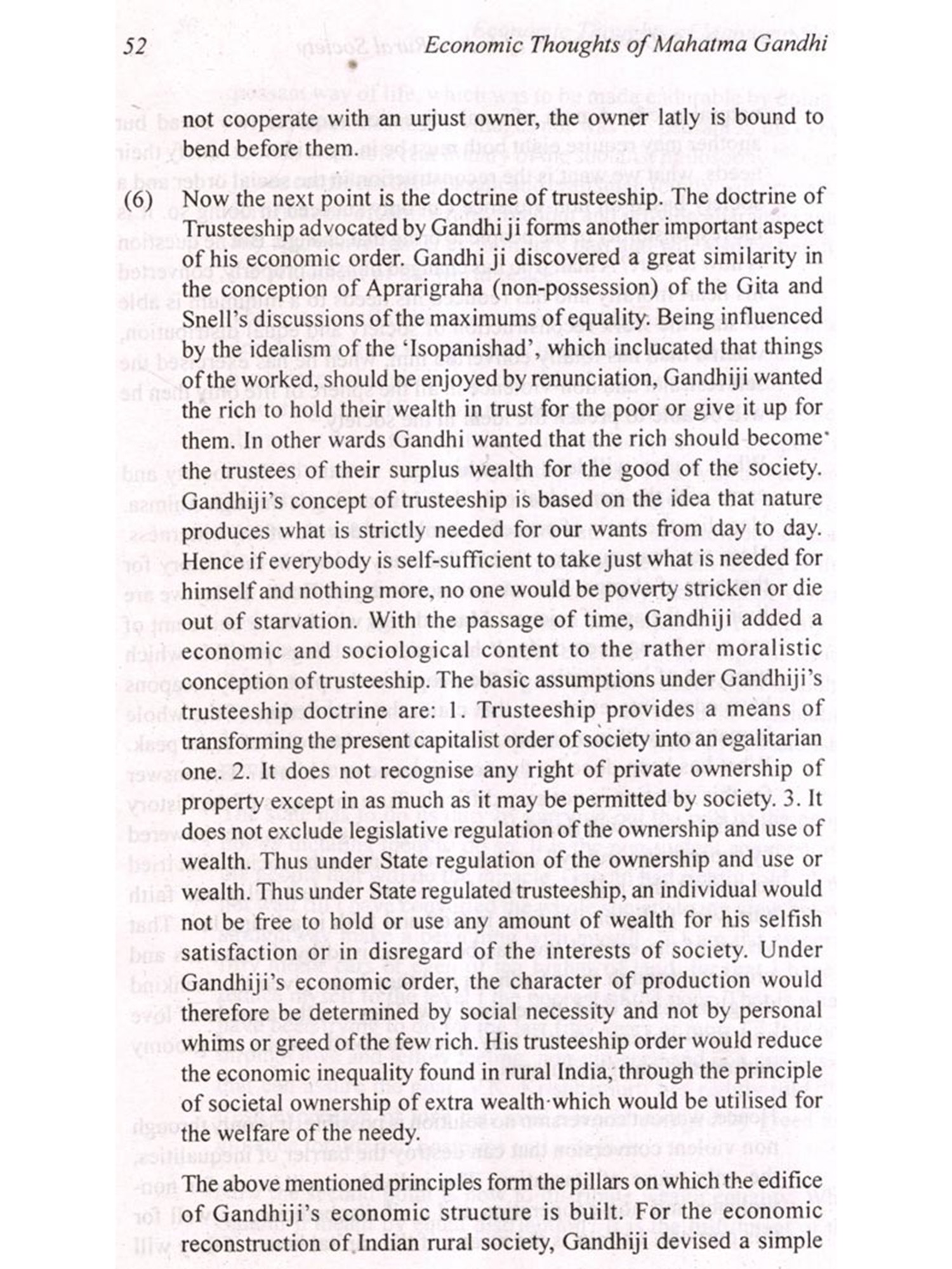 that the market economy has come to occupy a centre piece, a pivotal role and unassailable and unchallengeable status in the realm of economic thought and operation. Same economists of international repute and Nobel Laureates such as Stiglitz had always been vociferous against the efficacy of market economy or capitalism. These were the two contending and warring ideologies. Gandhian thought had not been accorded any recognition in the modern economic thought but after the collapse of the market economy as represented by the subprime mortgage crisis of the U.S.A which has triggered worldwide meltdown, even votaries of unadulterated capitalism are advocating nationalisation though they argue for its temporary phenomenon and call it pre-market economy nationalisation. In this context Gandhian economic thought becomes not only relevant but calls for its immediate implementation in order to wriggle out of the current crisis. Gandhian approach does not use the time worn vocabulary like capitalism or socialism but states its position candidly. It advocates production for consumption. The basic needs of the people should be ascertained and quantified and production of goods should only go to the meeting of those needs and nothing more. There should be no production for greed. Production should veer round satisfaction of the basic needs of man. Hence, Gandhian approach undermines the basic assumption and goal of capitalism.