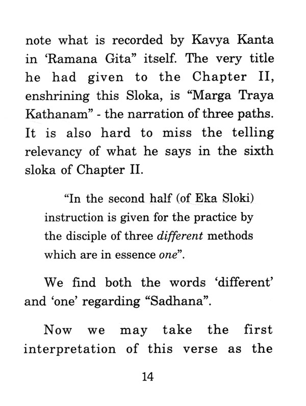 There are more than three hundred verses in 'Ramana Gita'. Of these, only one verse, the second verse of Chapter two was written in Sanskrit, by Bhagavan Ramana. The other verses are Kavyakanta Ganapathi Muni's record of questions by earnest seekers of truth on different subjects and Bhagavan's reply to them. Some verses are the product of Muni's divine vision of the glory of Sri Ramana as the latest incarnation of Subrahmanya.