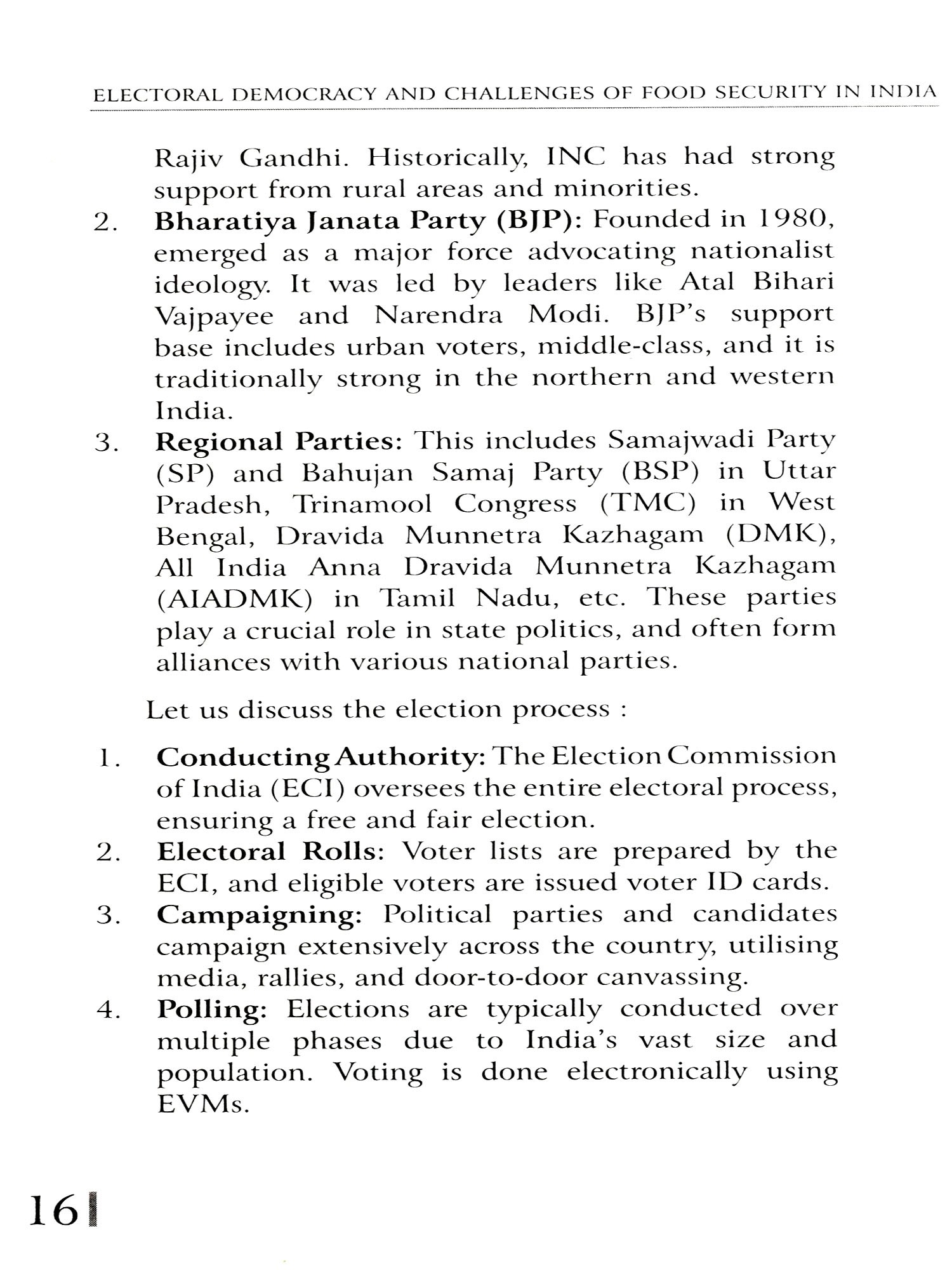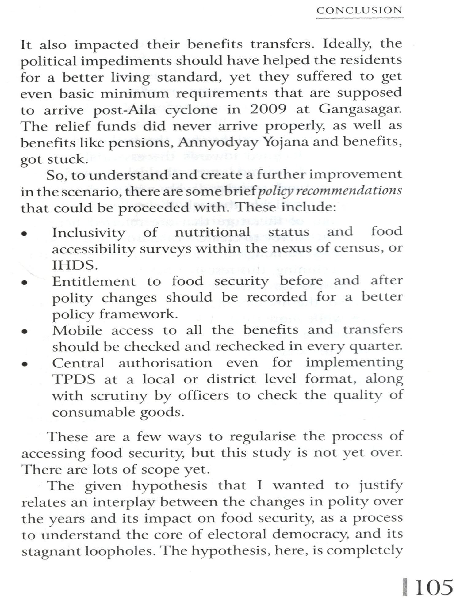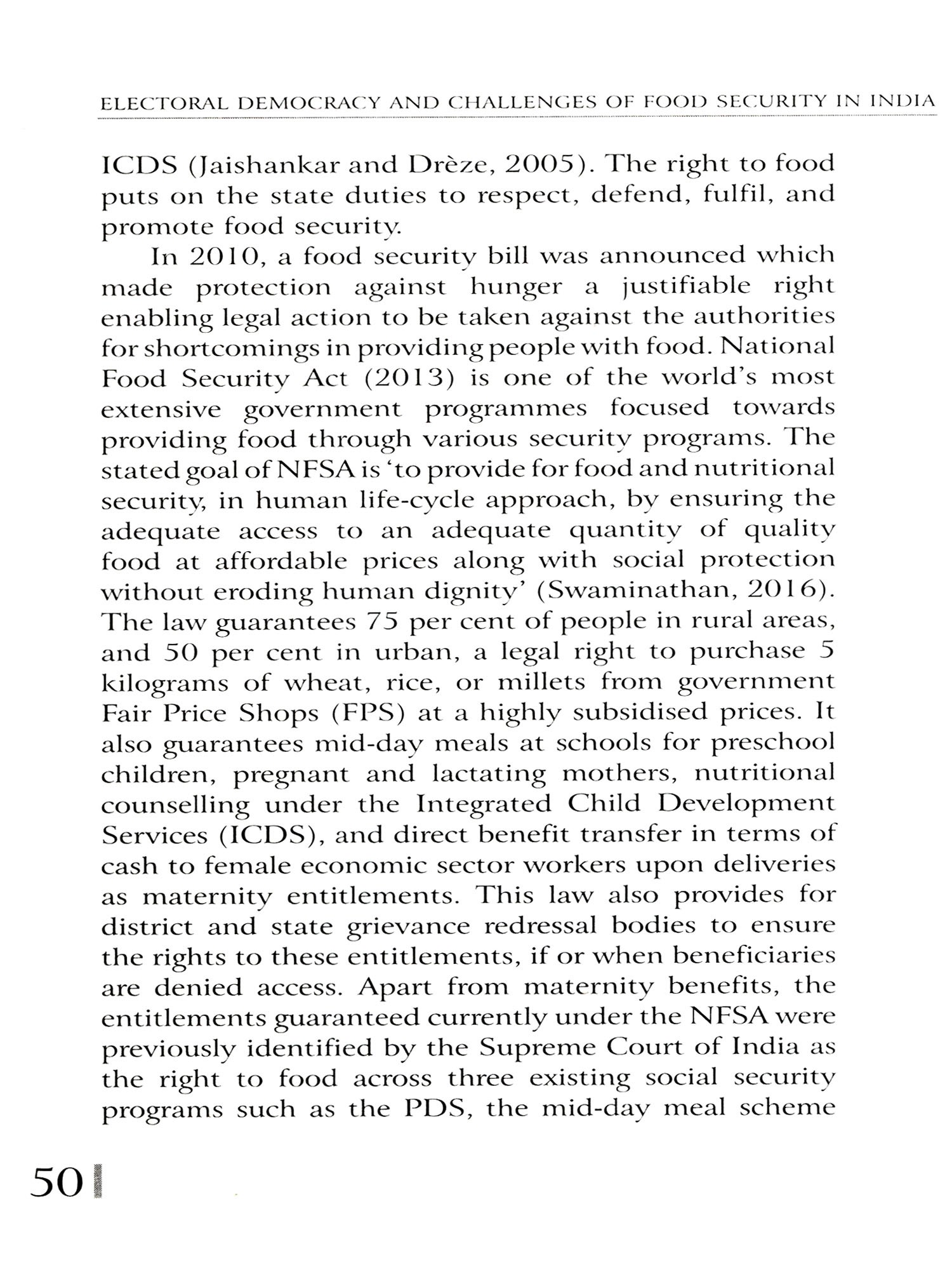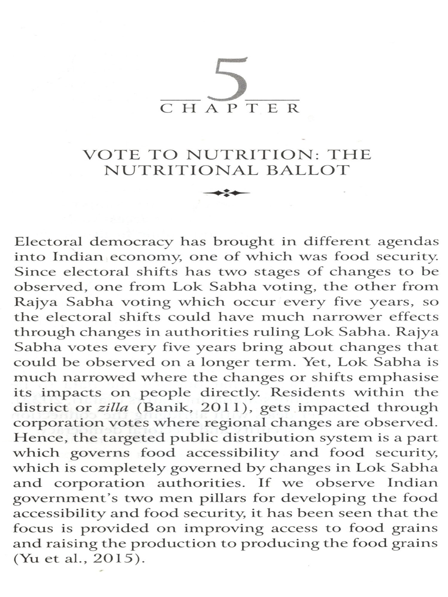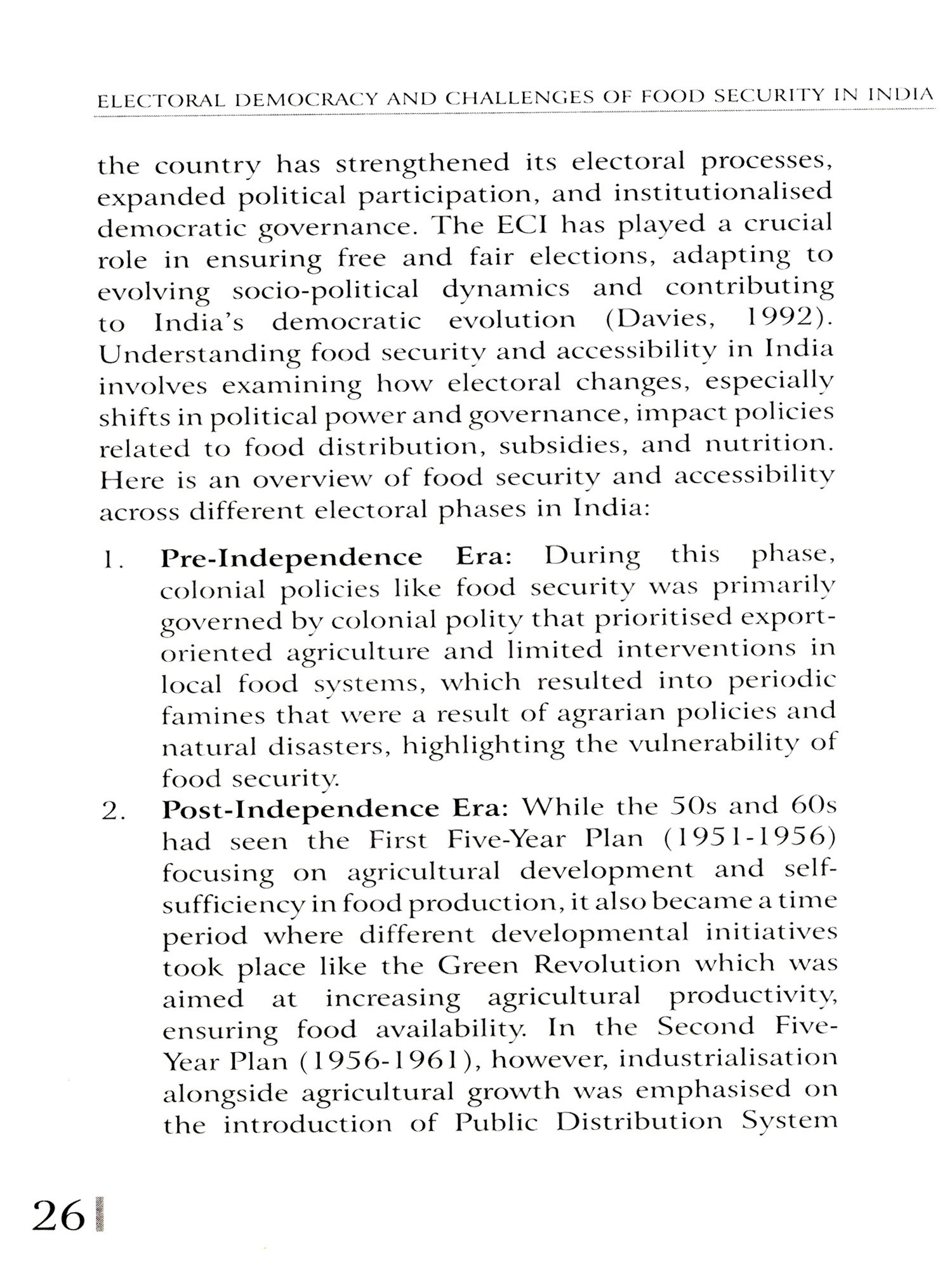 This research has been undertaken to understand the entitlement and capability to access food as a means of basic sustenance. The book, overall, has explored some of these important issues with regard to food security and electoral democracy to understand both variables, in depth.
