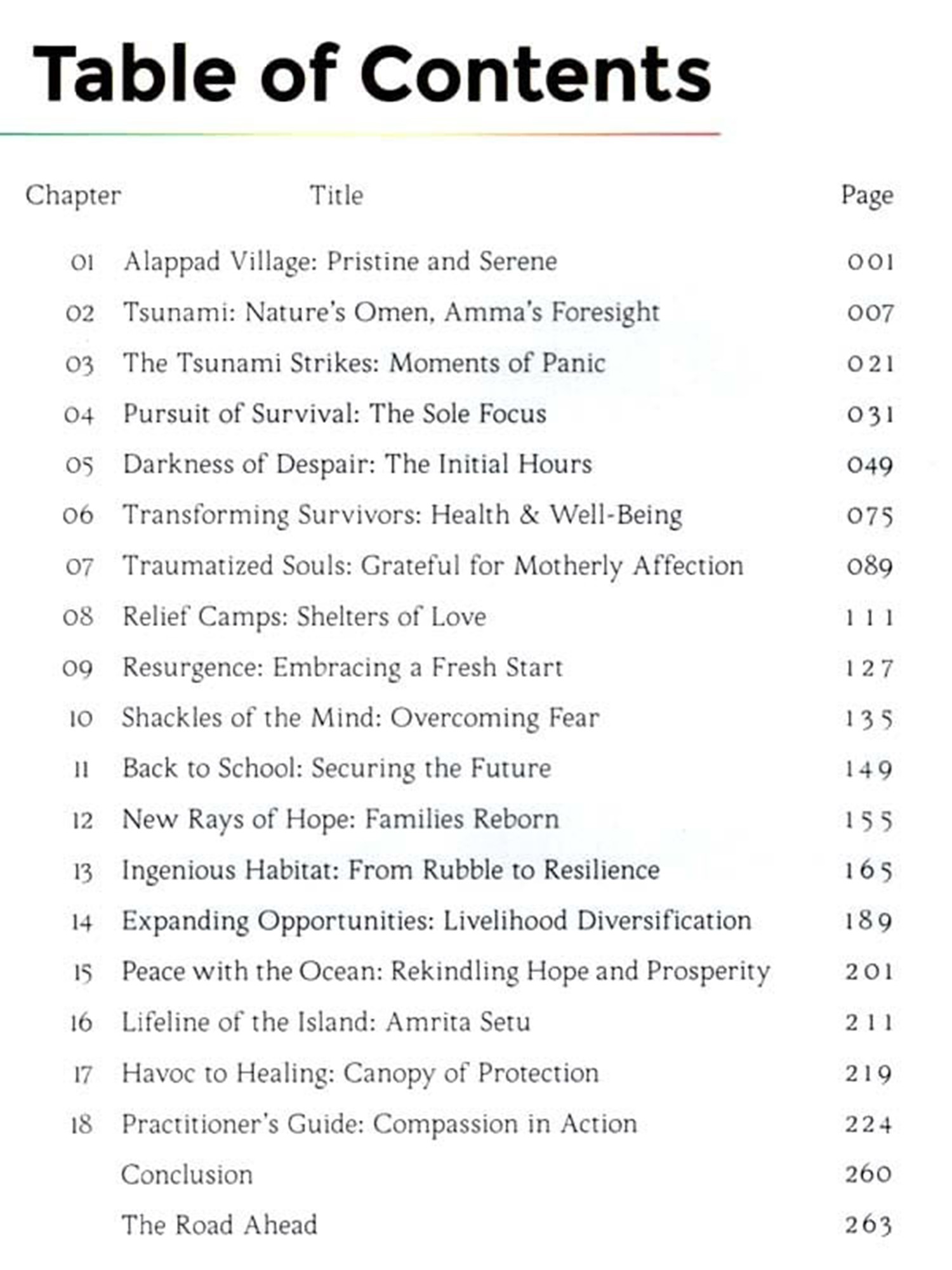 and perseverance, Amma led the entire village from utter devastation to prosperity. What Amma achieved by embracing and practicing unprecedented and unheard-of approaches to disaster management should be etched forever in the annals of disaster management for the knowledge, inspiration, and benefit of future generations. Within the heart of this catastrophe, Amma's wisdom shone through, offering profound lessons to those struggling amidst the darkness. This book delves into those lessons and the remarkable stories of resilience that emerged from the darkest hours. Amma demonstrated the importance of unity and courage in the face of overwhelming odds, inspiring communities to stand rooted together as they rebuilt their lives. Her teachings also shed light on the evolution of disaster management practices in the aftermath of this tragedy, underscoring the significance of preparedness, cooperation, and global solidarity.