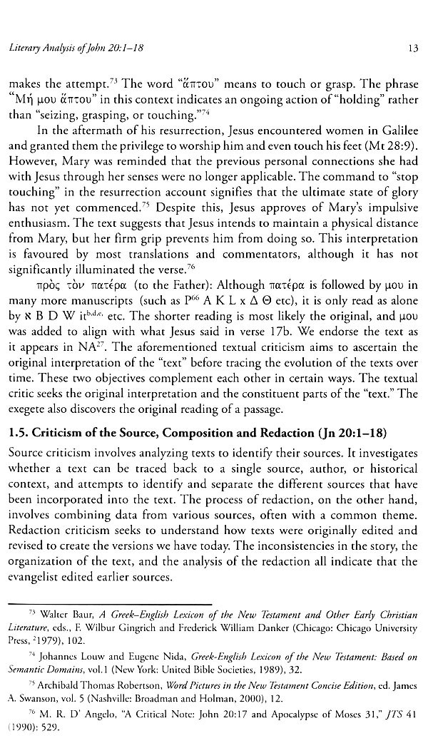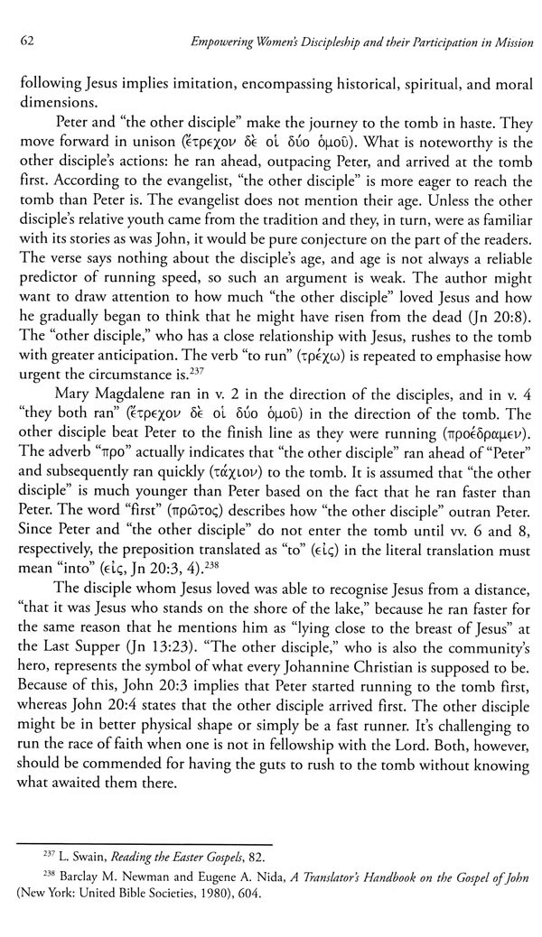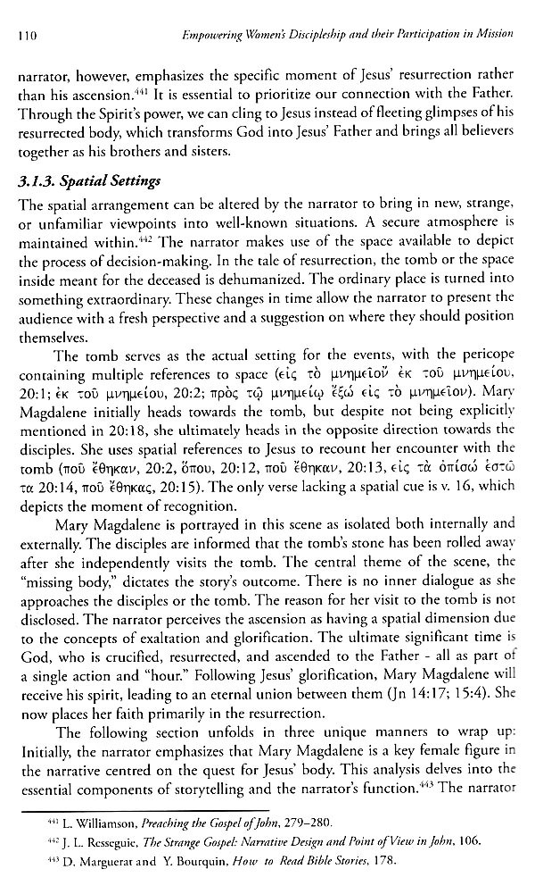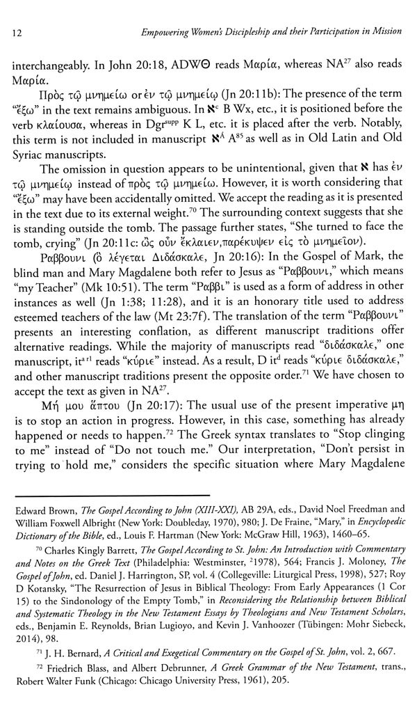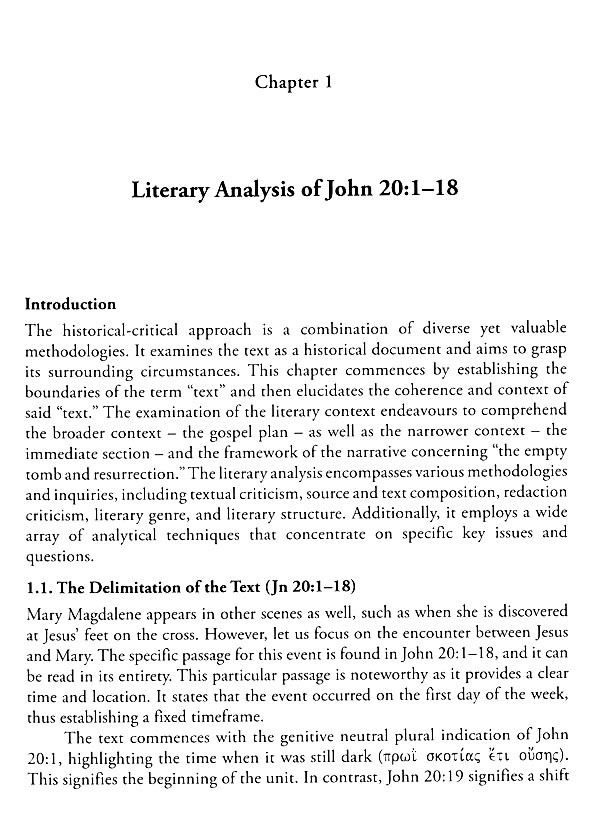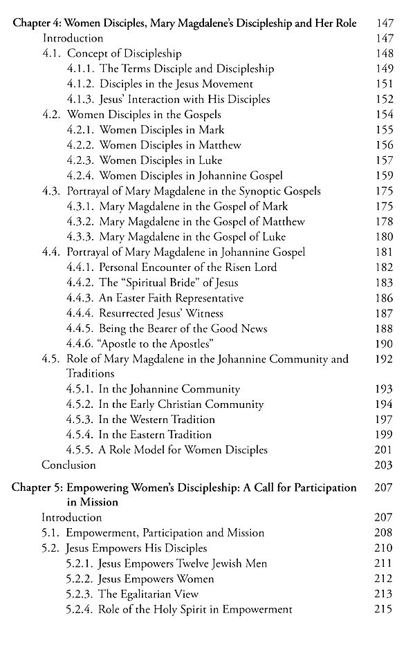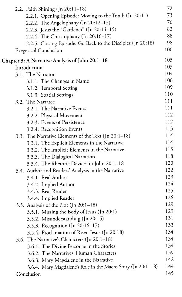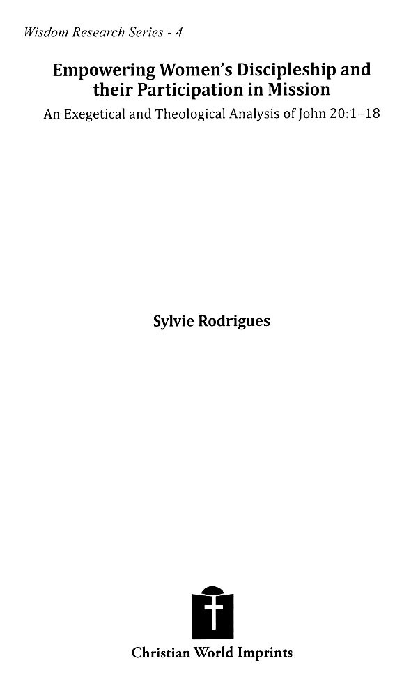 The book contains five chapters. First chapter situates the text, John 20:1-18, in the realm of literary analysis within Johannine studies. Second chapter delves into the exegetical significance of the text. While the third chapter focuses on the narrative analysis of the text, the fourth focuses on Mary Magdalene and her role in discipleship. Fifth chapter addresses the empowering women's discipleship. emphasizing the call for participation in mission.