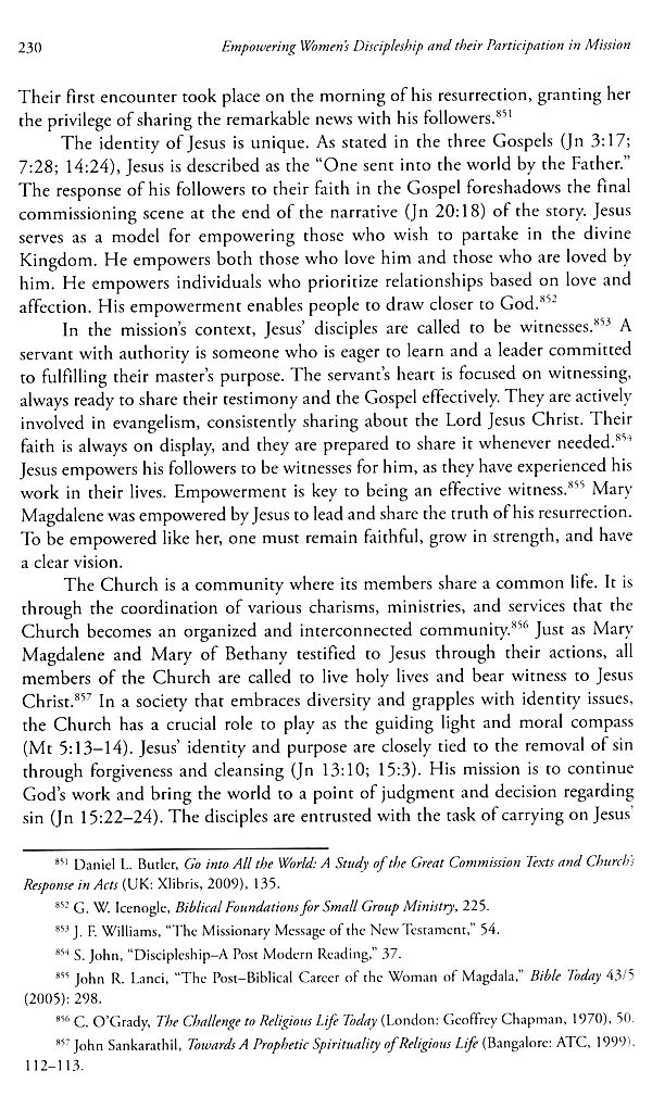 I am delighted to know that Sr Dr Sylvie Rodrigues BS is publishing her well-recognized doctoral dissertation, Empowering Women's Discipleship and their Participation in Mission: An Exegetical and Theological Analysis of John 20:1-18. The research explores how empowering women's discipleship and their involvement in the mission of the Church and society contribute to the promotion of gender equality. To achieve this primary objective, the author, through the use of qualitative methodology and secondary sources, highlights the significance of Mary Magdalene's involvement in the resurrection narratives (Jn 20:1-18), within the broader context of empowering women in discipleship within the Church and society.