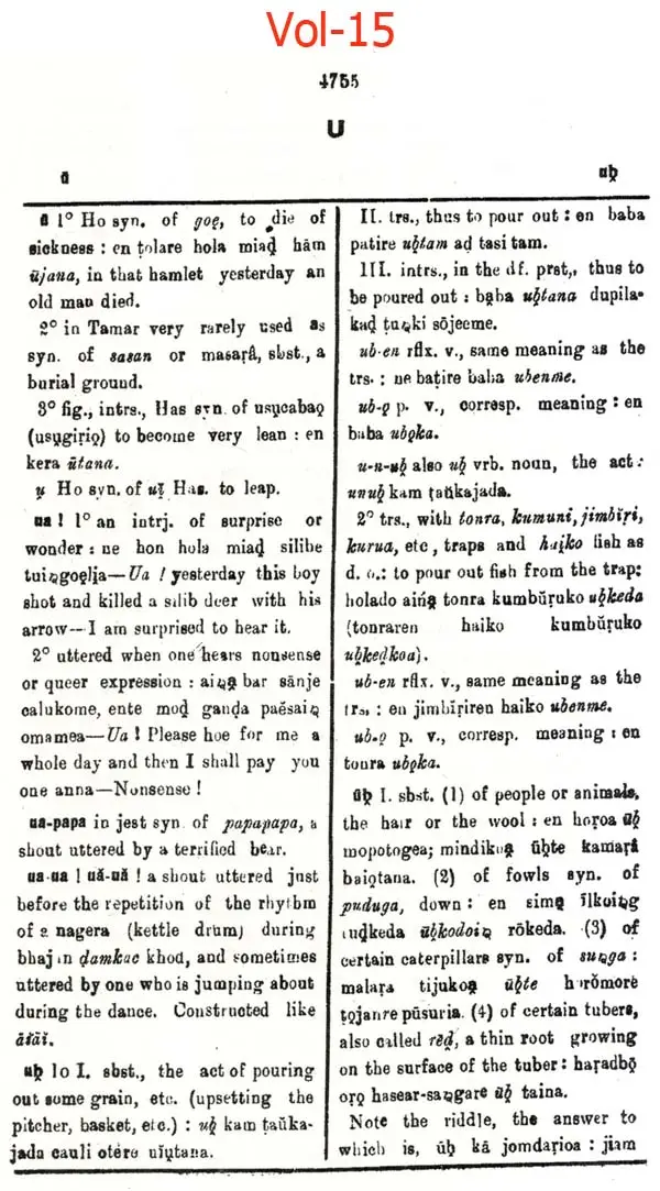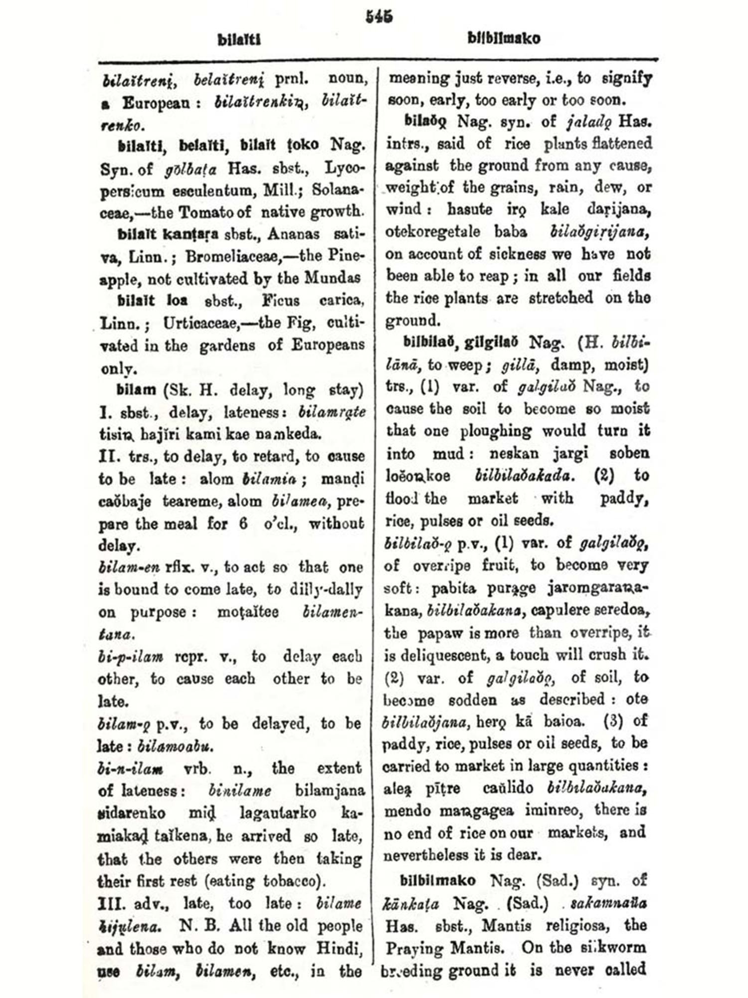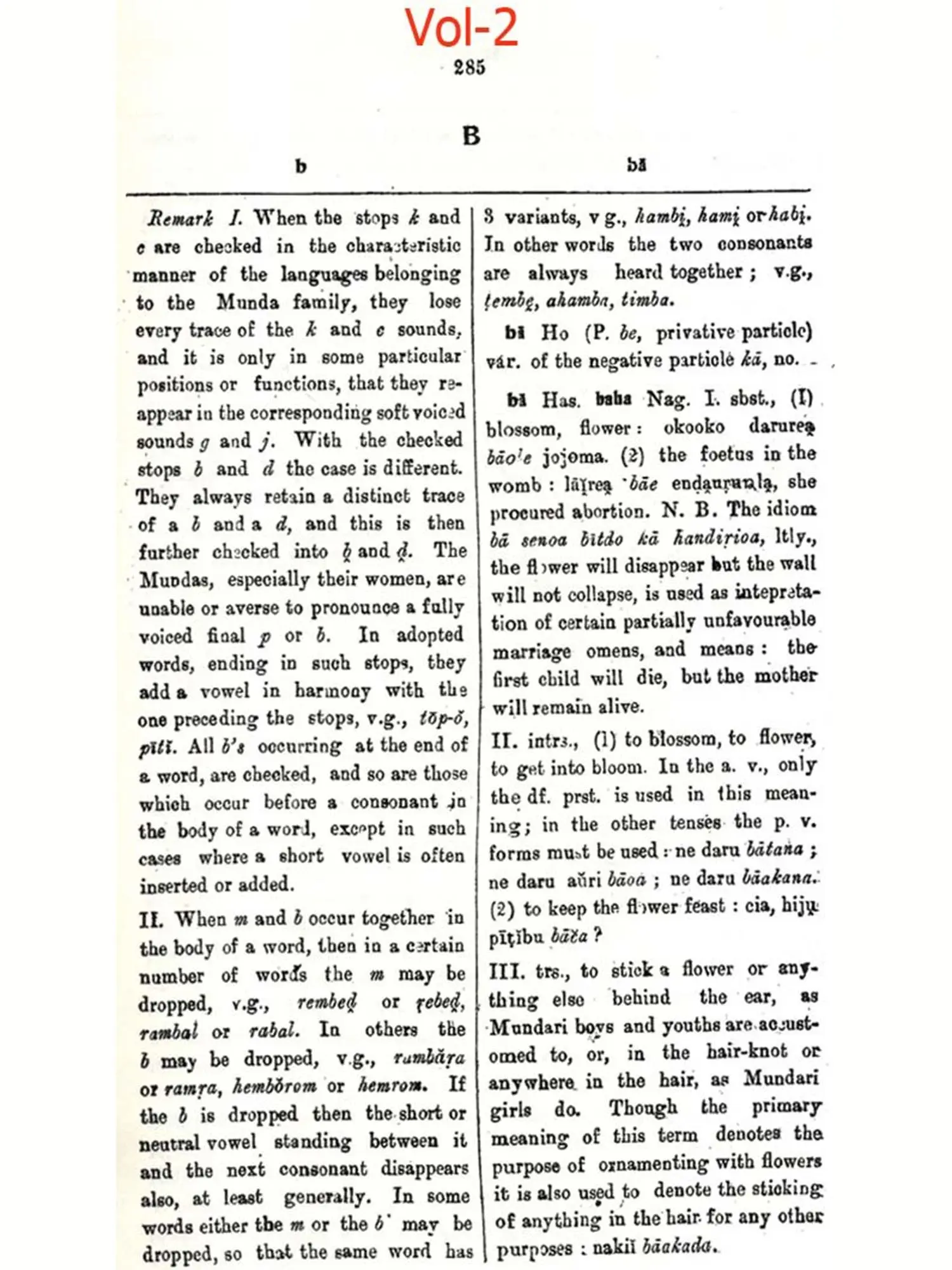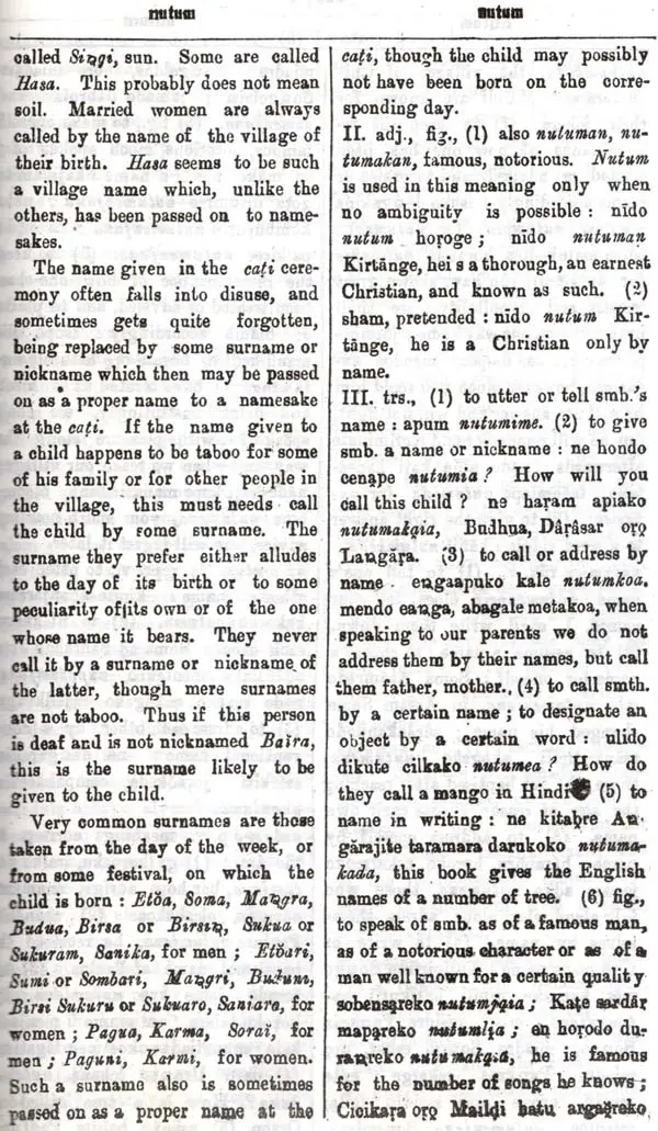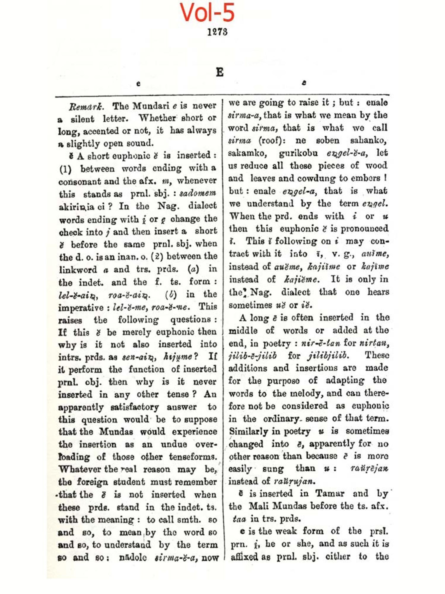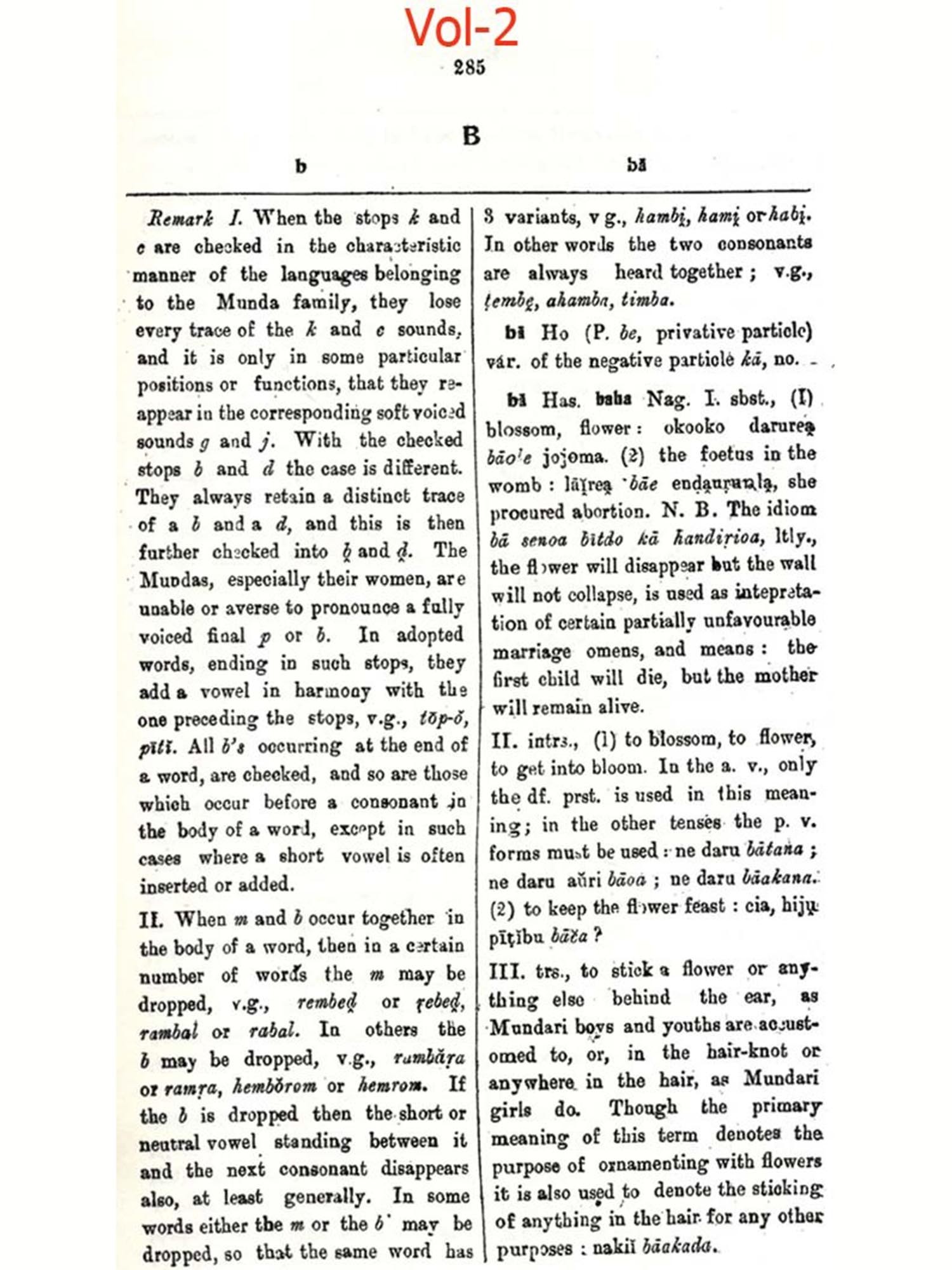 The Mundari language is a subject of great interest to both the ethnologist and the philologist, since it is the key to the understanding of the material and religious culture and social system of all the Munda tribes and it may be taken as the basis for the analysis and study of a number of tribal languages in India. It is interesting to note that this language contains such roots and vocables which appear to be cognates not only to those of Indo-Aryan languages including Sanskrit but also to the roots of such distant Indo-European languages as Greek, German, Flemish and English.