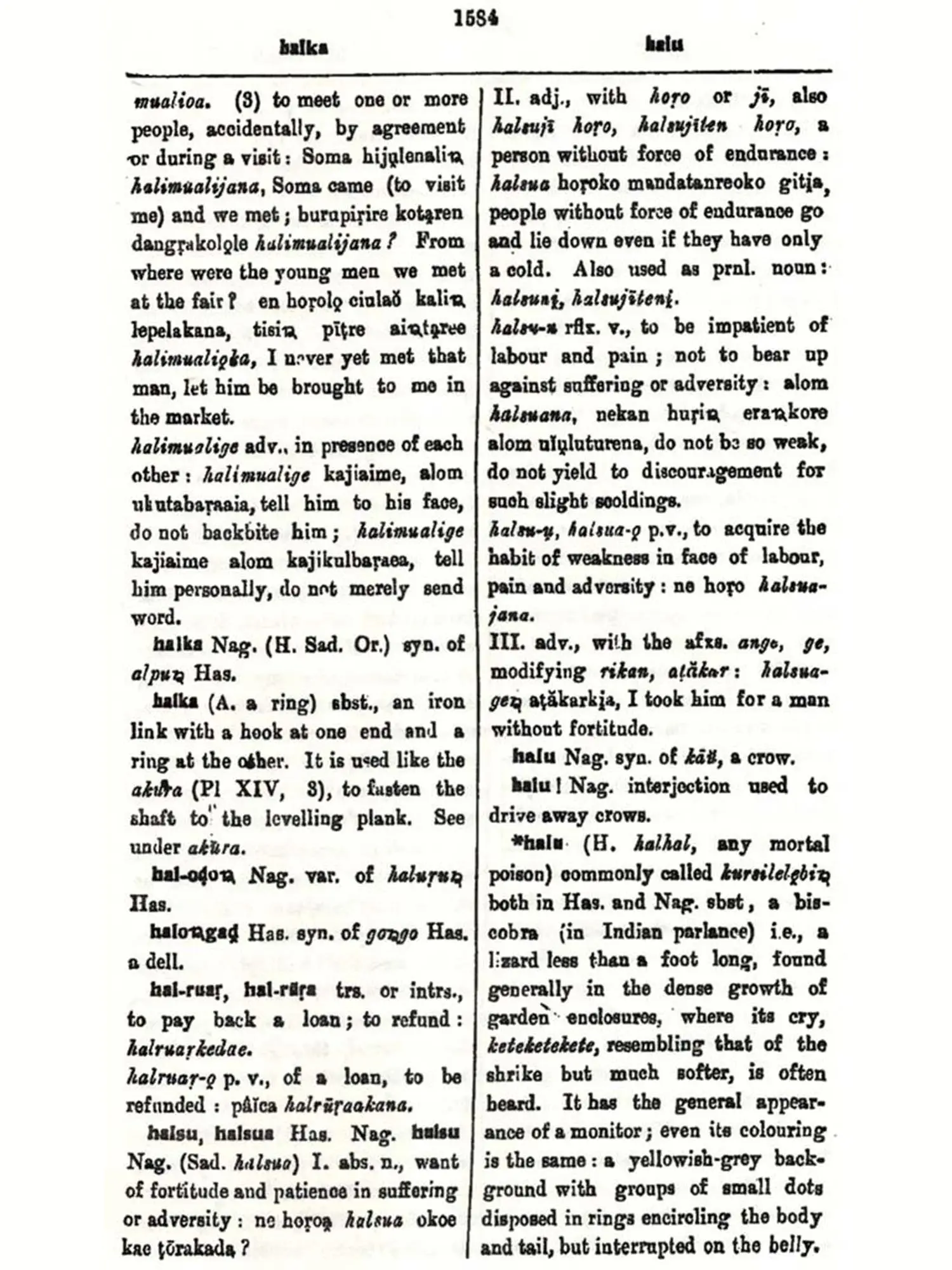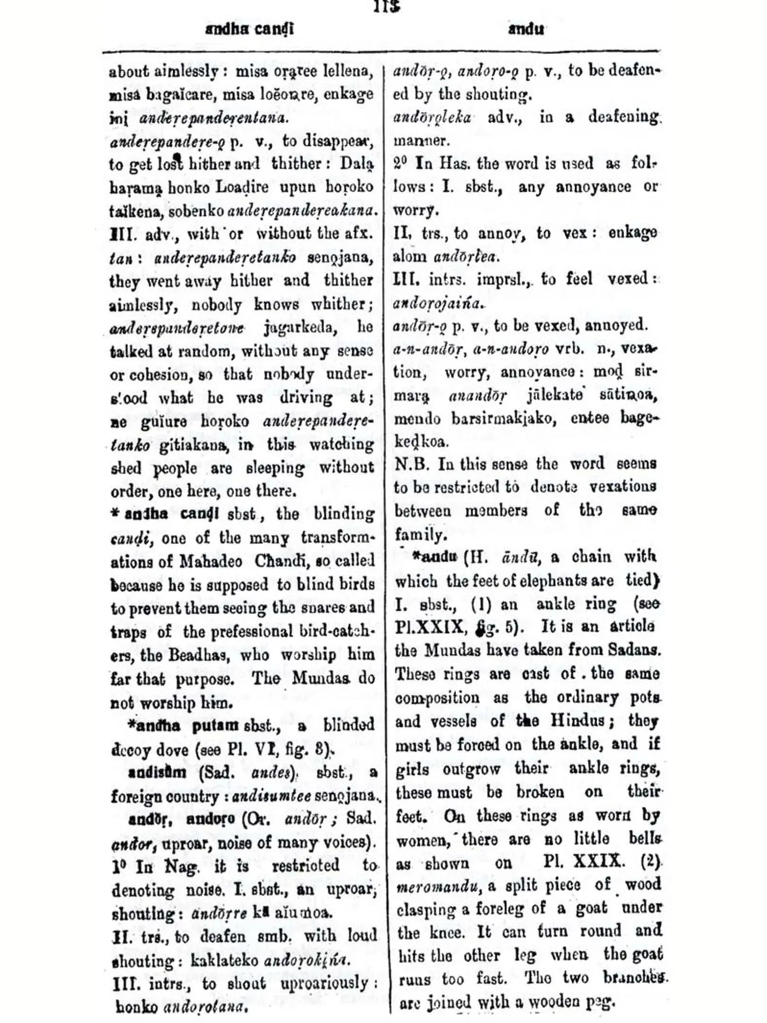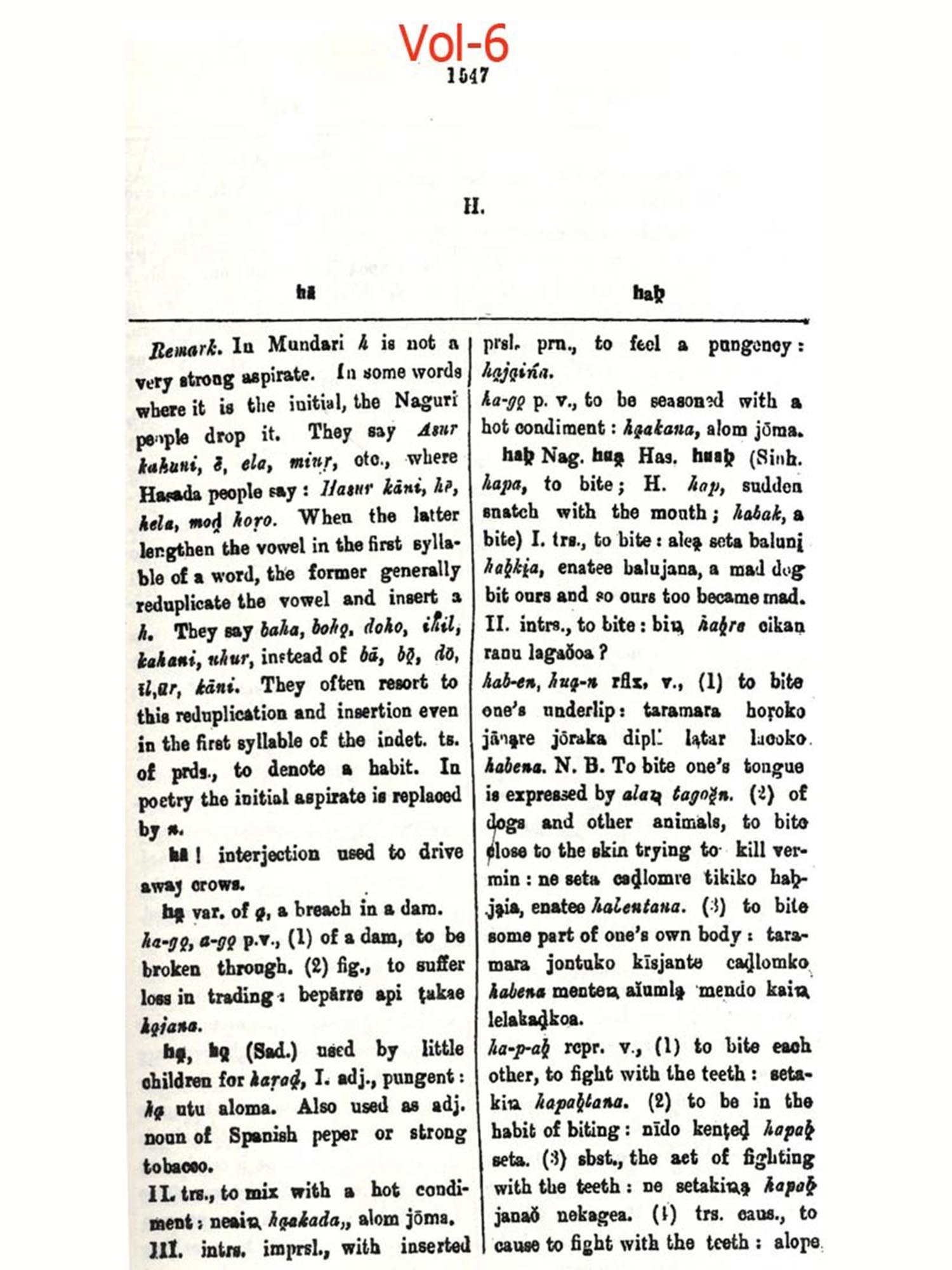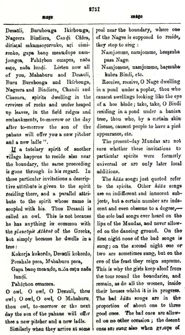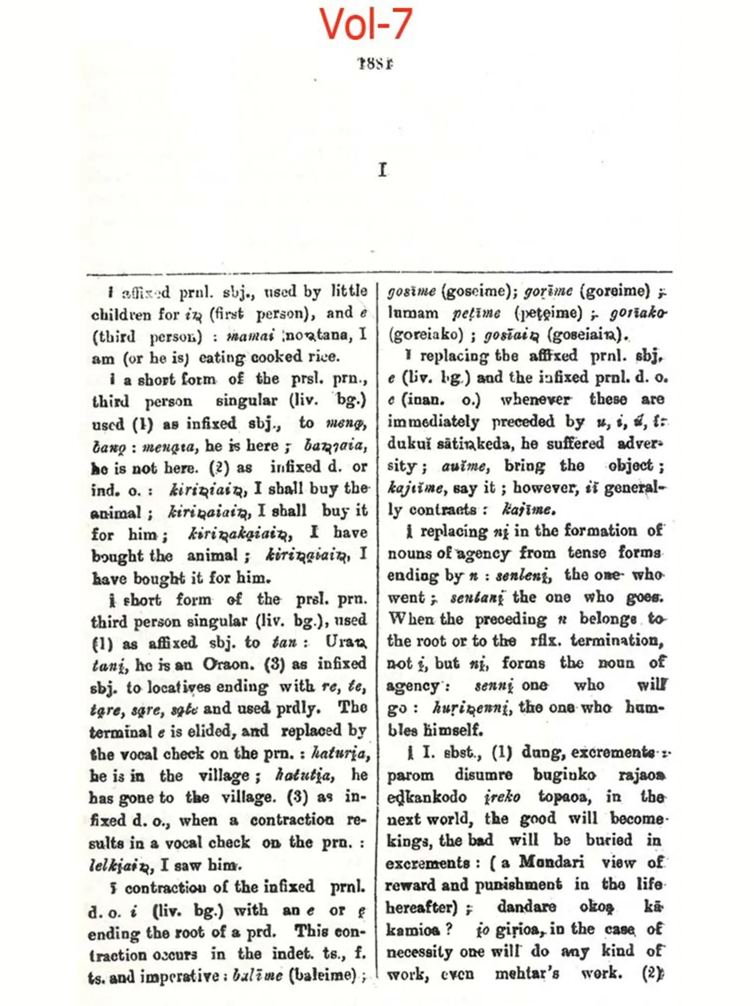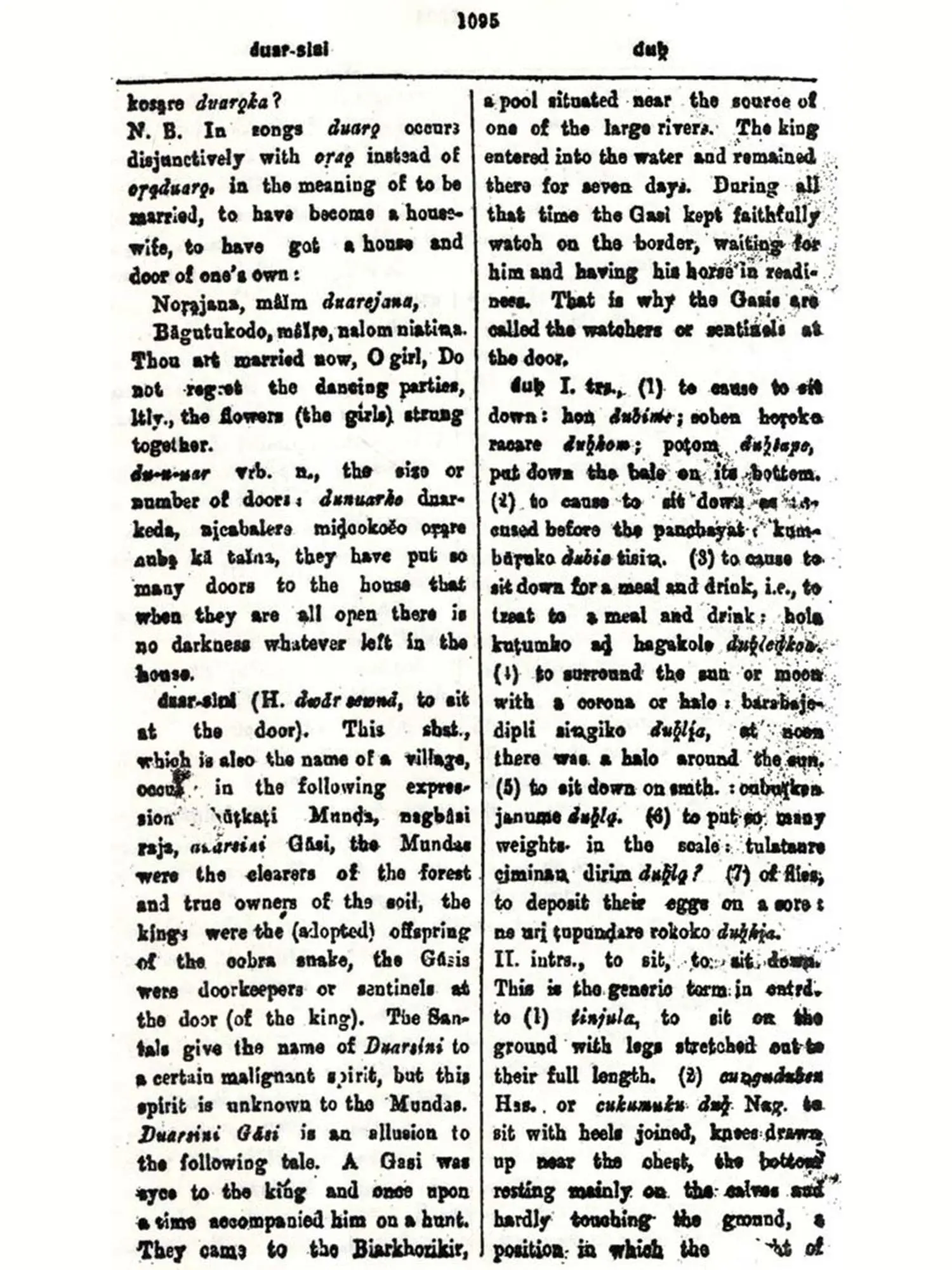 The Mundari language is a subject of great interest to both the ethnologist and the philologist, since it is the key to the understanding of the material and religious culture and social system of all the Munda tribes and it may be taken as the basis for the analysis and study of a number of tribal languages in India. It is interesting to note that this language contains such roots and vocables which appear to be cognates not only to those of Indo-Aryan languages including Sanskrit but also to the roots of such distant Indo-European languages as Greek, German, Flemish and English.