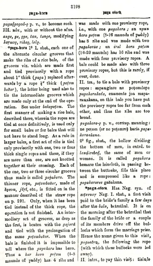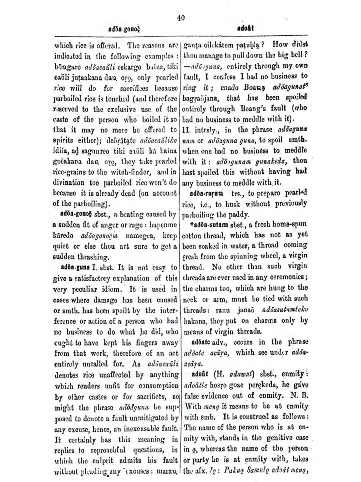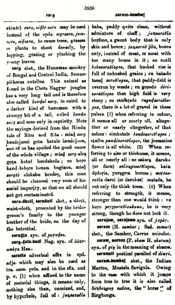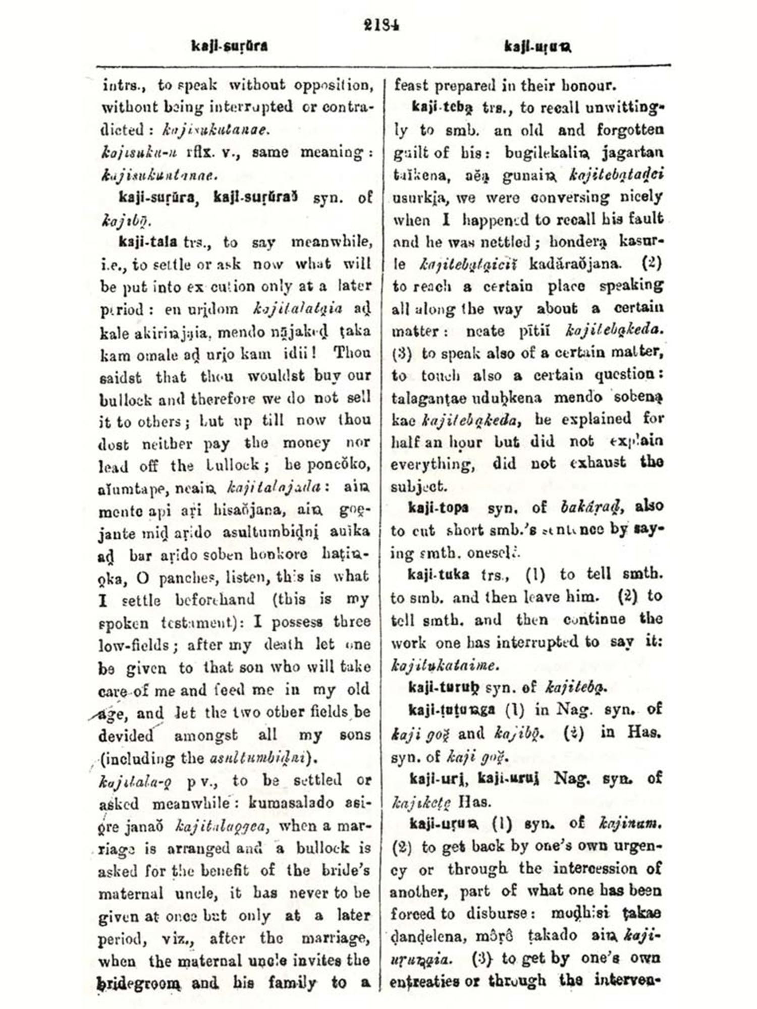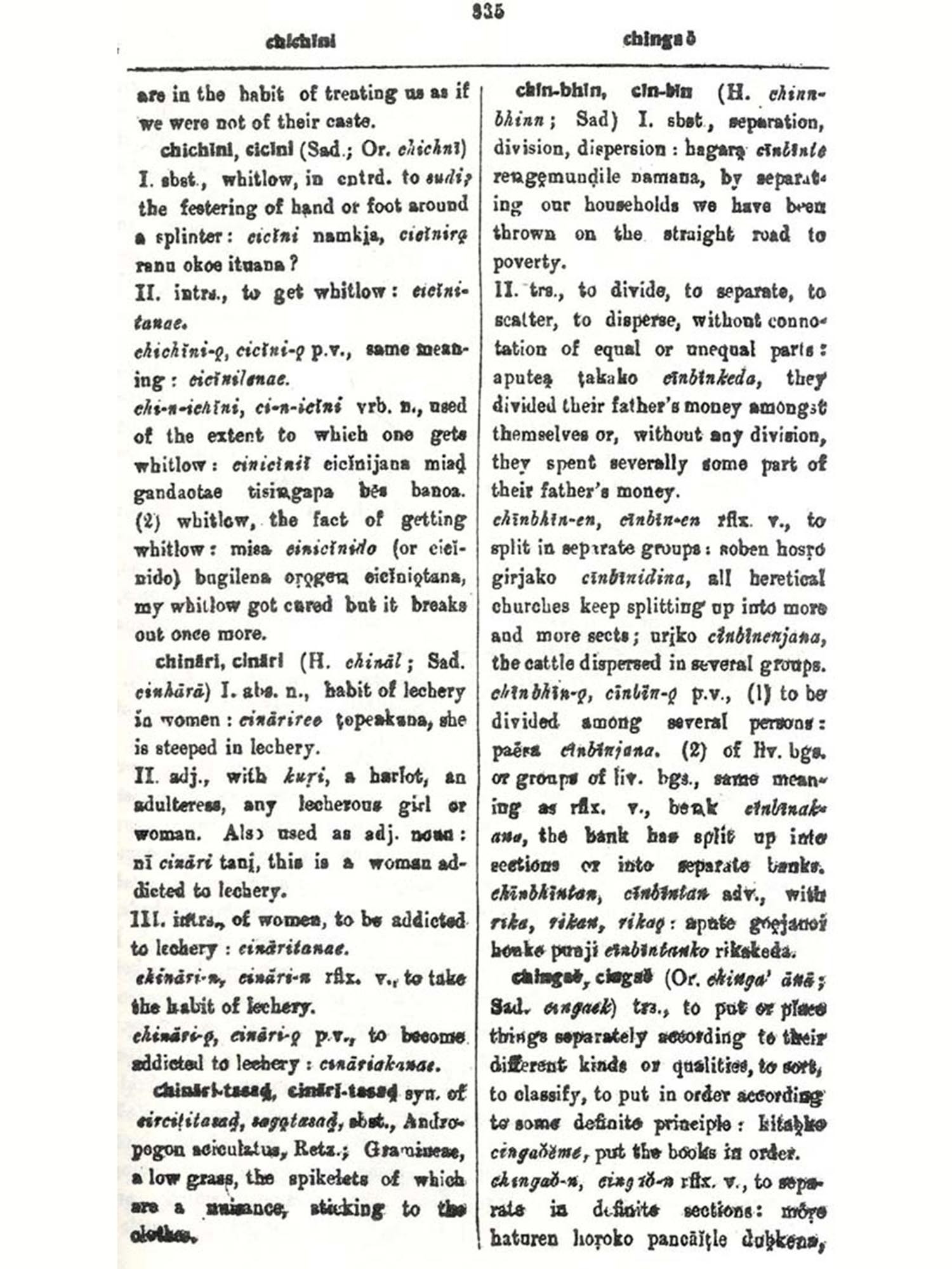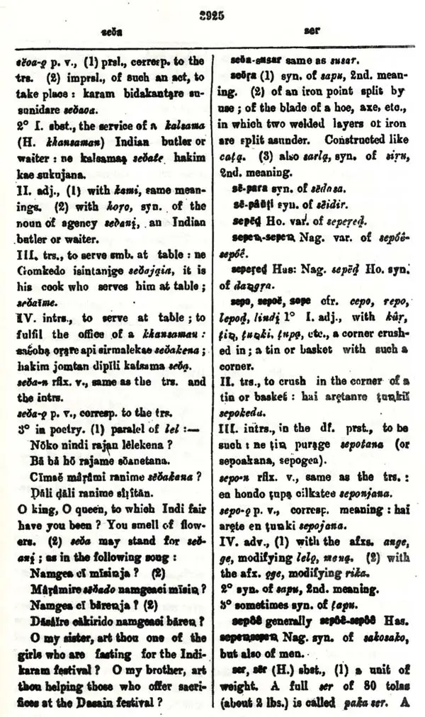 The Mundari language is a subject of great interest to both the ethnologist and the philologist, since it is the key to the understanding of the material and religious culture and social system of all the Munda tribes and it may be taken as the basis for the analysis and study of a number of tribal languages in India. It is interesting to note that this language contains such roots and vocables which appear to be cognates not only to those of Indo-Aryan languages including Sanskrit but also to the roots of such distant Indo-European languages as Greek, German, Flemish and English.