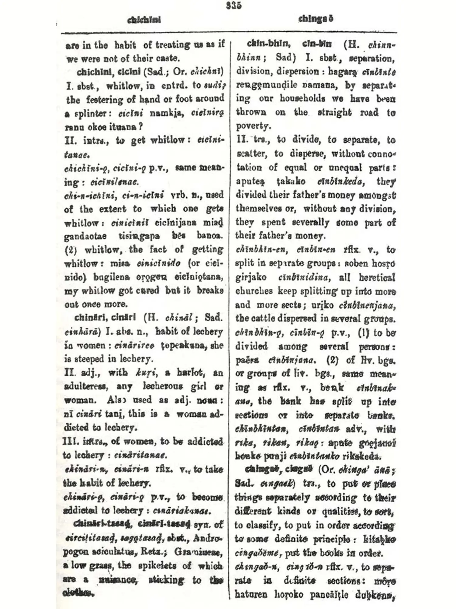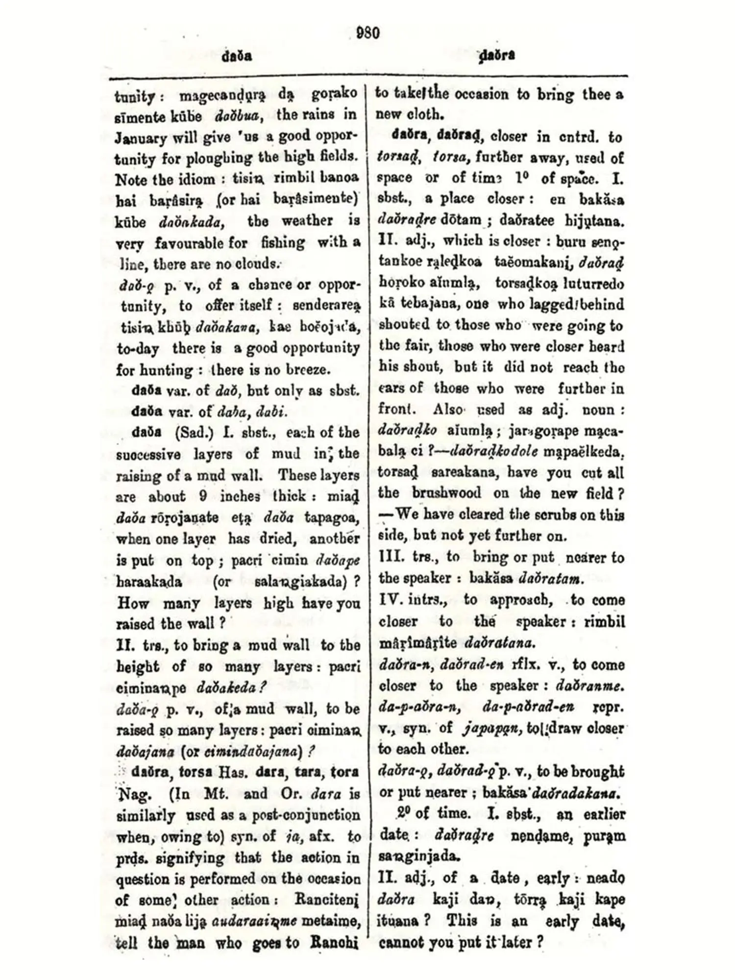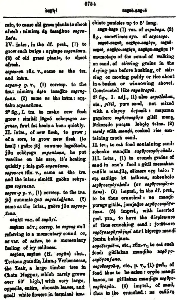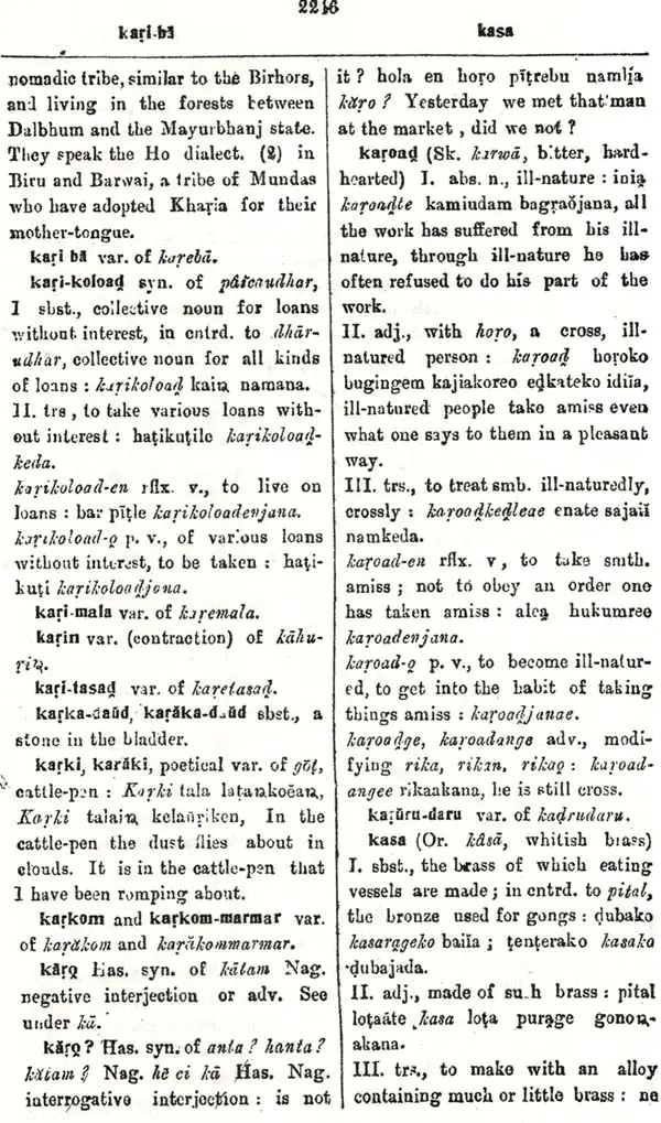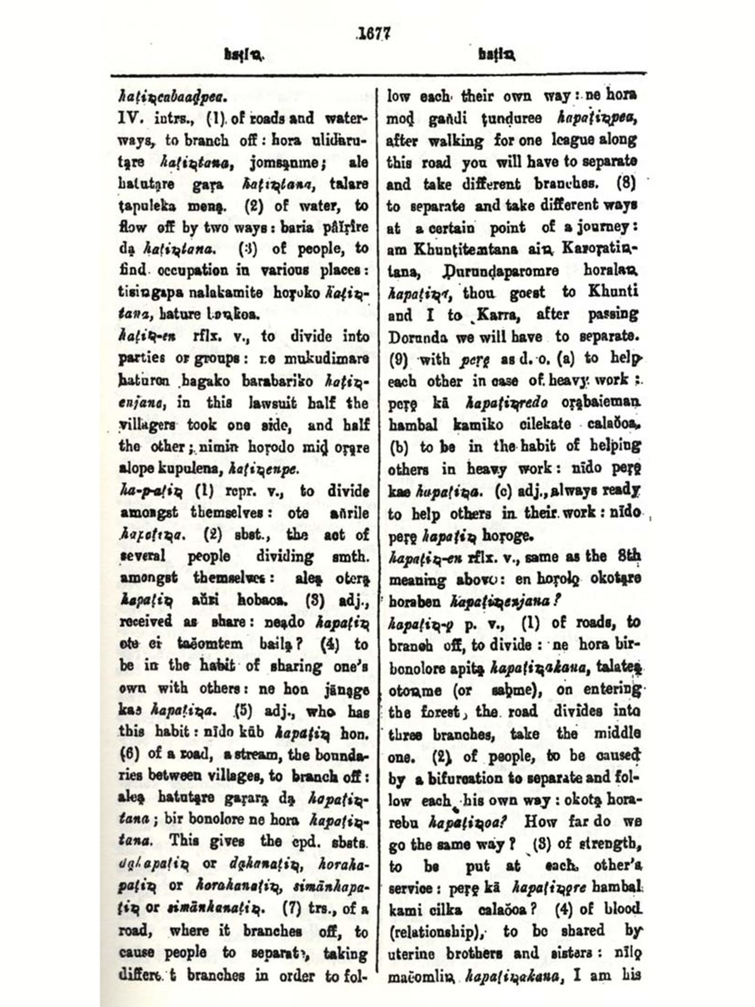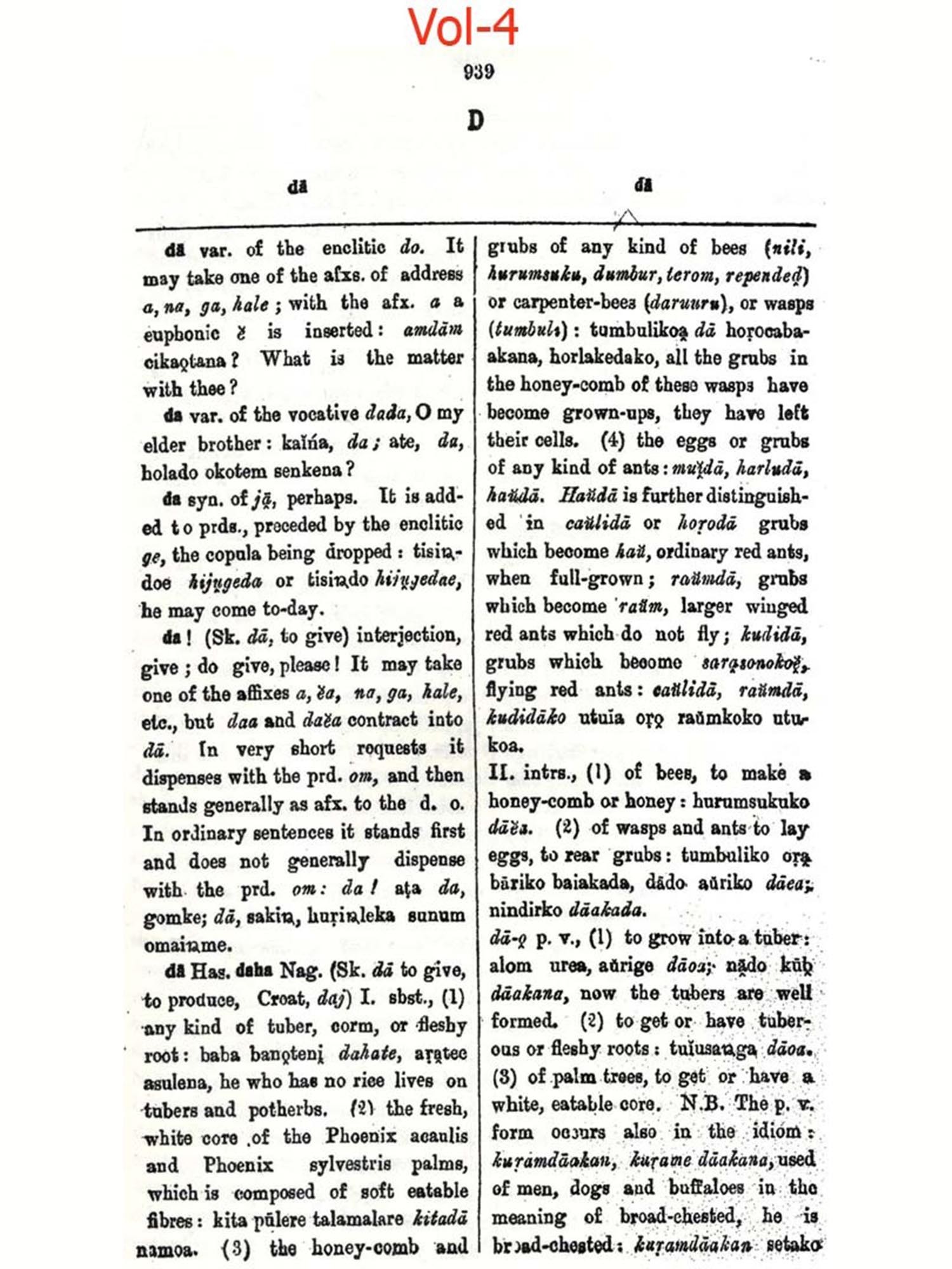 The Mundari language is a subject of great interest to both the ethnologist and the philologist, since it is the key to the understanding of the material and religious culture and social system of all the Munda tribes and it may be taken as the basis for the analysis and study of a number of tribal languages in India. It is interesting to note that this language contains such roots and vocables which appear to be cognates not only to those of Indo-Aryan languages including Sanskrit but also to the roots of such distant Indo-European languages as Greek, German, Flemish and English.
