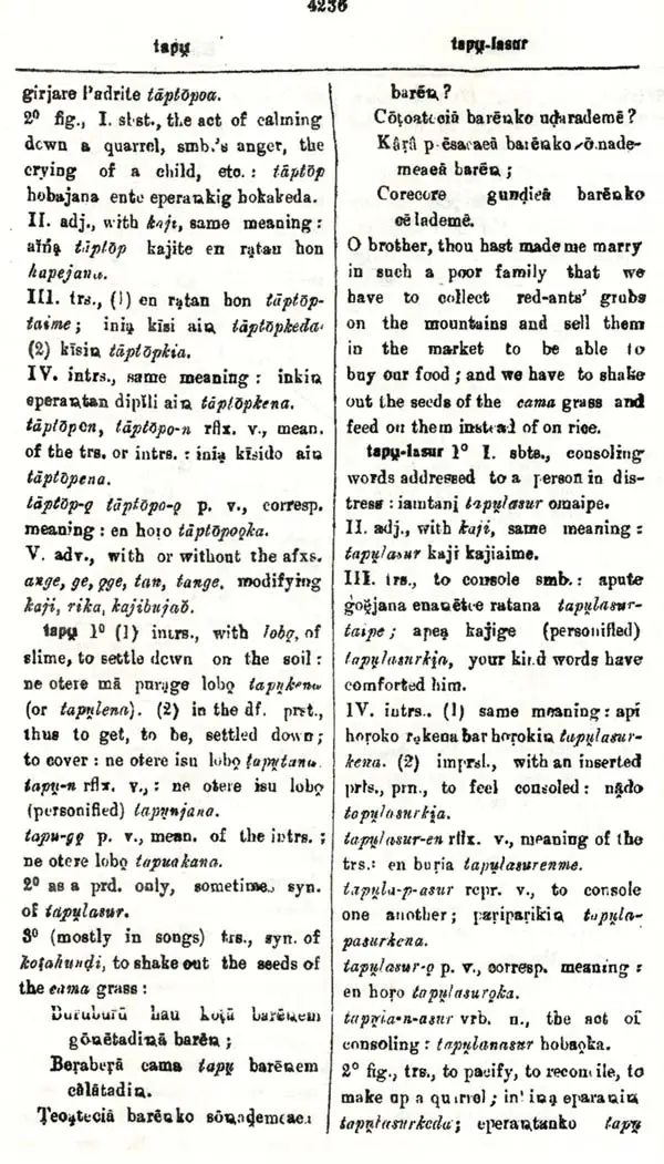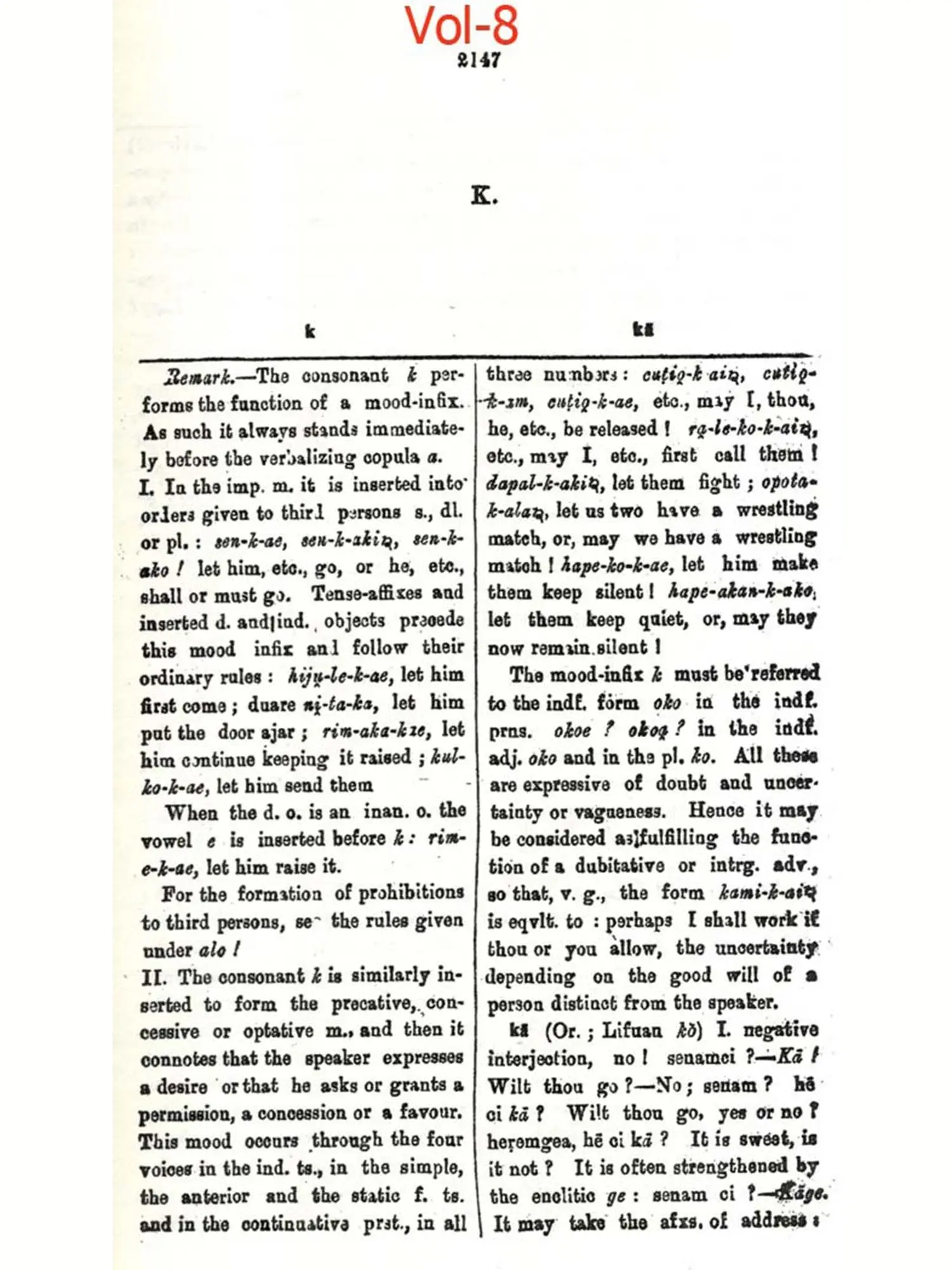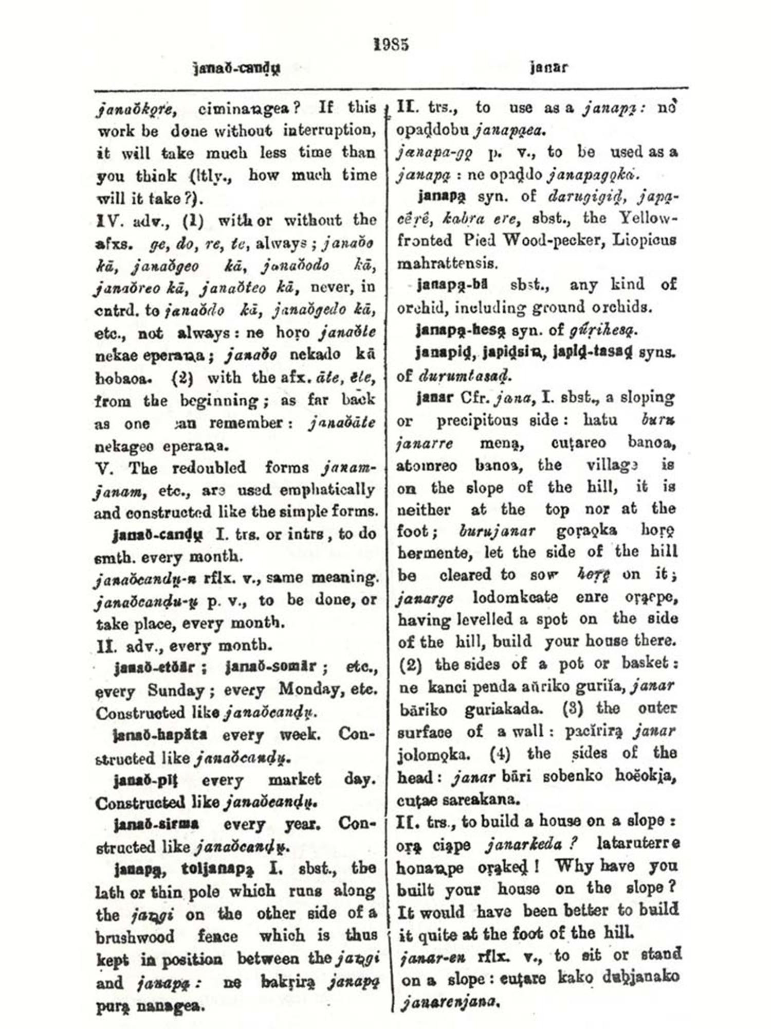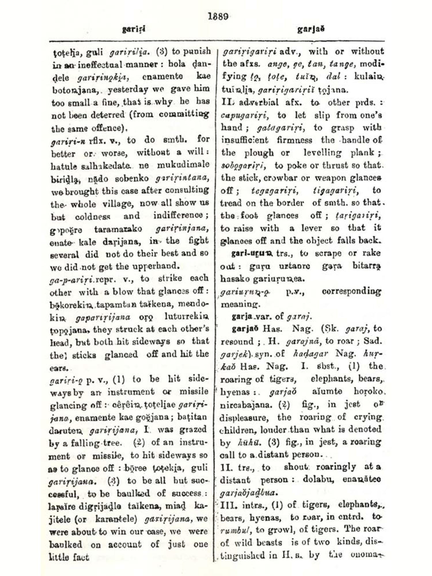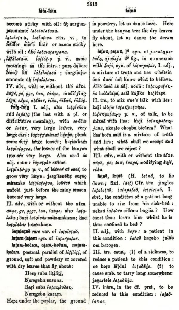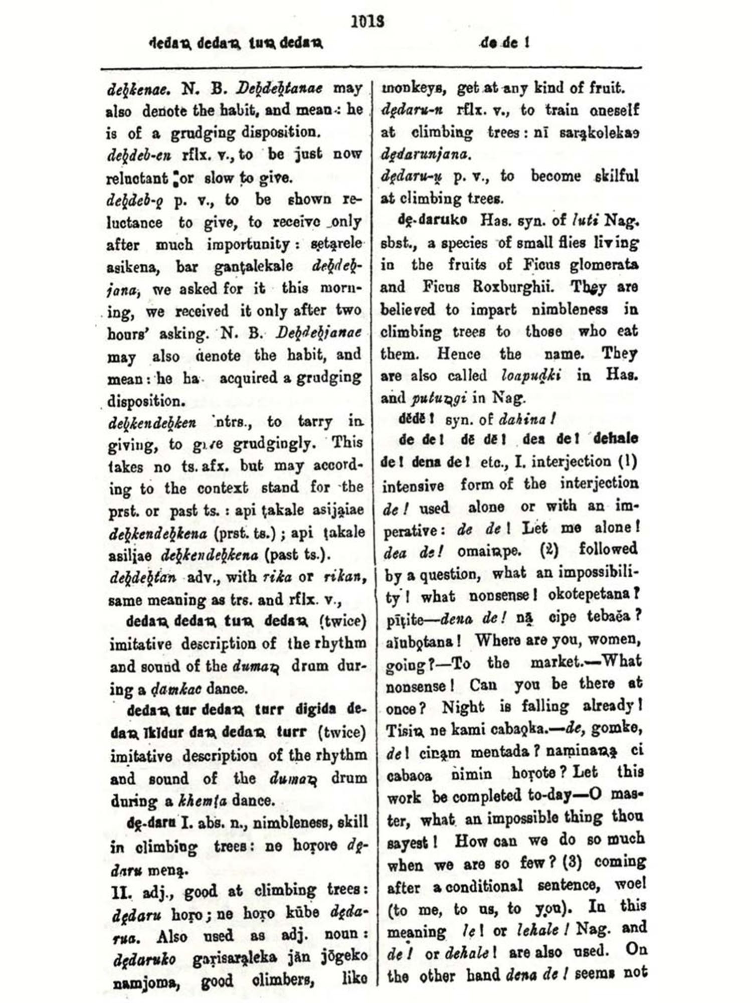 The Mundari language is a subject of great interest to both the ethnologist and the philologist, since it is the key to the understanding of the material and religious culture and social system of all the Munda tribes and it may be taken as the basis for the analysis and study of a number of tribal languages in India. It is interesting to note that this language contains such roots and vocables which appear to be cognates not only to those of Indo-Aryan languages including Sanskrit but also to the roots of such distant Indo-European languages as Greek, German, Flemish and English.