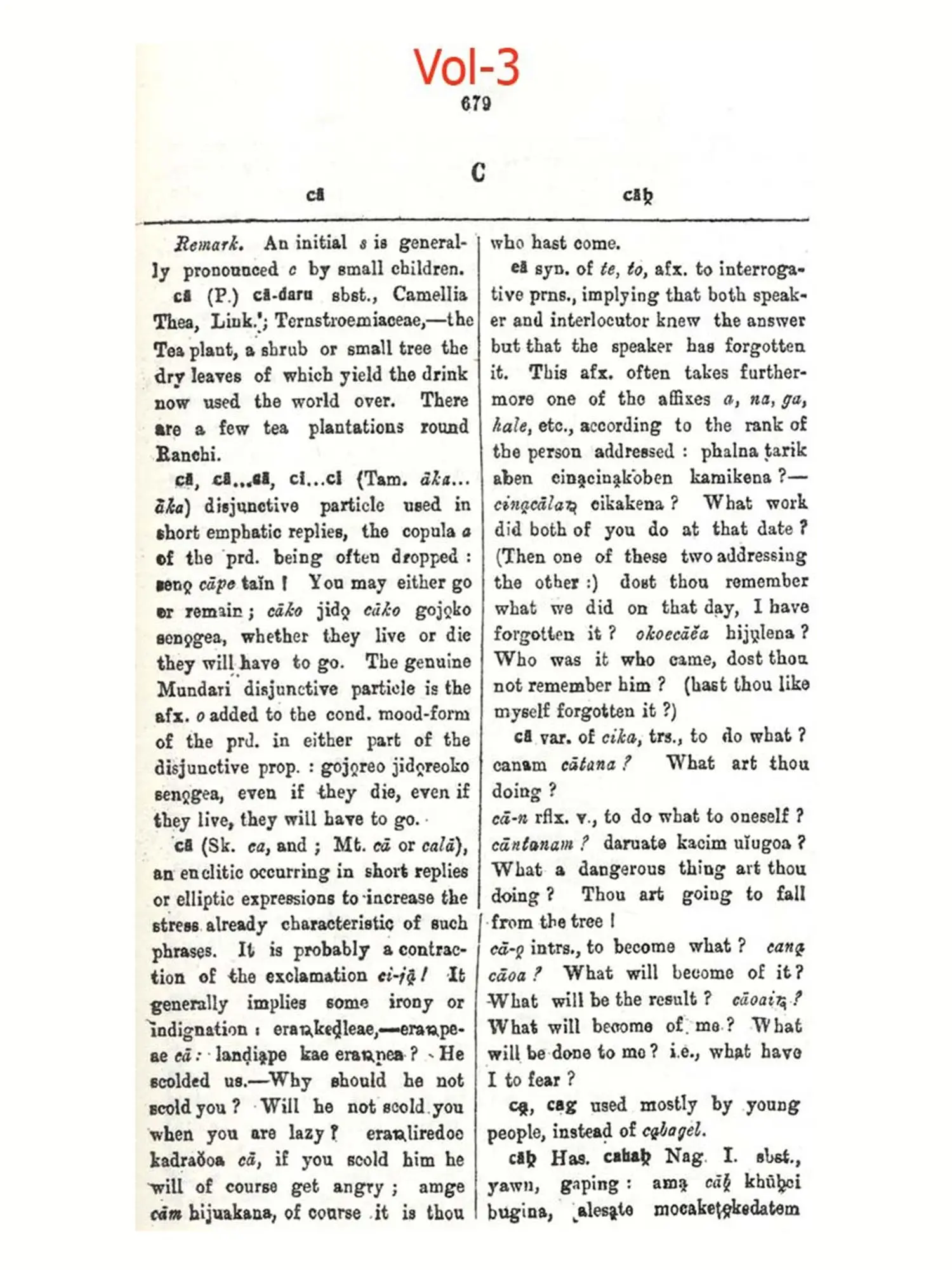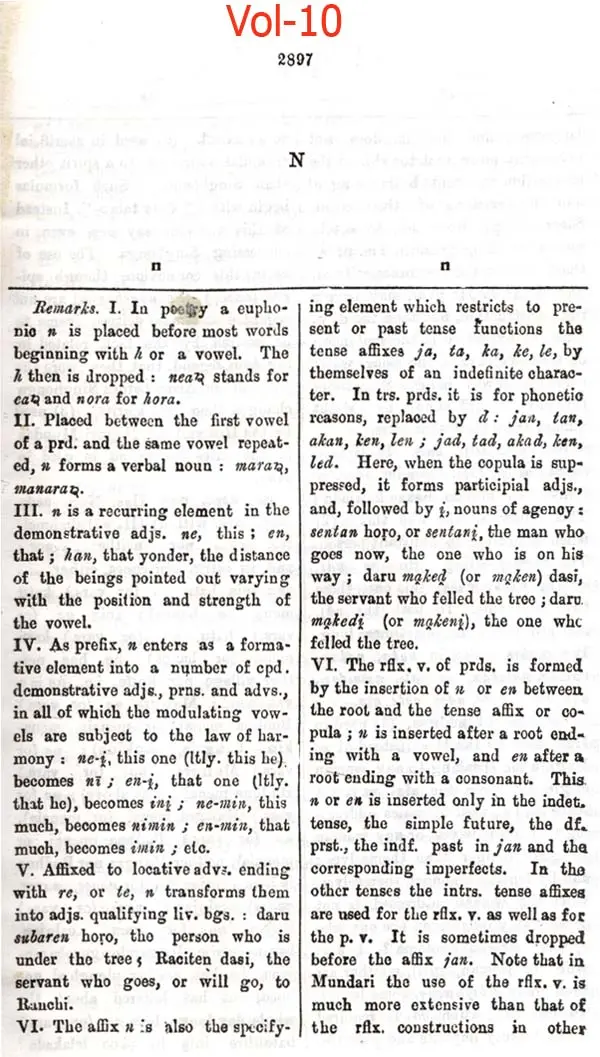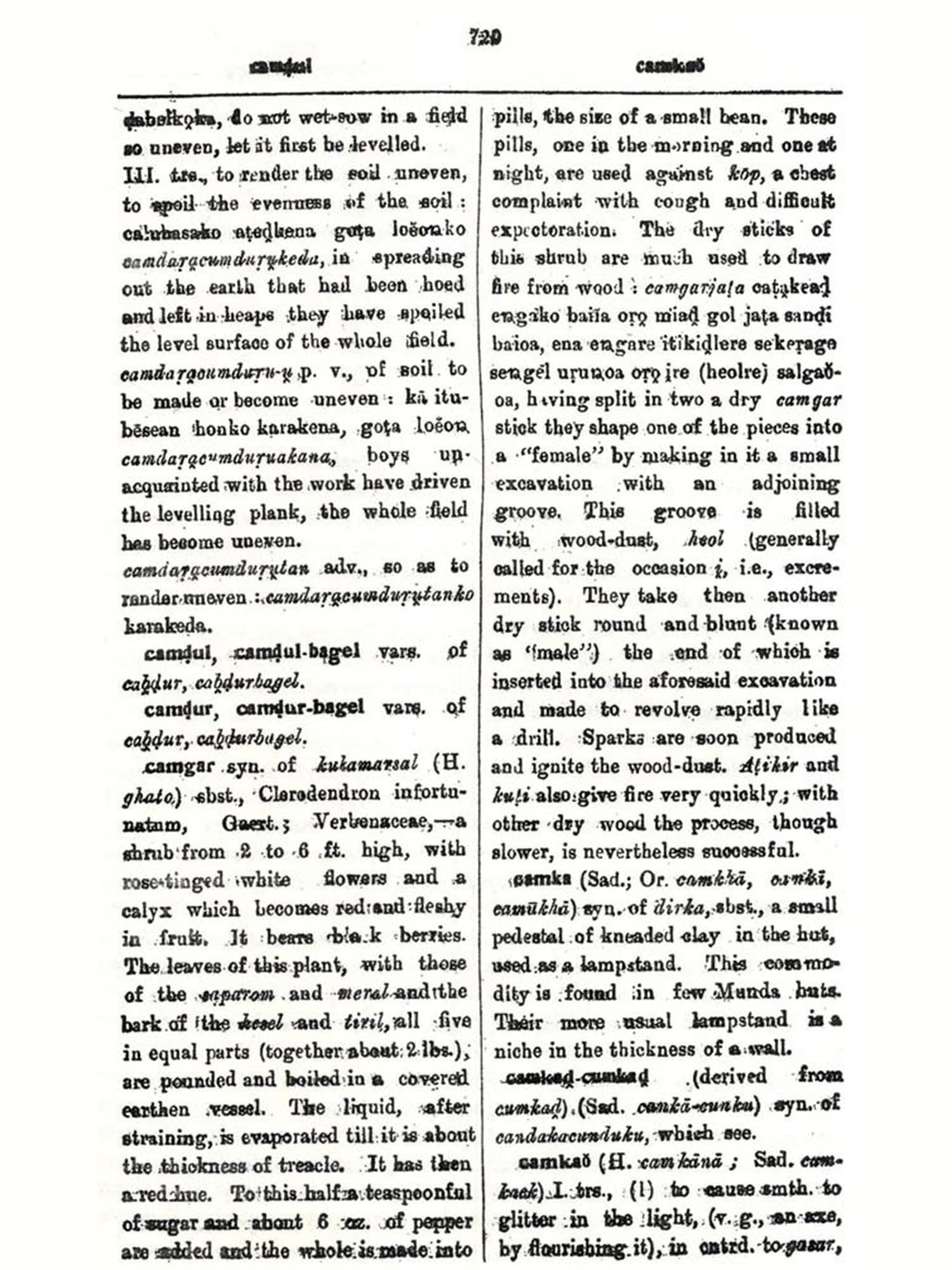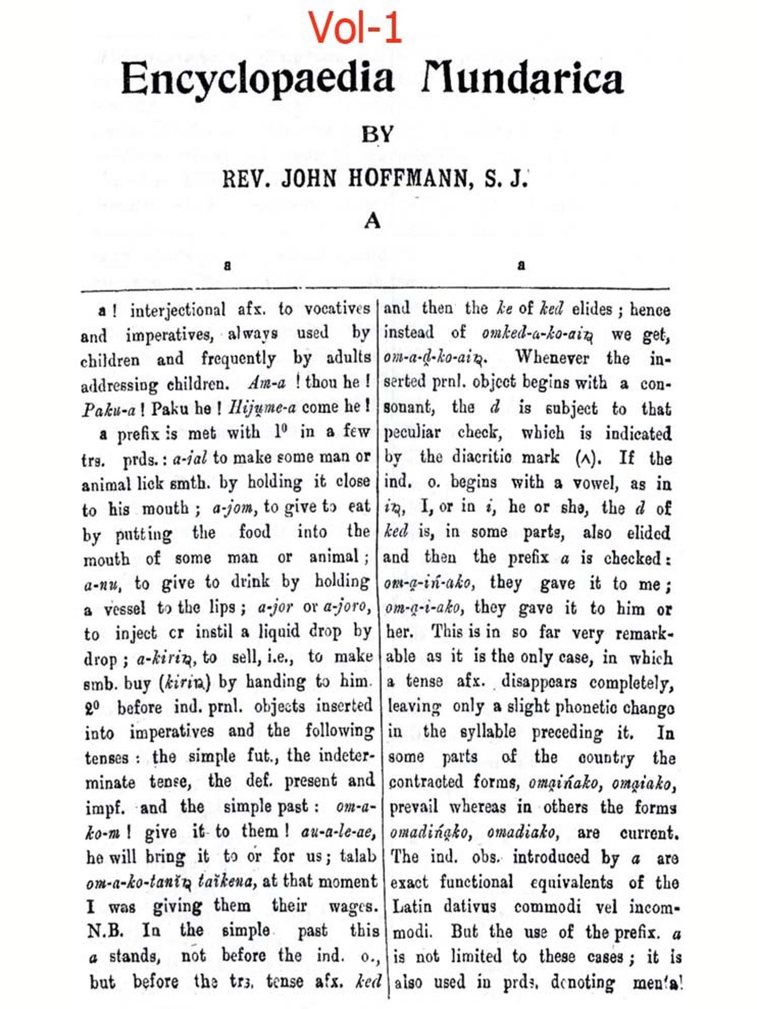 The Encyclopaedia Mundarica records all the pure Mundari words and those borrowed from neighbouring languages and presents the etymology, different shades of meaning in usage, syntactical and grammatical peculiarities of those words and their relation to various cultural and religious concepts. It also contains lists and descriptions of flora, especially edible, medicinal and poisonous plants and their properties, with their Mundari names. Well-written articles on the economic, social, moral and religious life of the Mundas is another salient feature of this work.