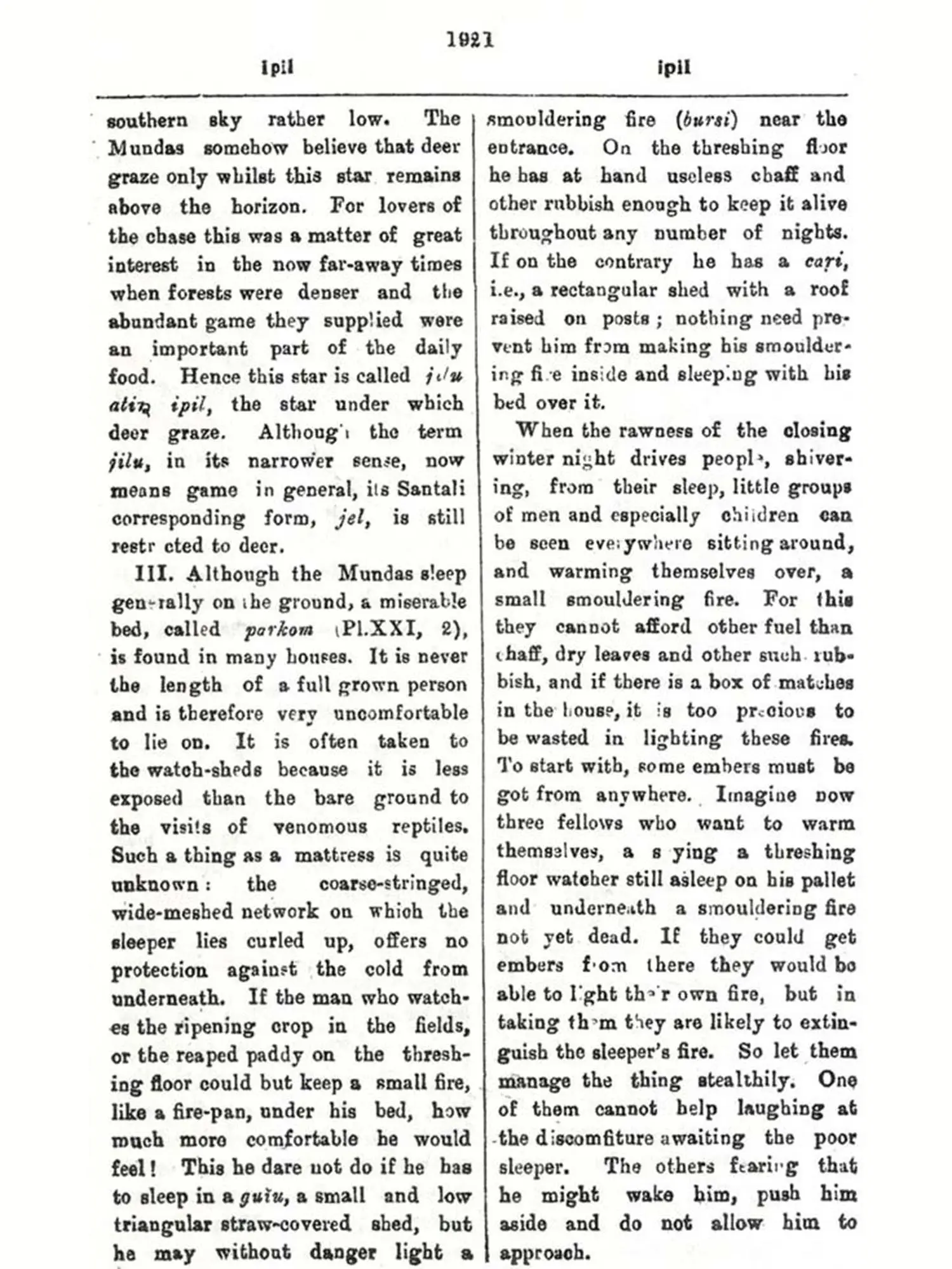 The compilers have taken due notice of the Mundari poetry, music and dances. There are very exact drawings of all that the Mundas possess and use in the shape of implements, furniture and dwellings. It is an authentic account of the Munda land of its people and their customs.