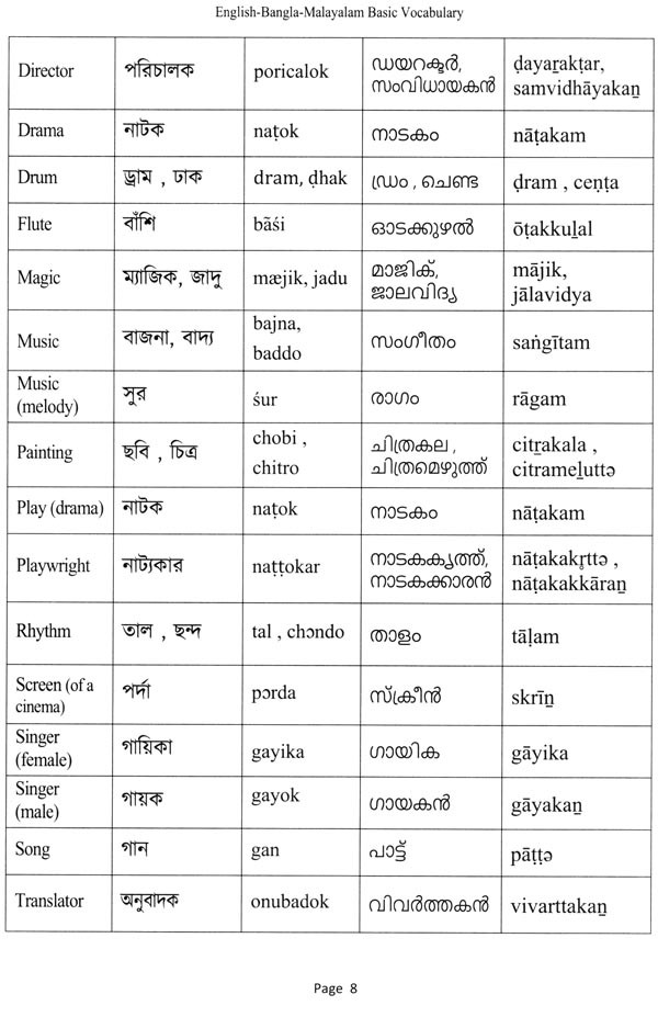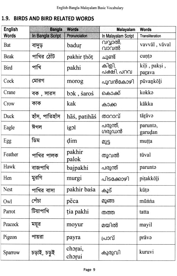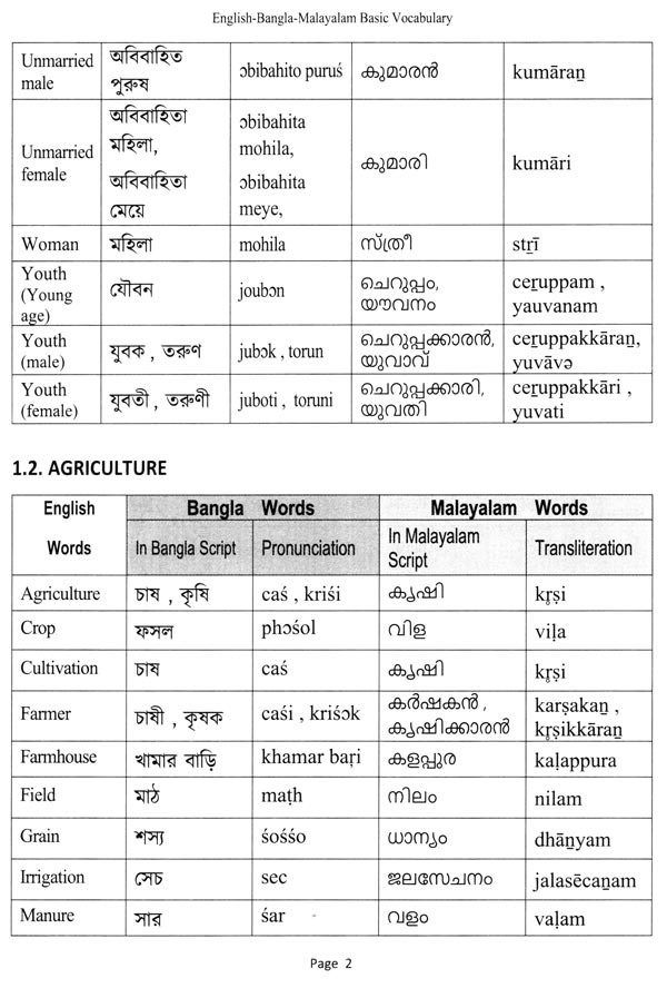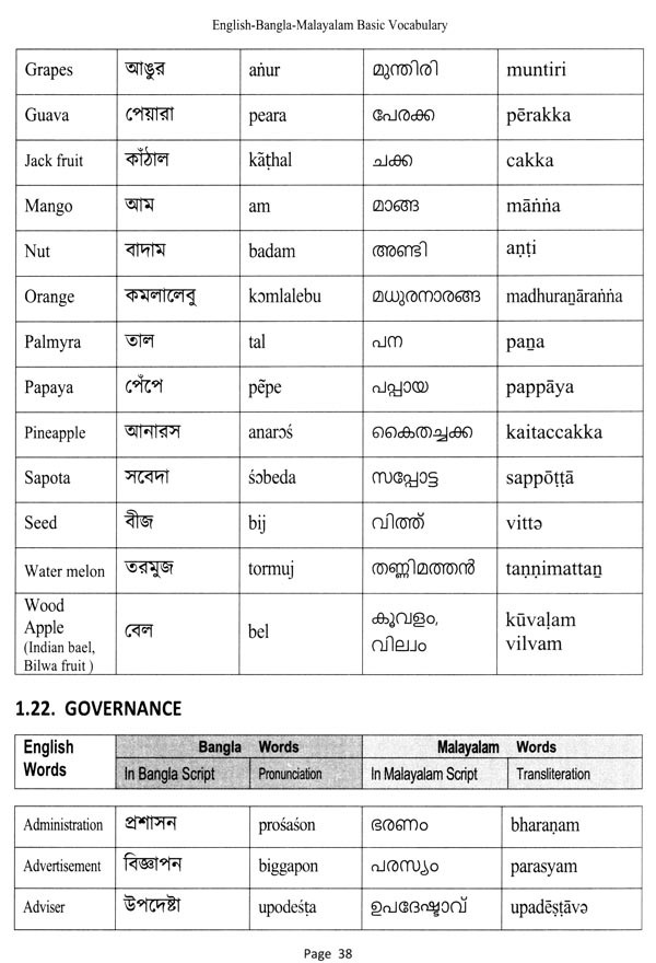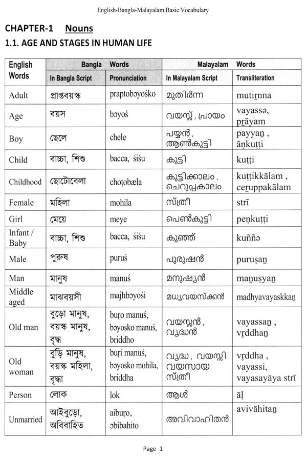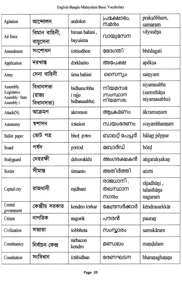 The words are arranged in English alphabetical order so that the non-native learners can find it easily. This book is in tabular format with total five columns. For the easy understanding of non-native learners, the first column contains the English words. In the second column the Bengali words are given in Bengali script. In the third column the pronunciations of the Bengali words are transliterated in roman script with diacritic marks. The corresponding Malayalam words are given in Malayalam script in the fourth column. The pronunciations of the Malayalam words are transliterated in roman script with diacritic marks and are entered in the fifth column.